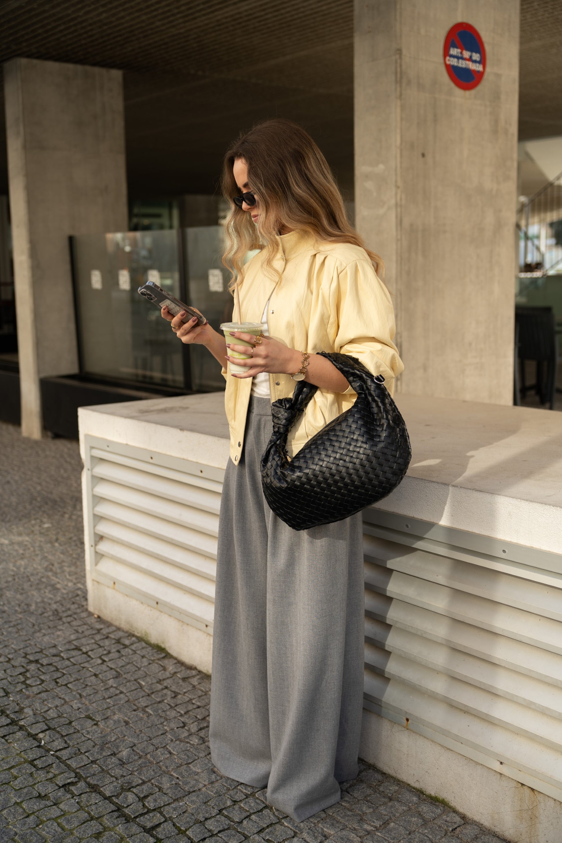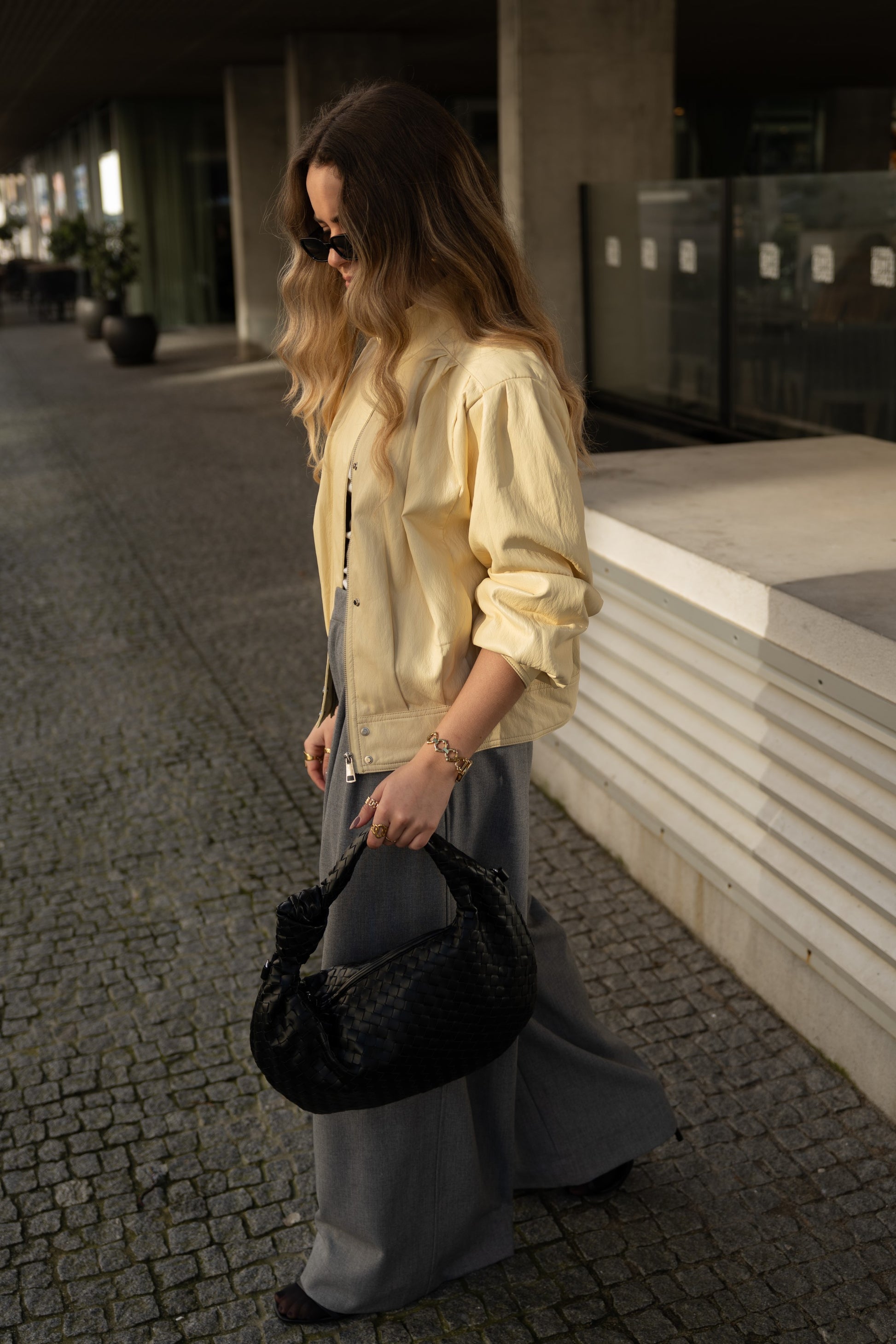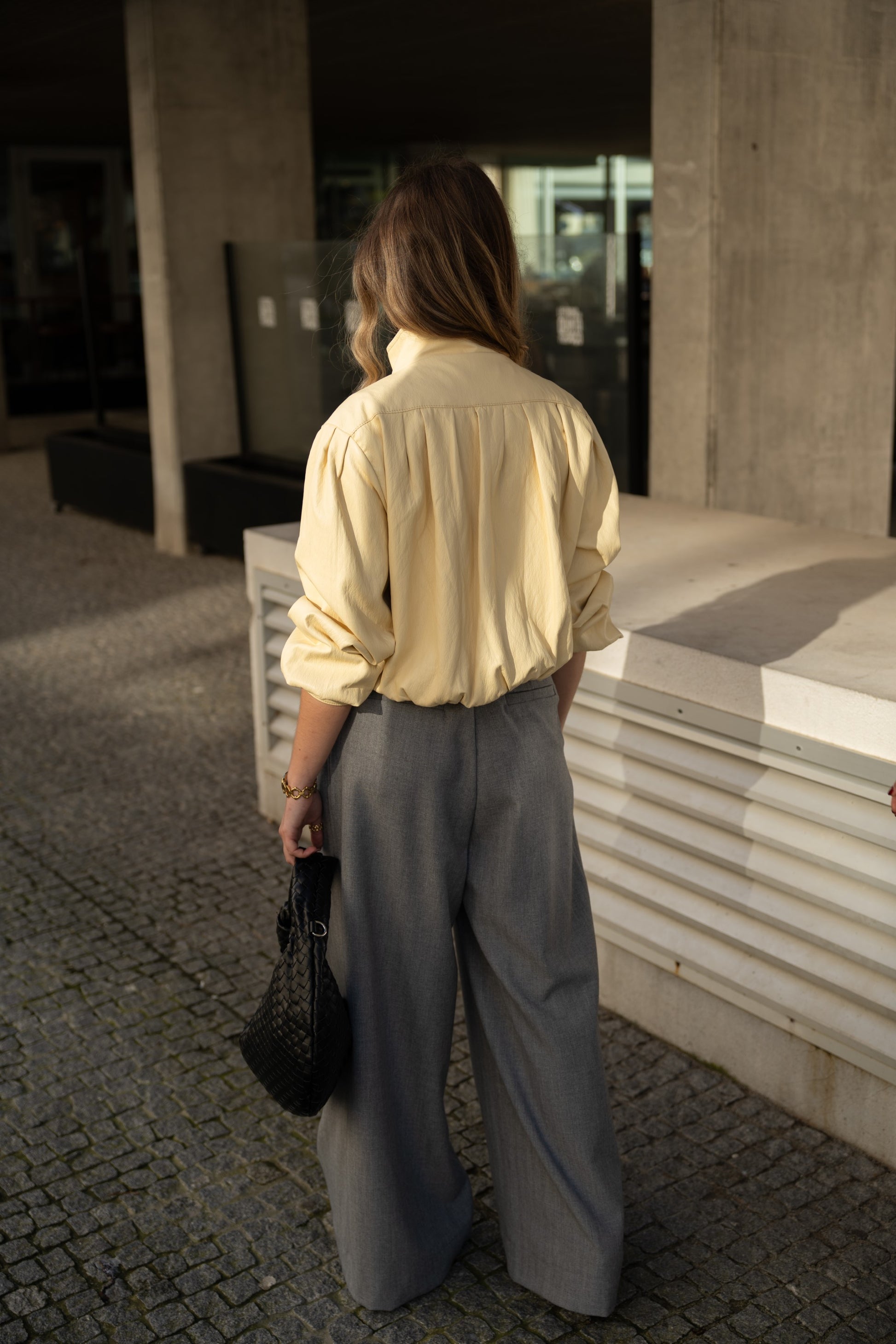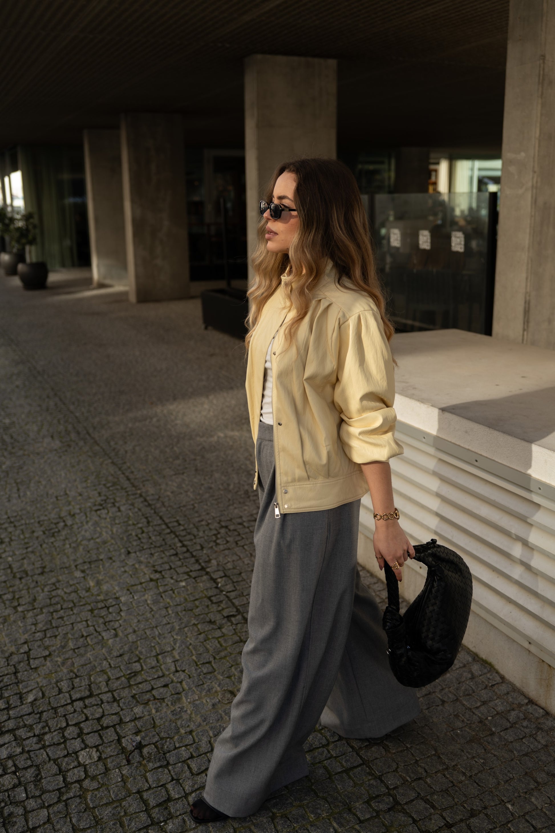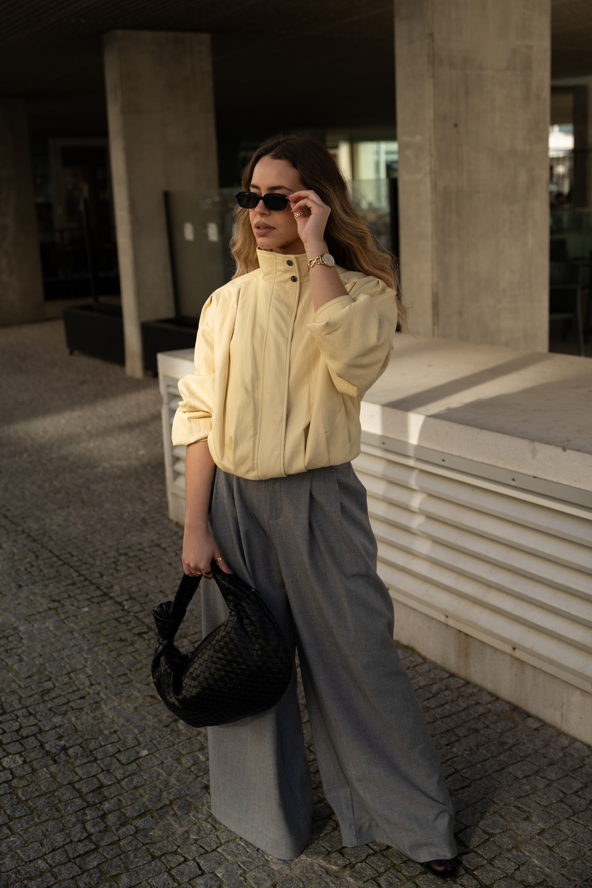 Szare, dopasowane spodnie z szerokimi nogawkami