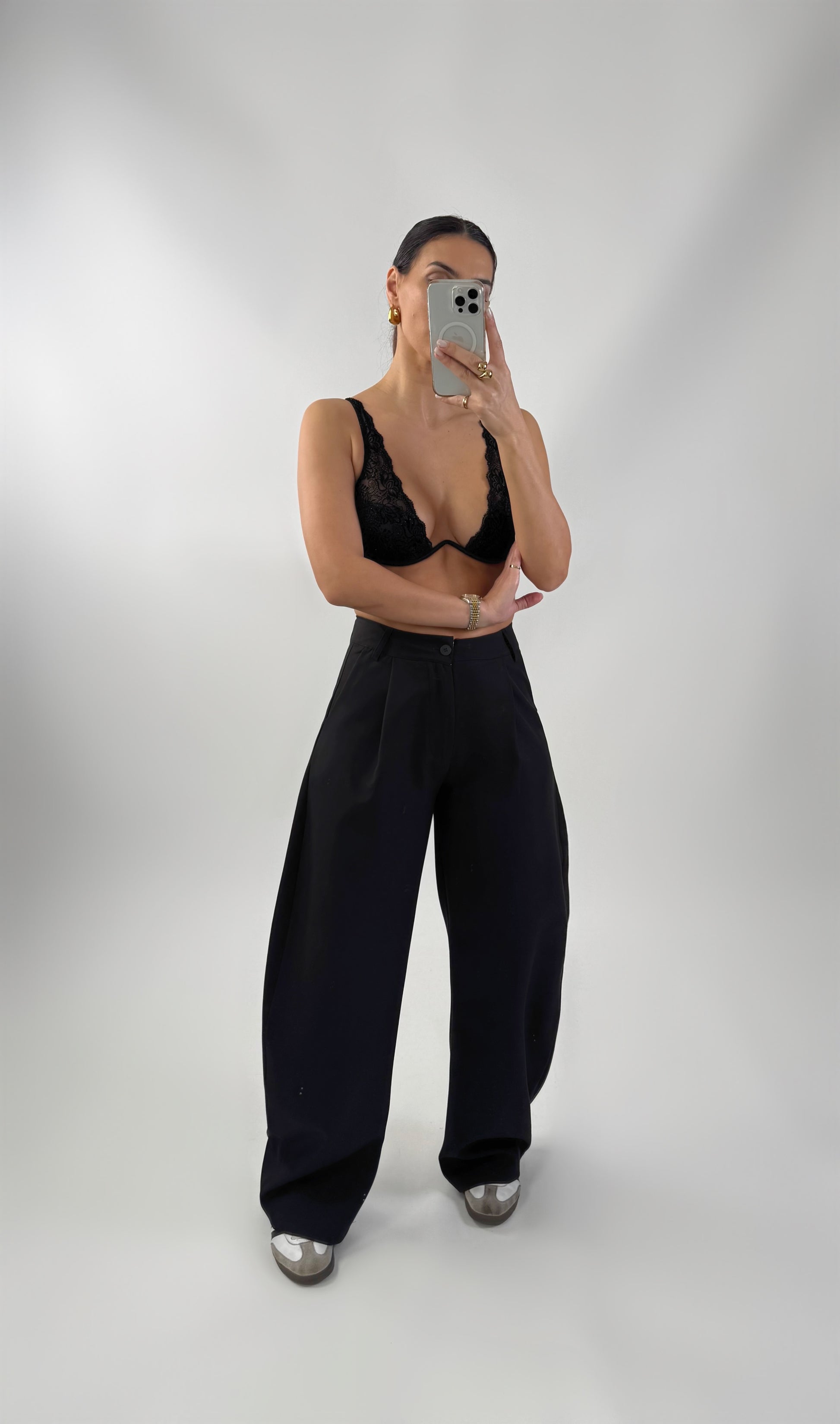 Pantalony z luźnej tkaniny. Talia ma efekt bokserki, zapinana jest na guzik i zamek błyskawiczny. Talia jest wysoka, posiada szlufki i kieszenie. Oficjalna marka Lumina