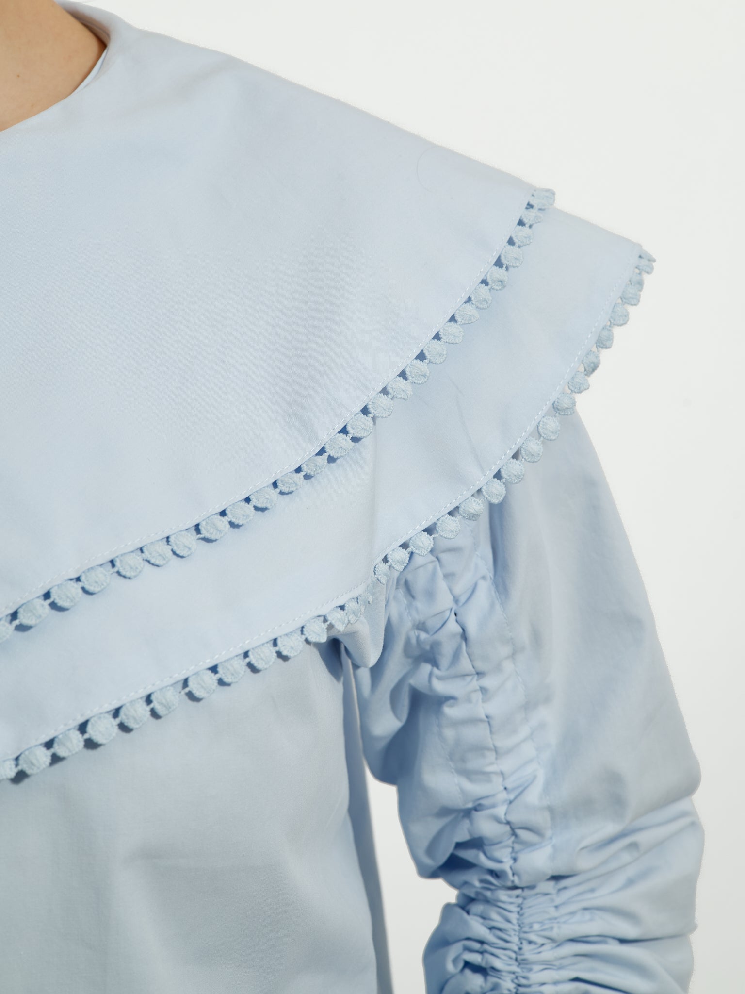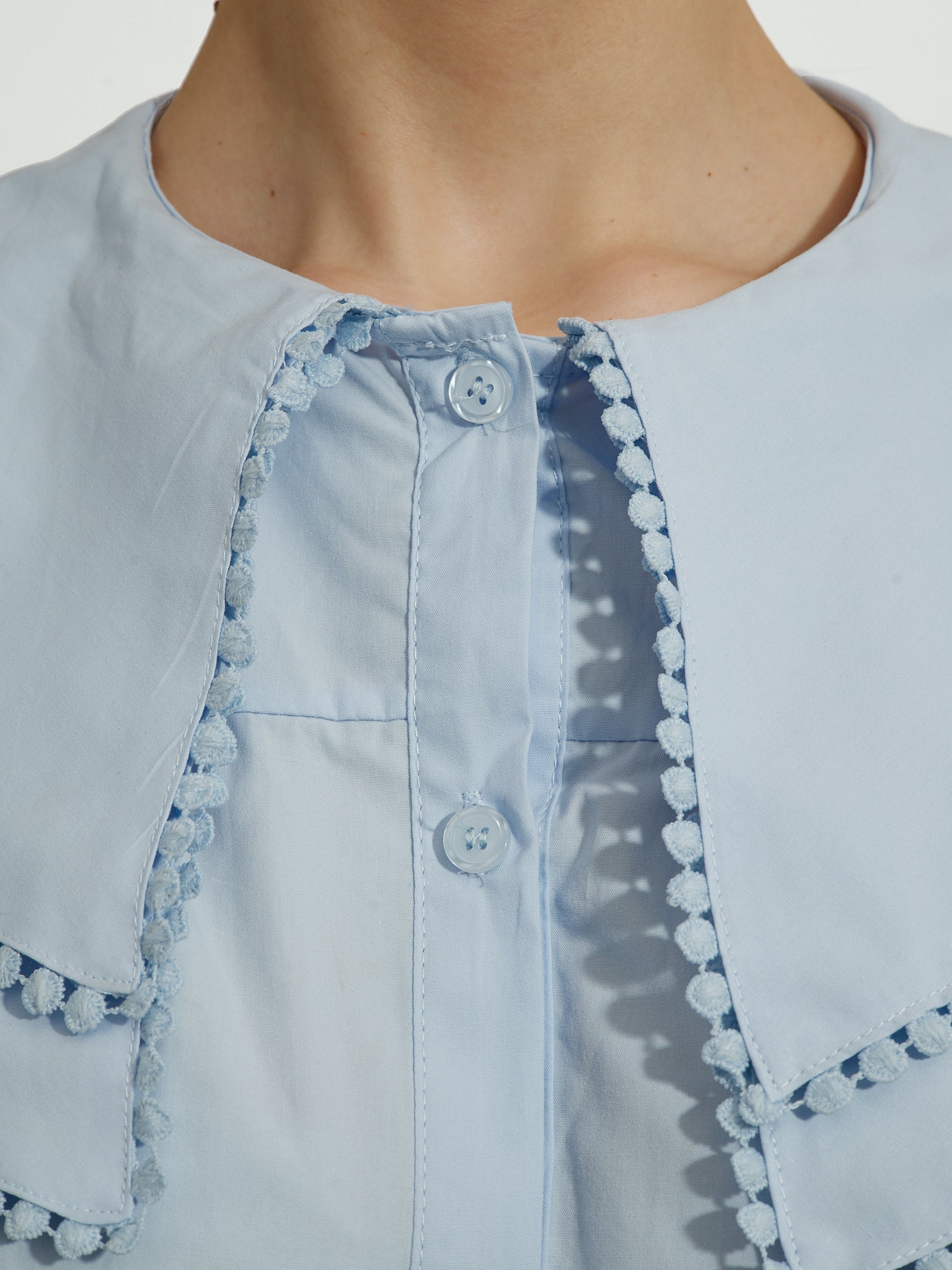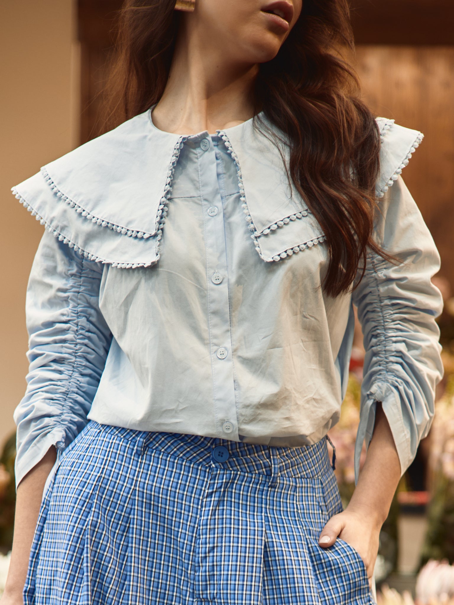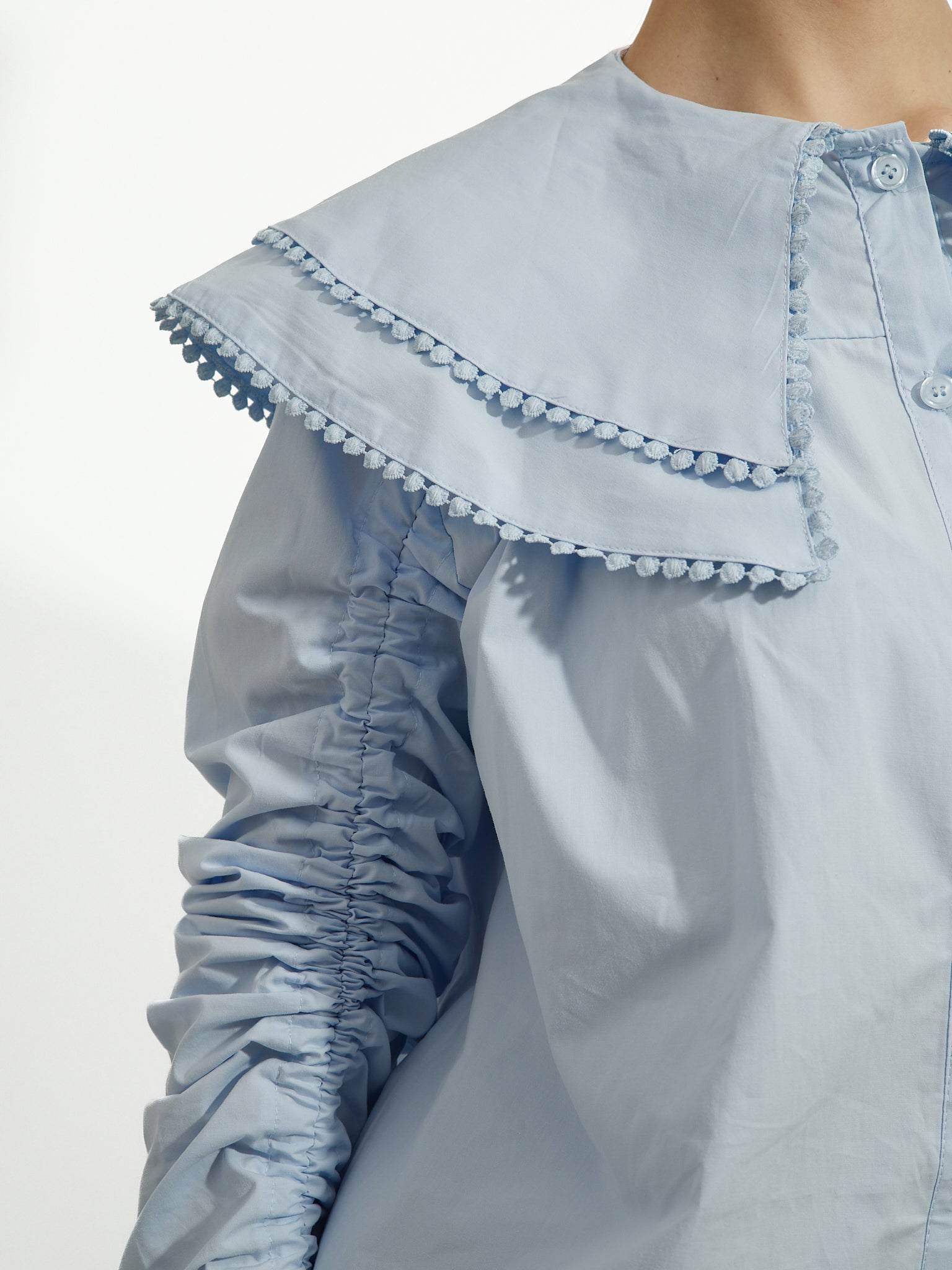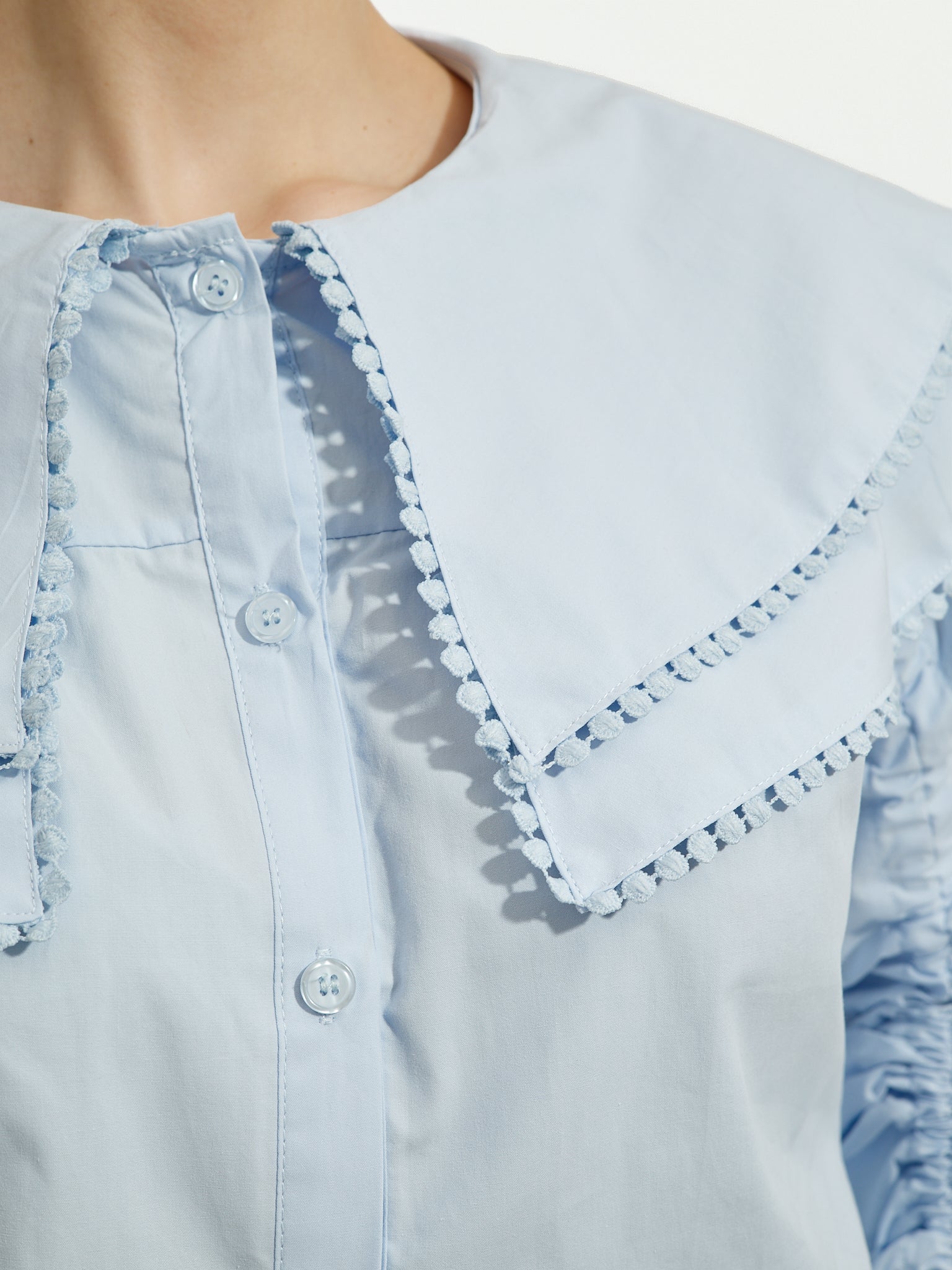 Pastelowoniebieska koszula o luźnym kroju, z długimi rękawami z regulowanym marszczeniem i zapięciem na guziki z przodu. Posiada obszerny kołnierzyk z ozdobnym detalem. Pasuje na... S do L.