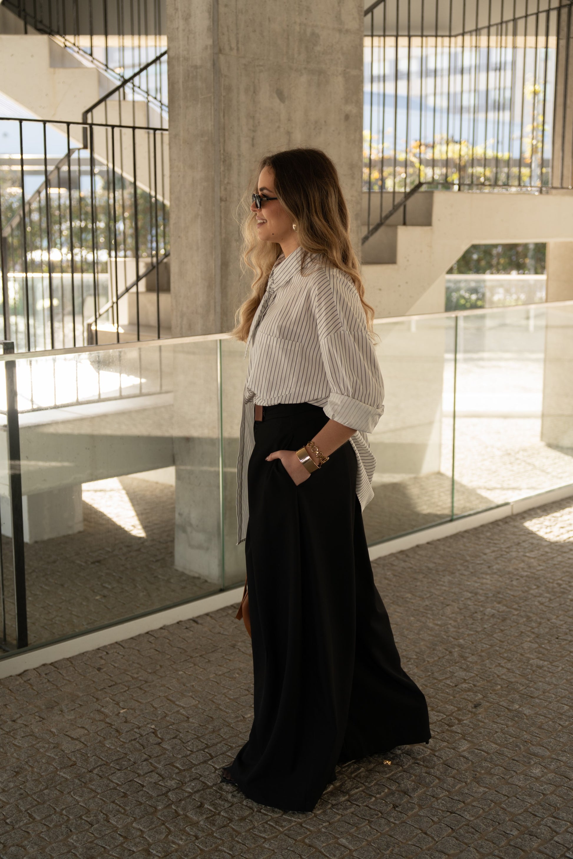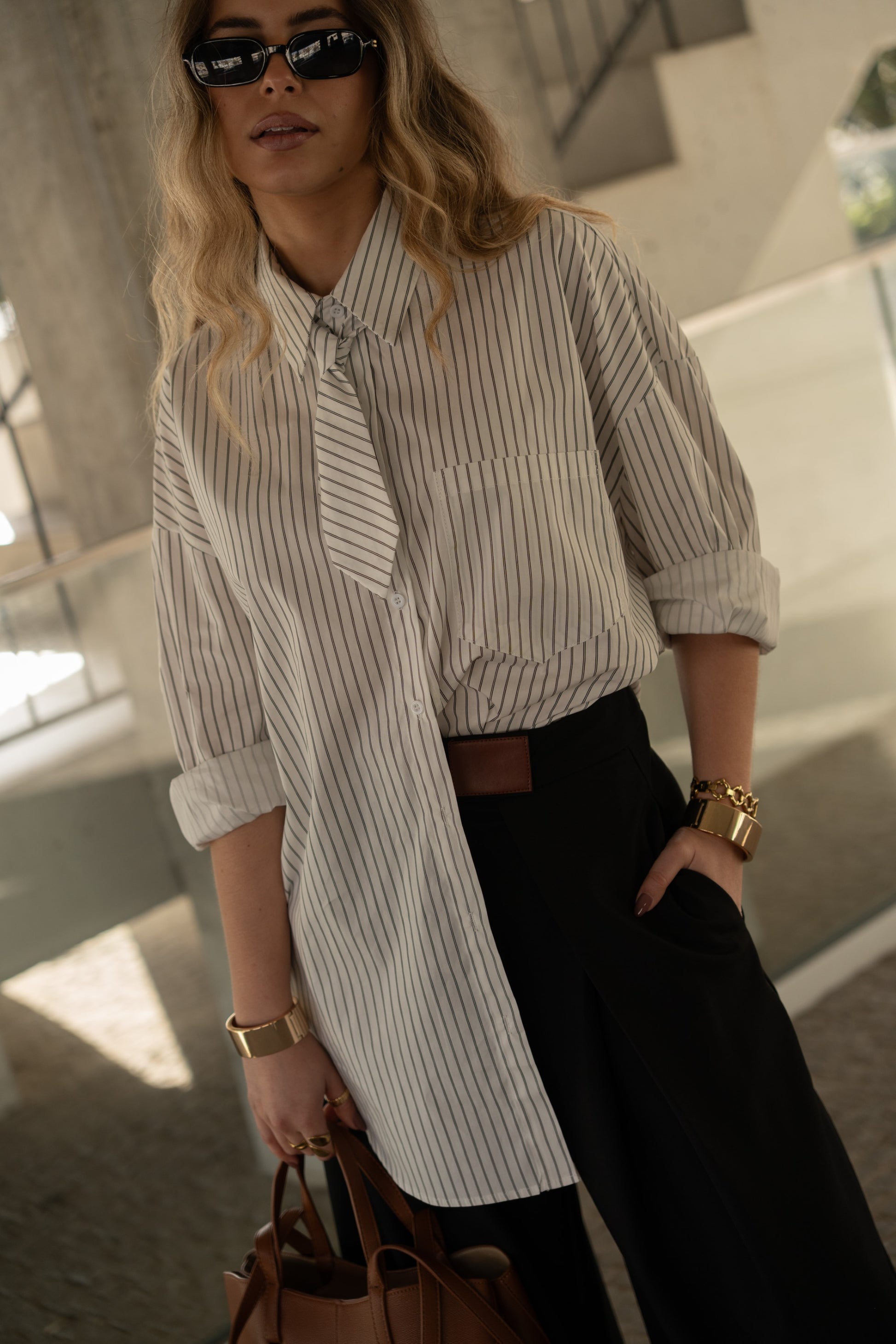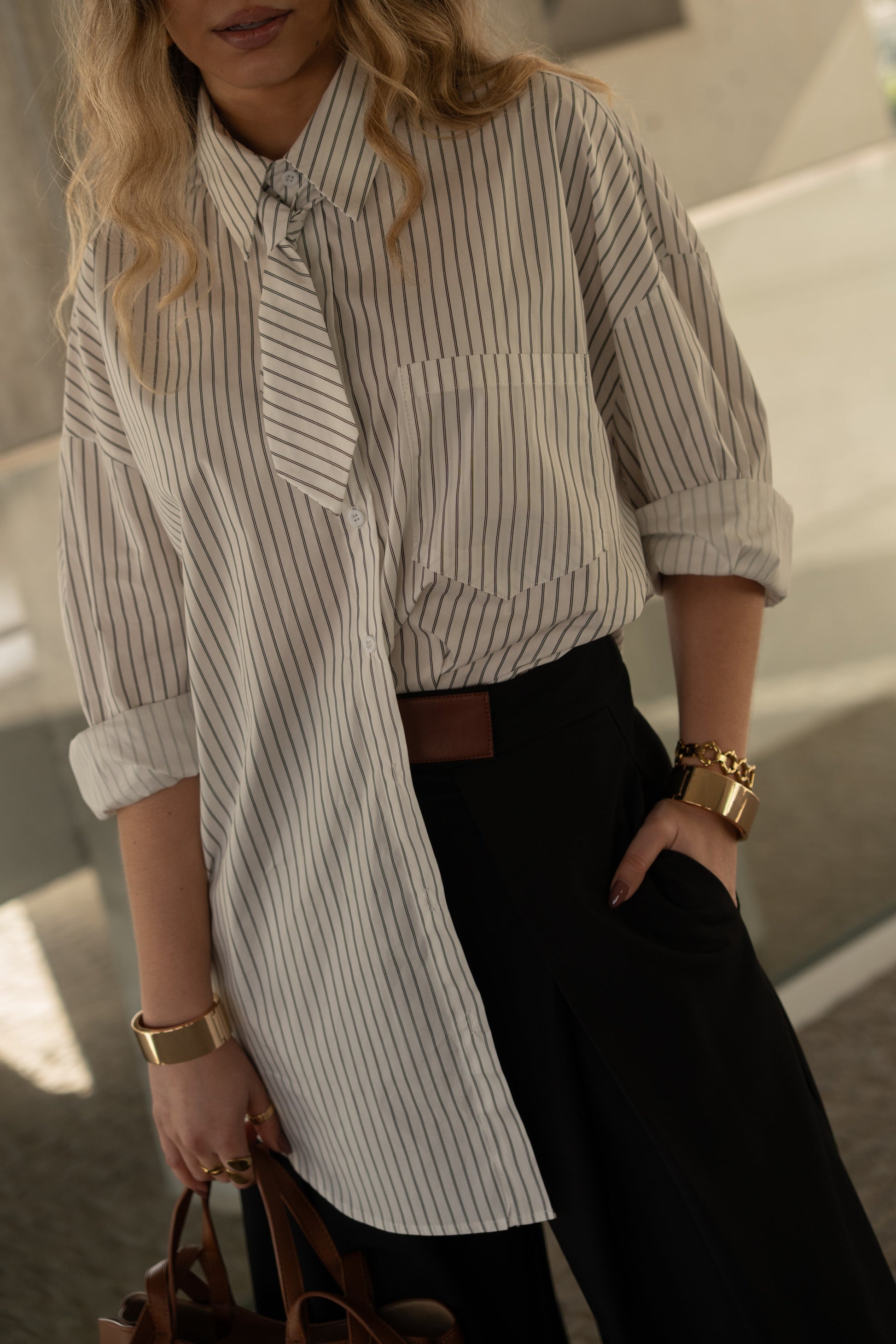 Biała, oversize'owa koszula w czarne paski. Zapinana na guziki. W komplecie odpinany krawat. Pasuje od S do XL.