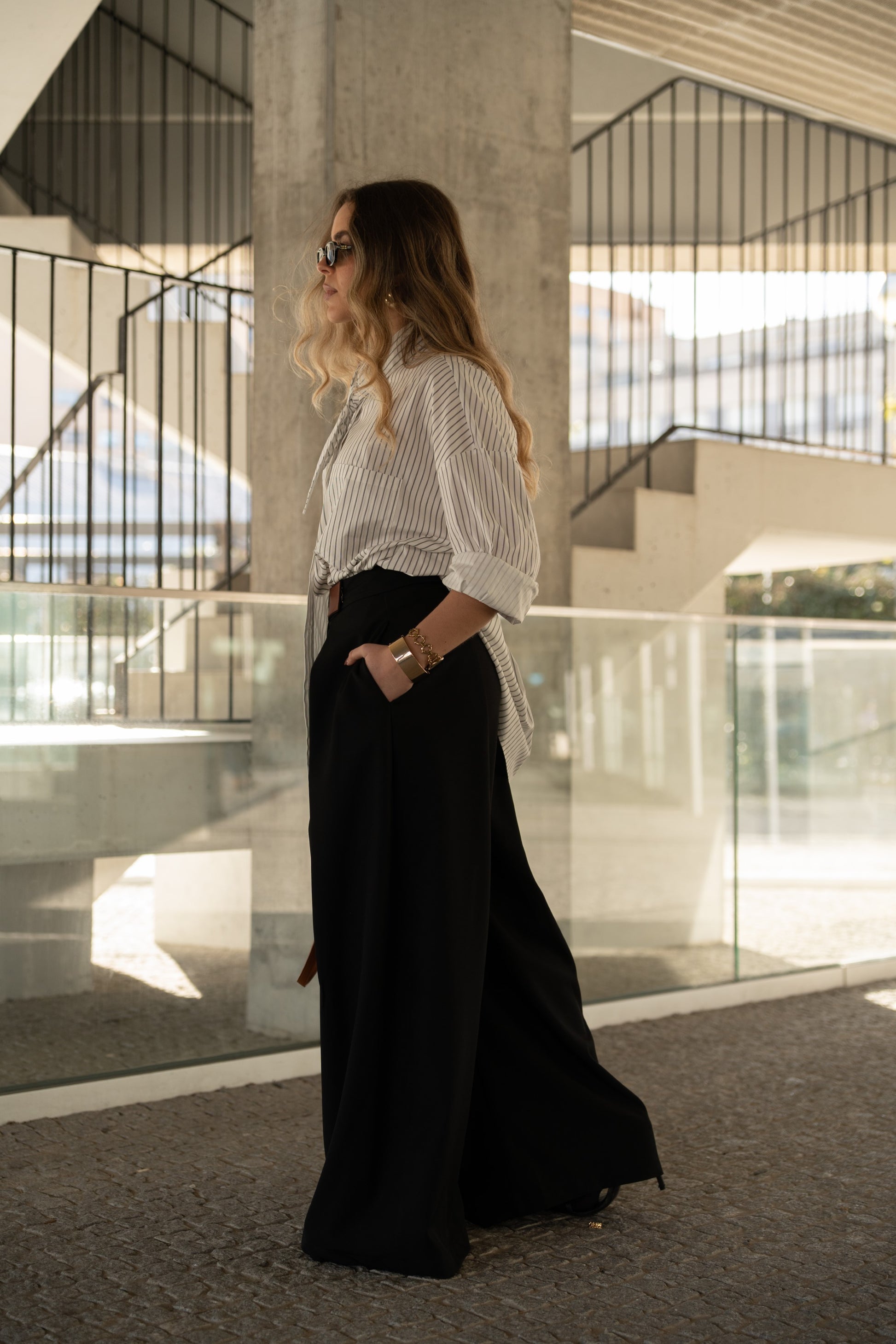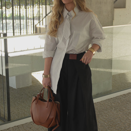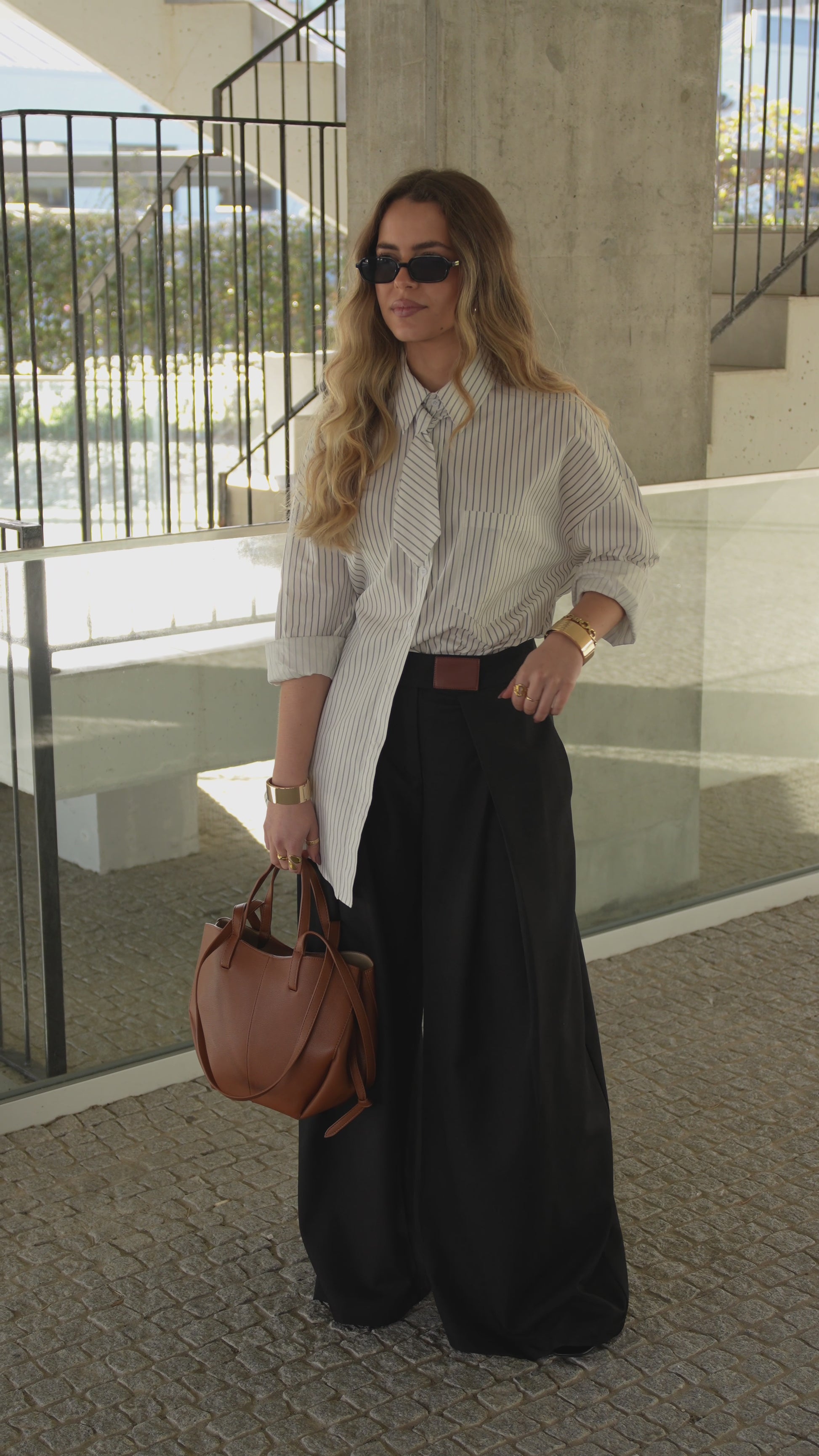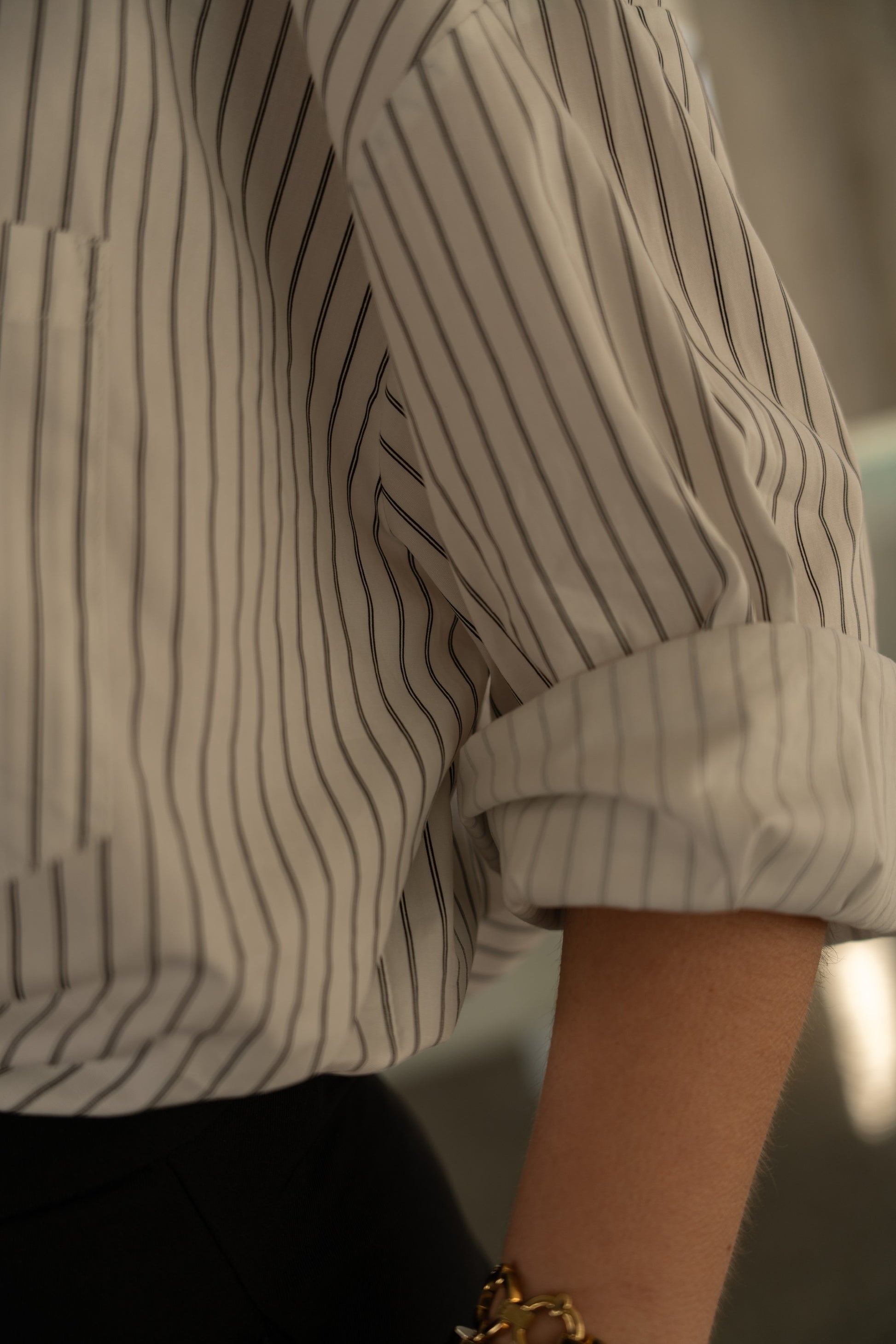 Biała, oversize'owa koszula w czarne paski. Zapinana na guziki. W komplecie odpinany krawat. Pasuje od S do XL.