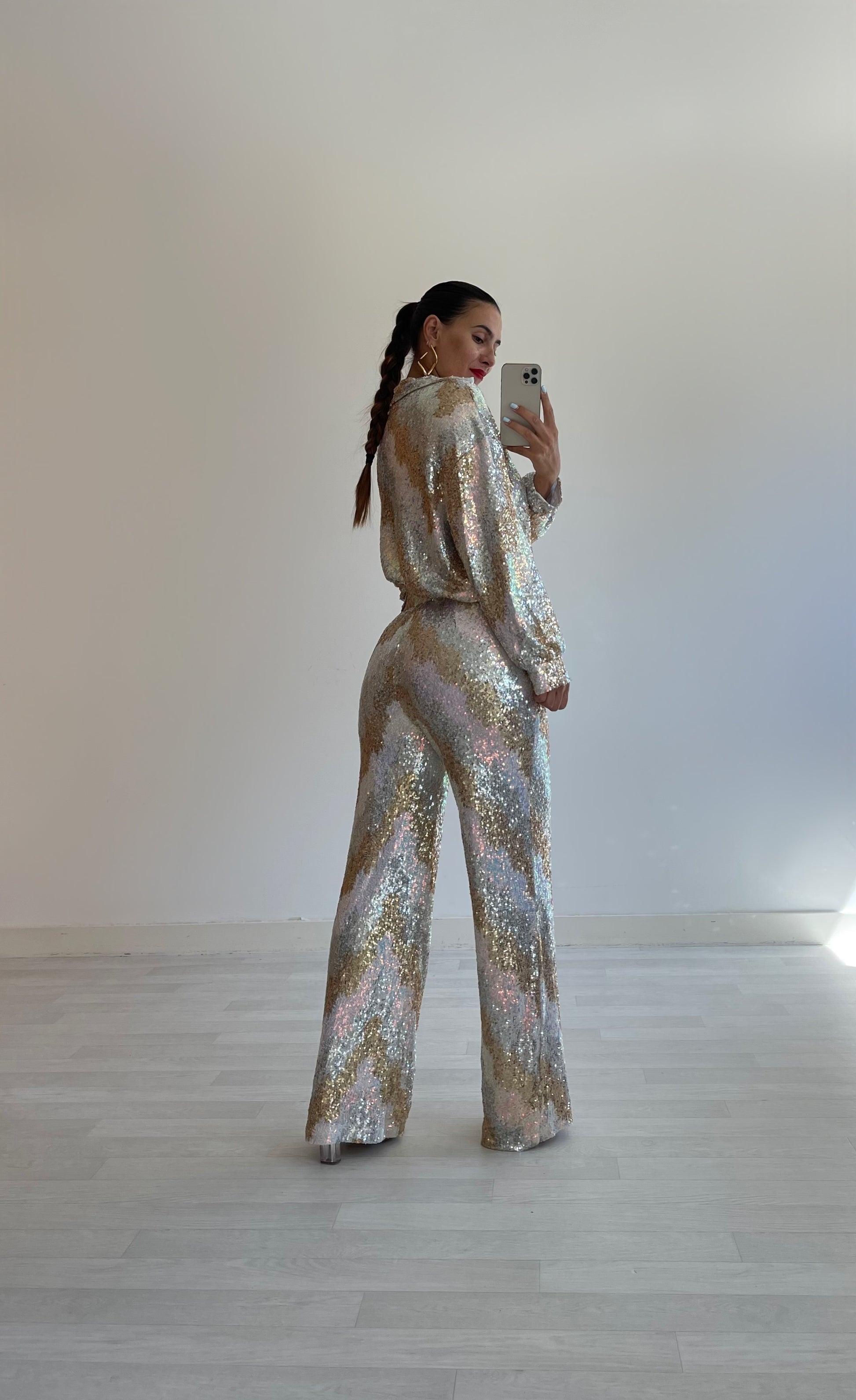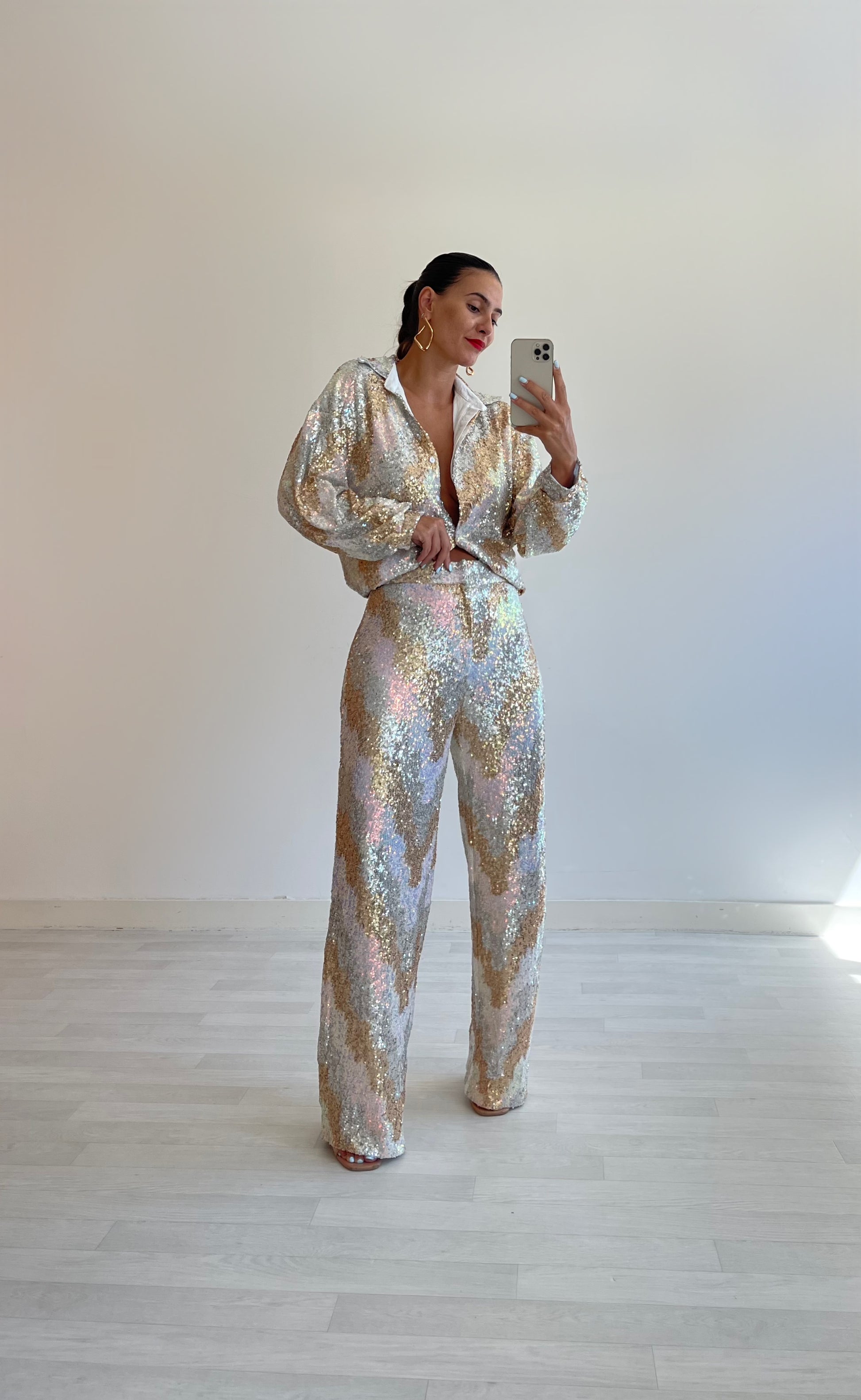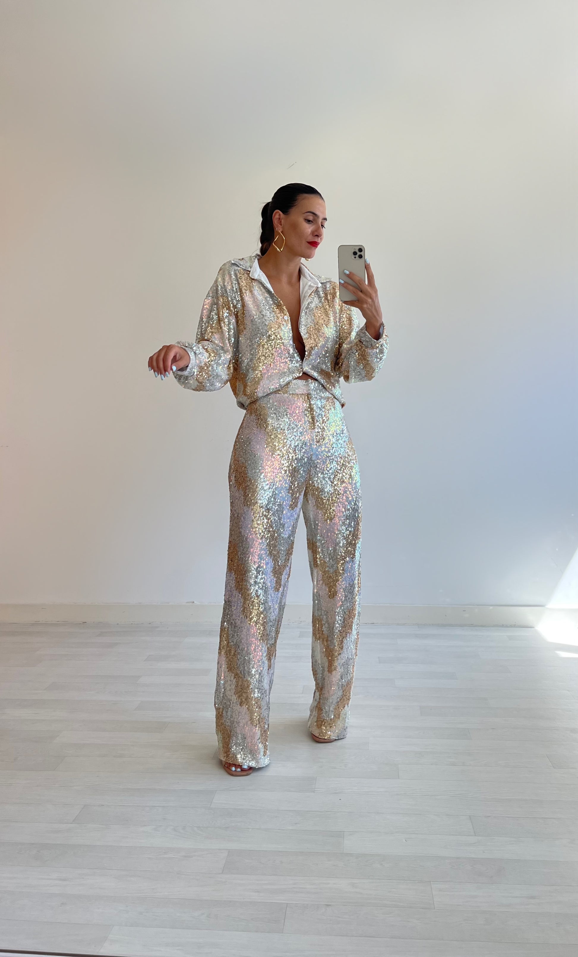 Koszula w 100% z cekinami na podszewce. Zapinana na guzik z przodu i przy mankietach.