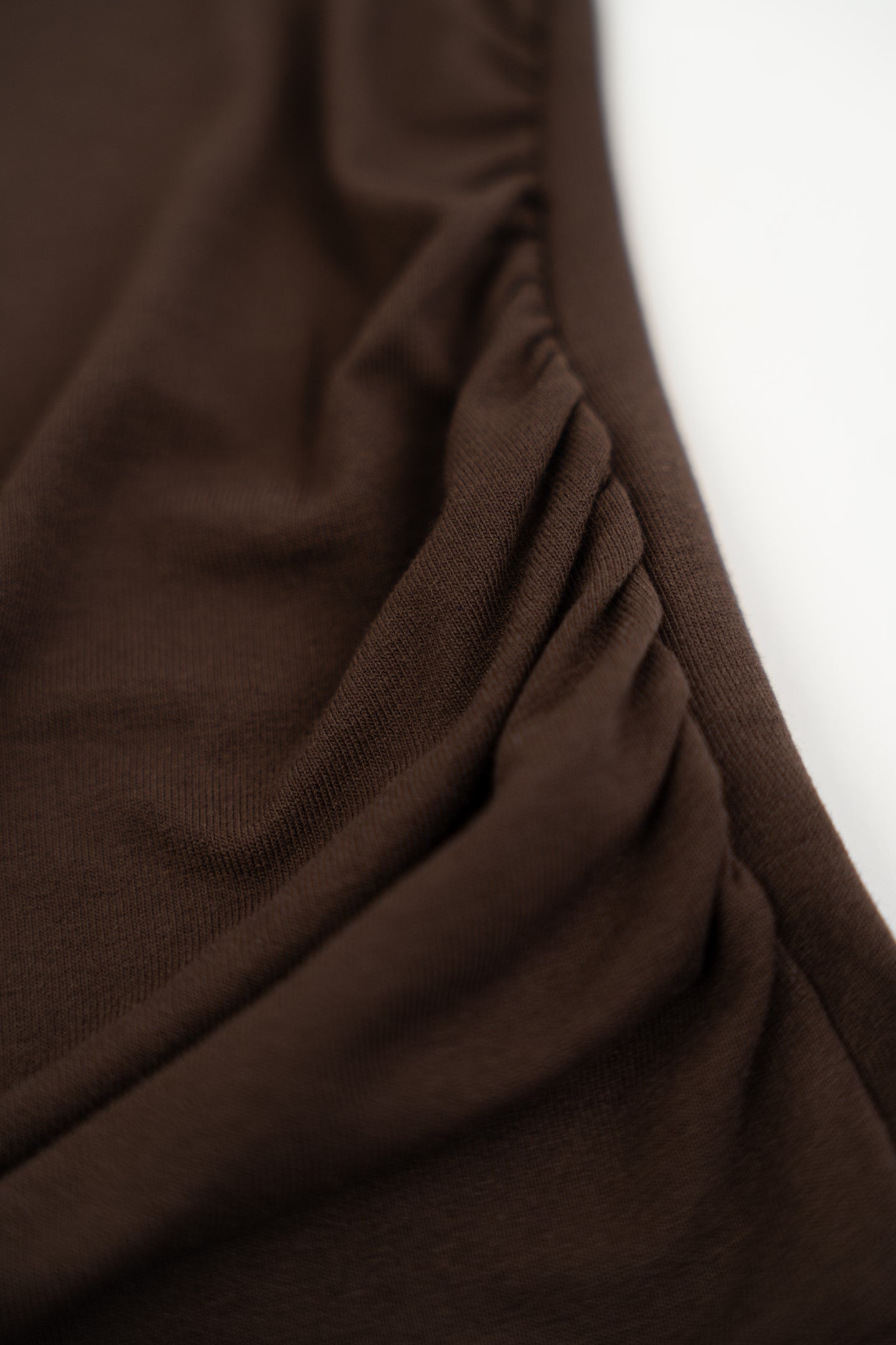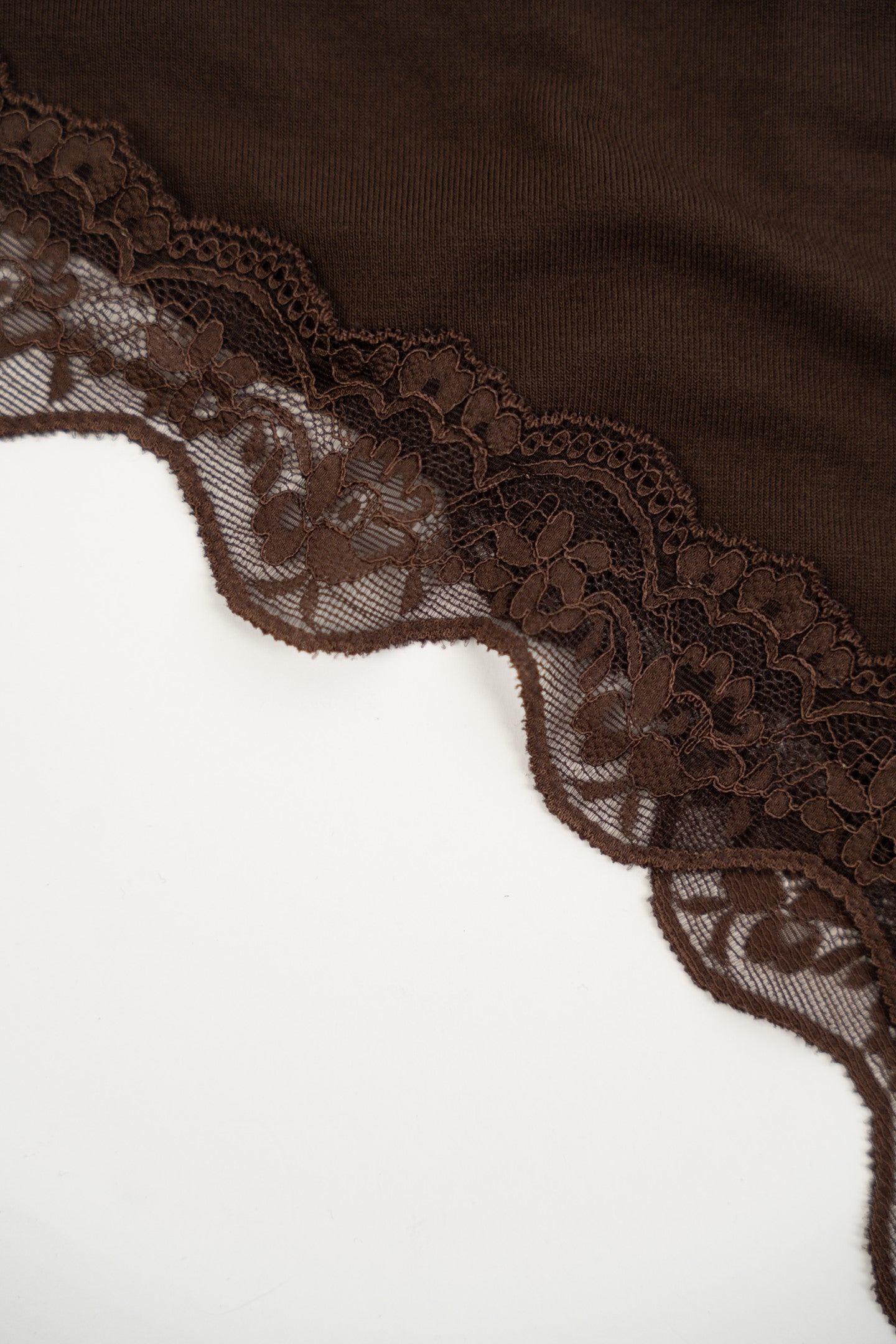 Czekoladowa koszulka z koronkowymi zdobieniami.