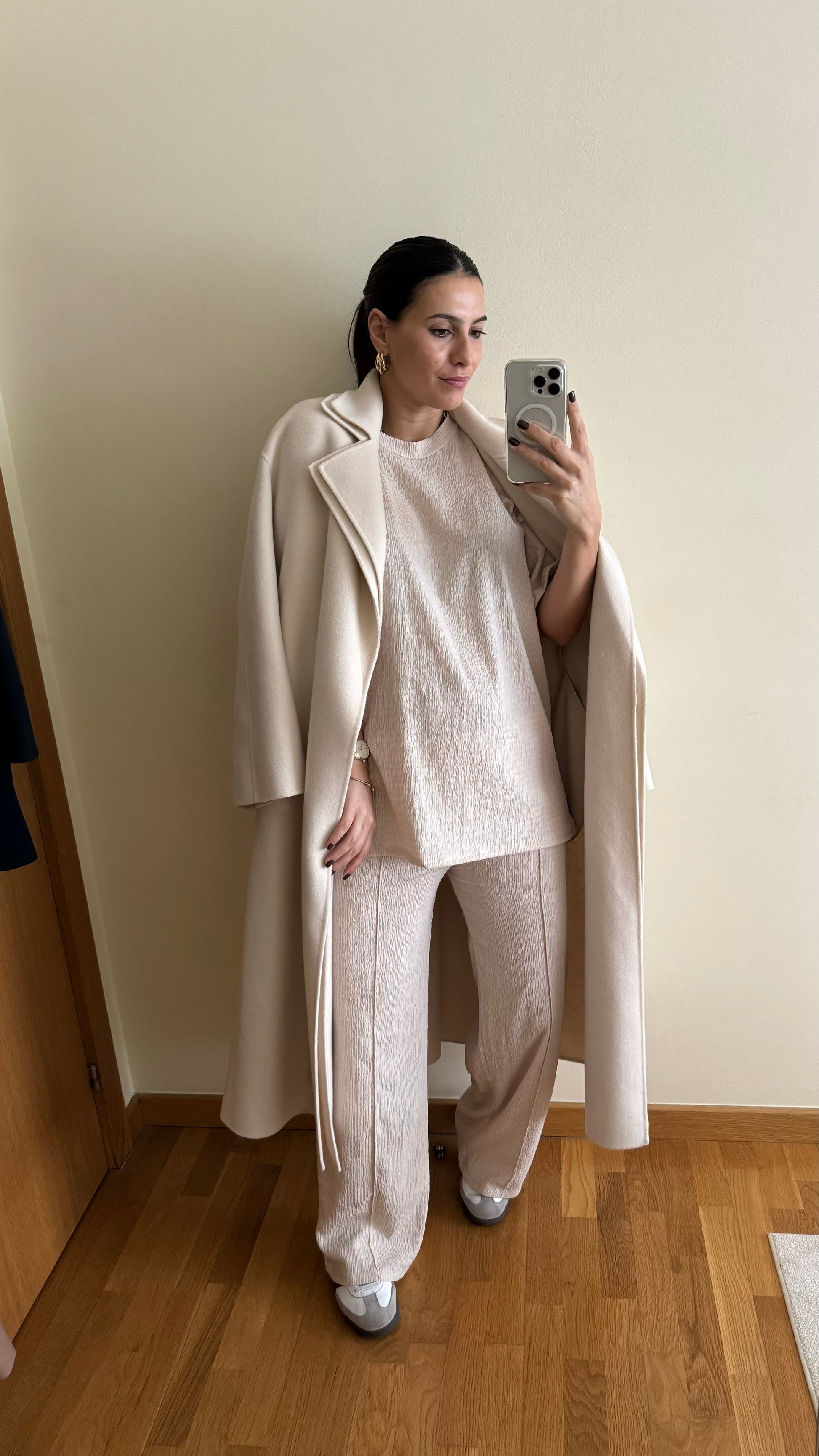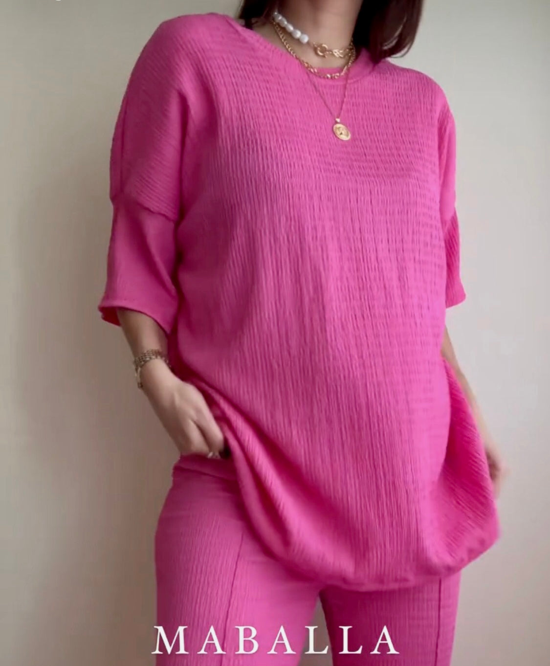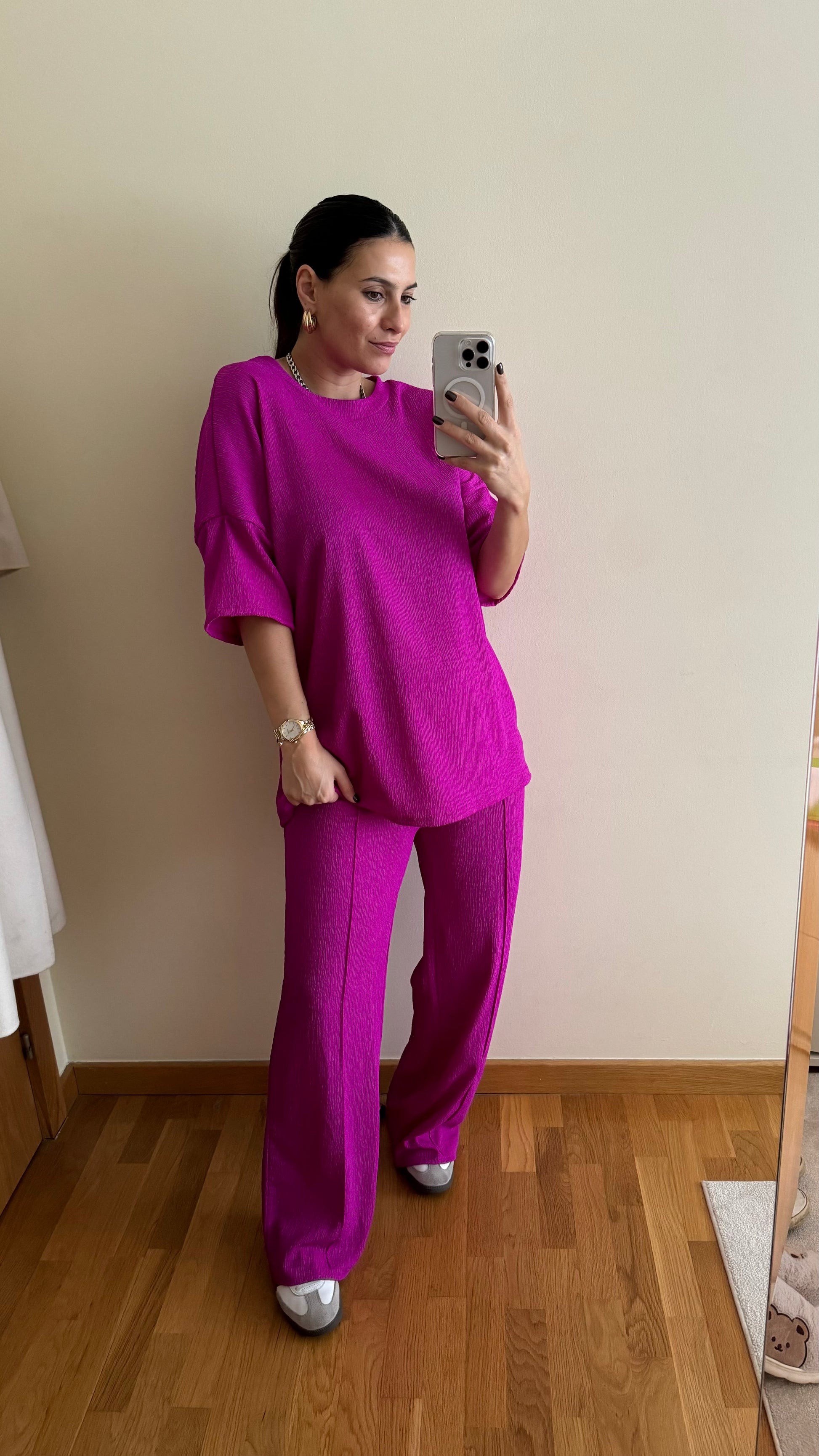 Komplet składający się ze spodni z szerokimi nogawkami i t-shirtu oversize. Spodnie z gumką w pasie. Tkanina miękka w dotyku i bardzo wygodna. Idealny na każdą okazję.