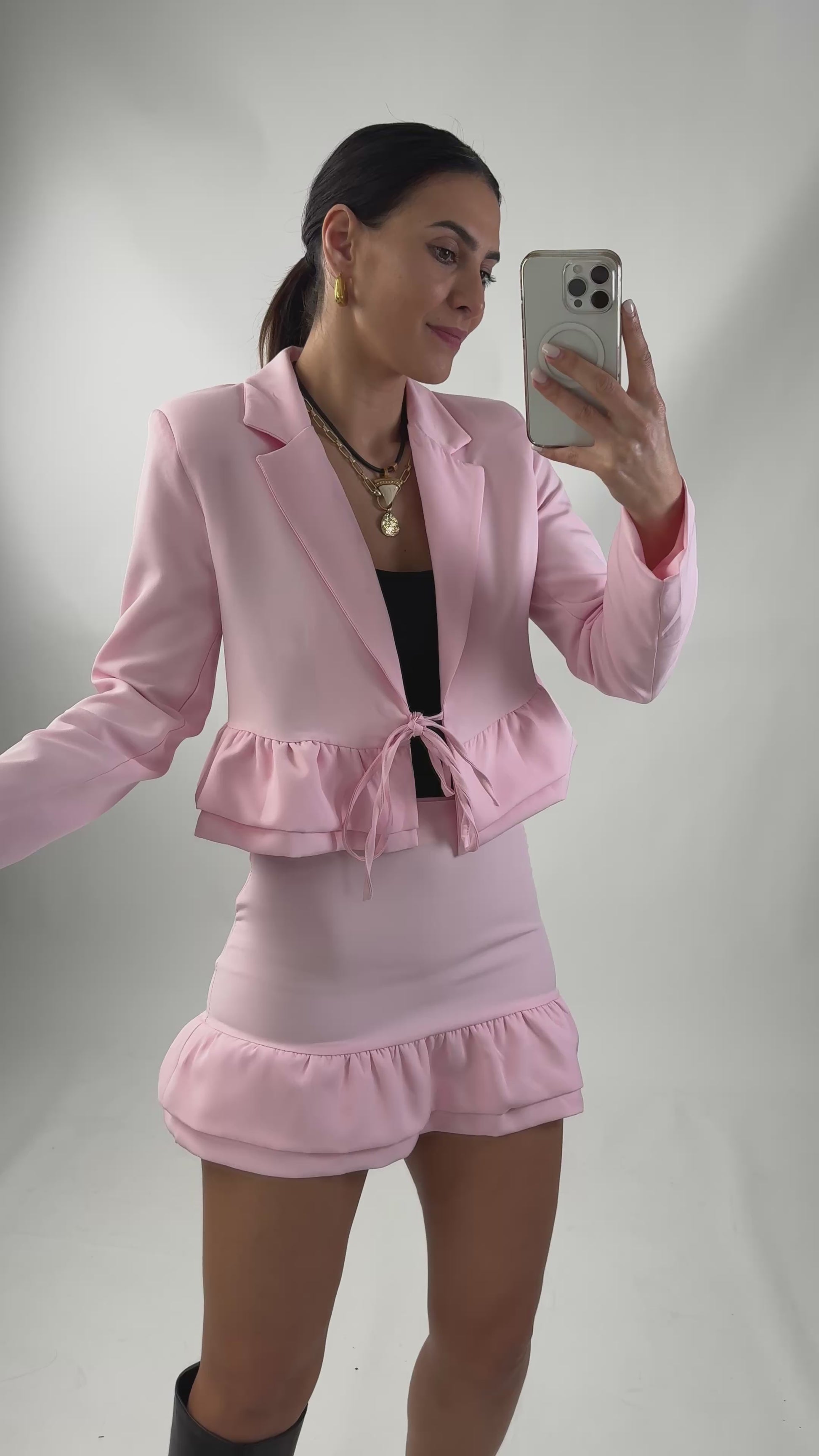 Komplet garniturowy składający się ze spódnicy i żakietu/bolerka. Płaszcz jest podszyty, ma poduszki na ramionach i jest zapinany na wstążkę z tego samego materiału. Spódnica ma długość szortów i zapinana jest na niewidoczny zamek błyskawiczny z boku. Jest to rozmiar uniwersalny S do L.