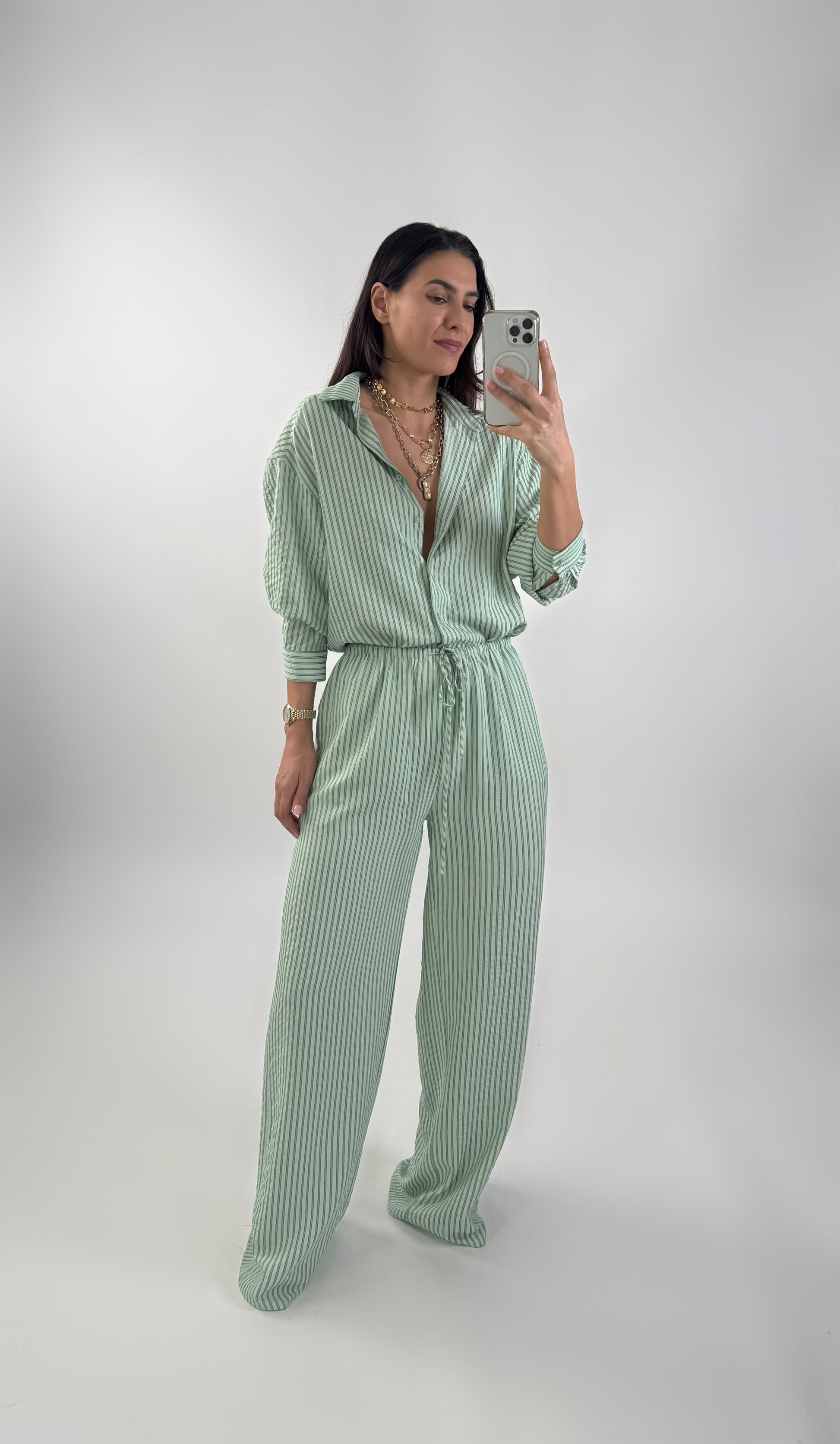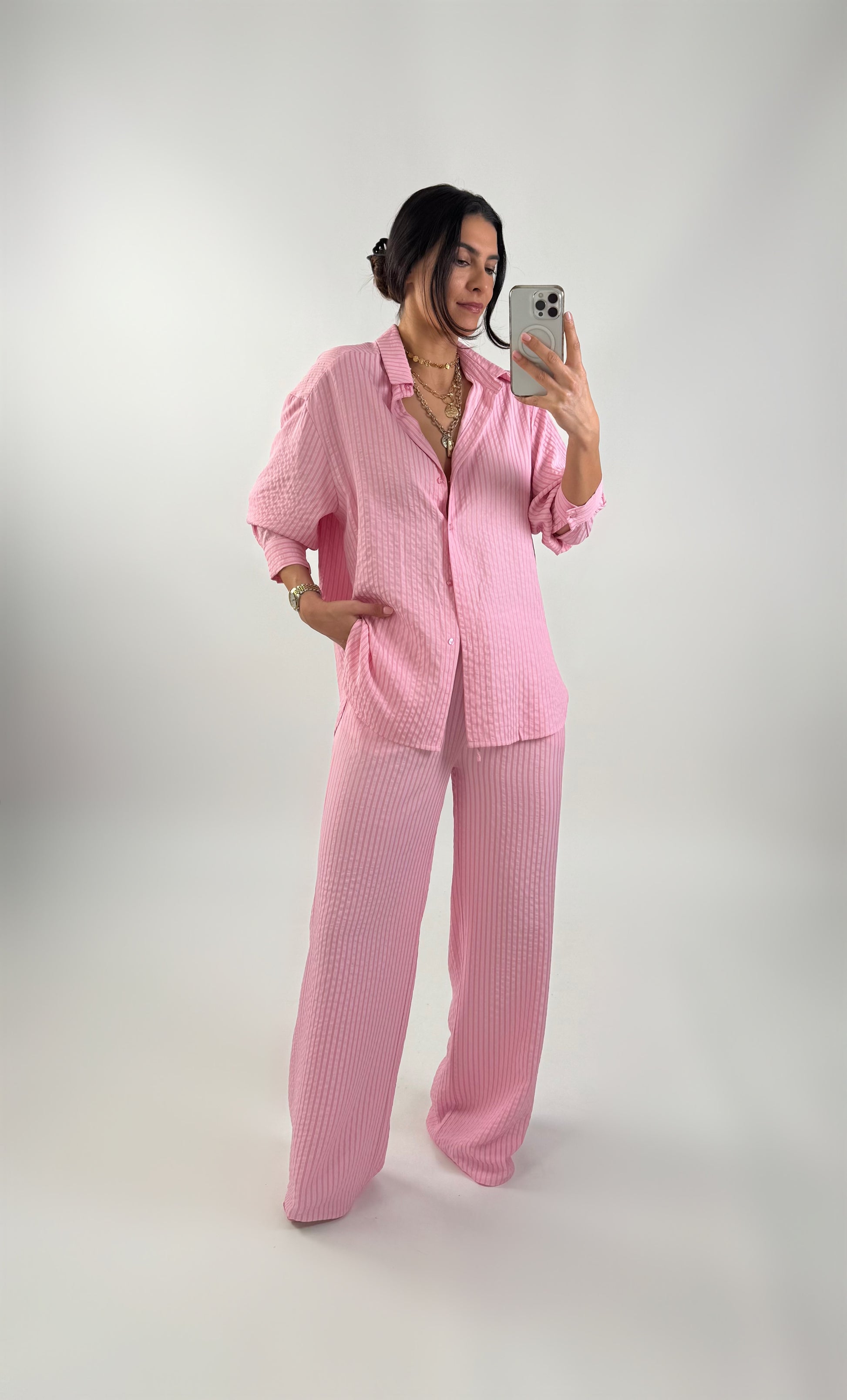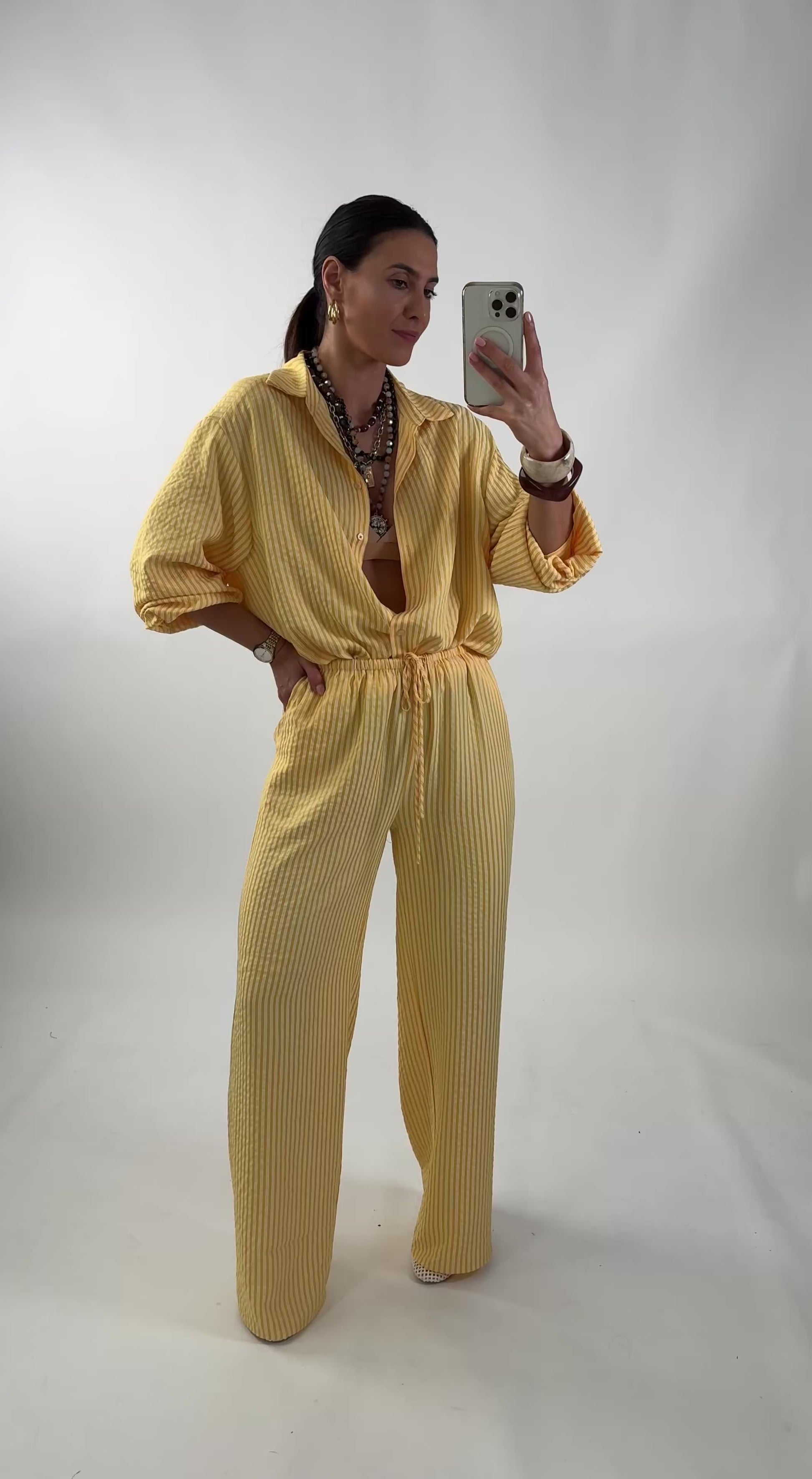 Komplet: koszula i spodnie. Koszula oversize, zapinana na guziki. Spodnie o prostym kroju z elastyczną talią i ściągaczem w postaci sznurka.