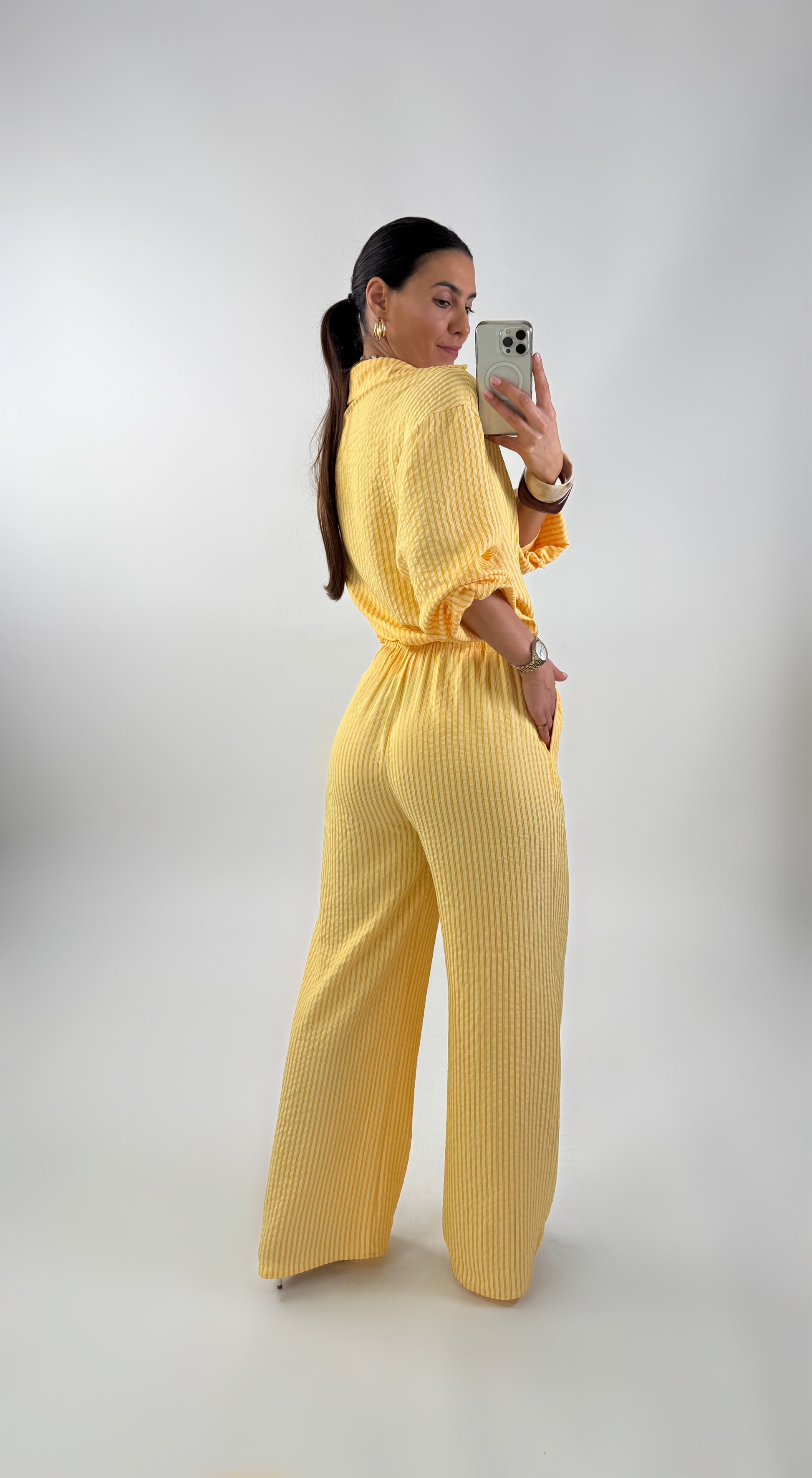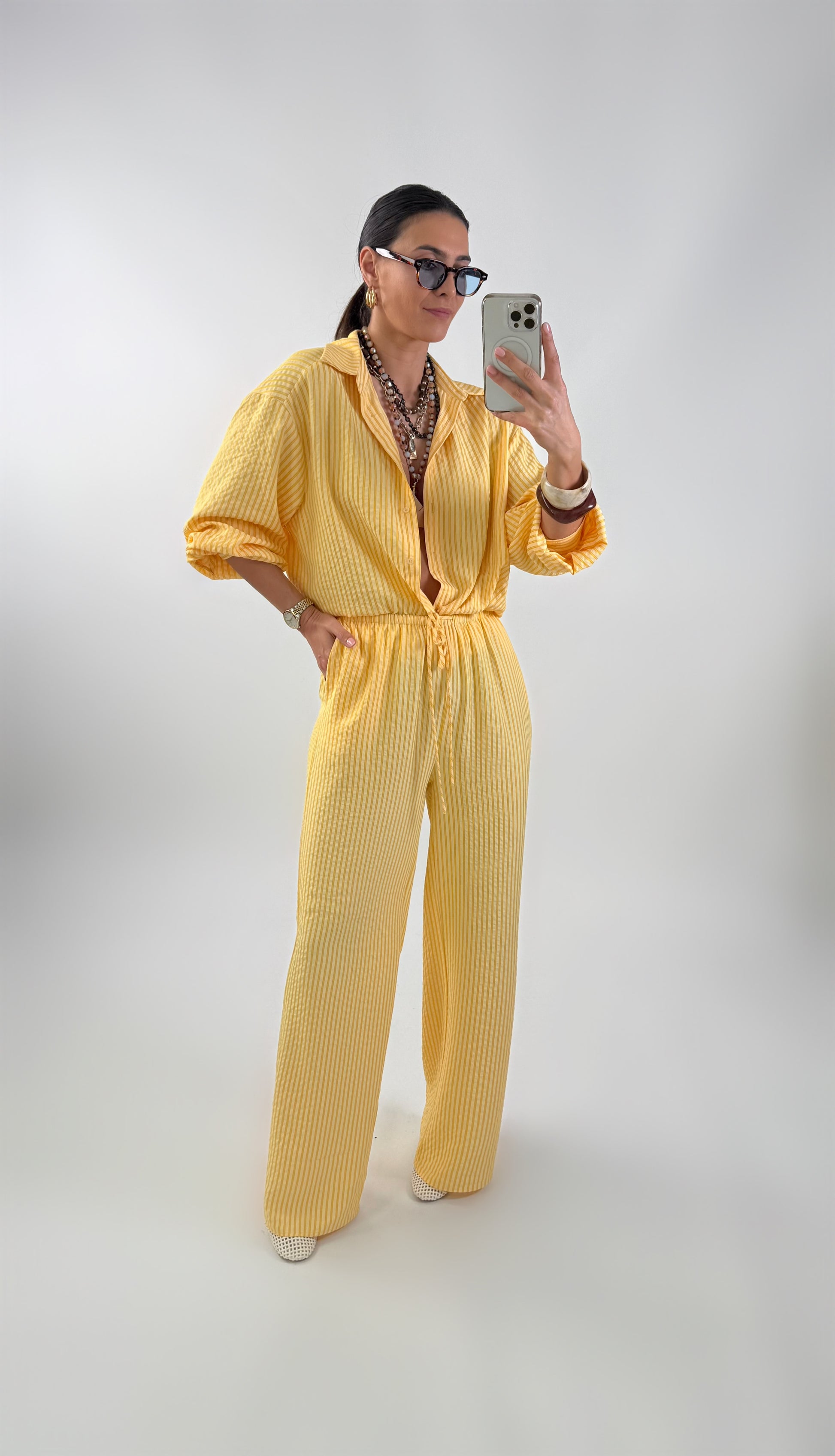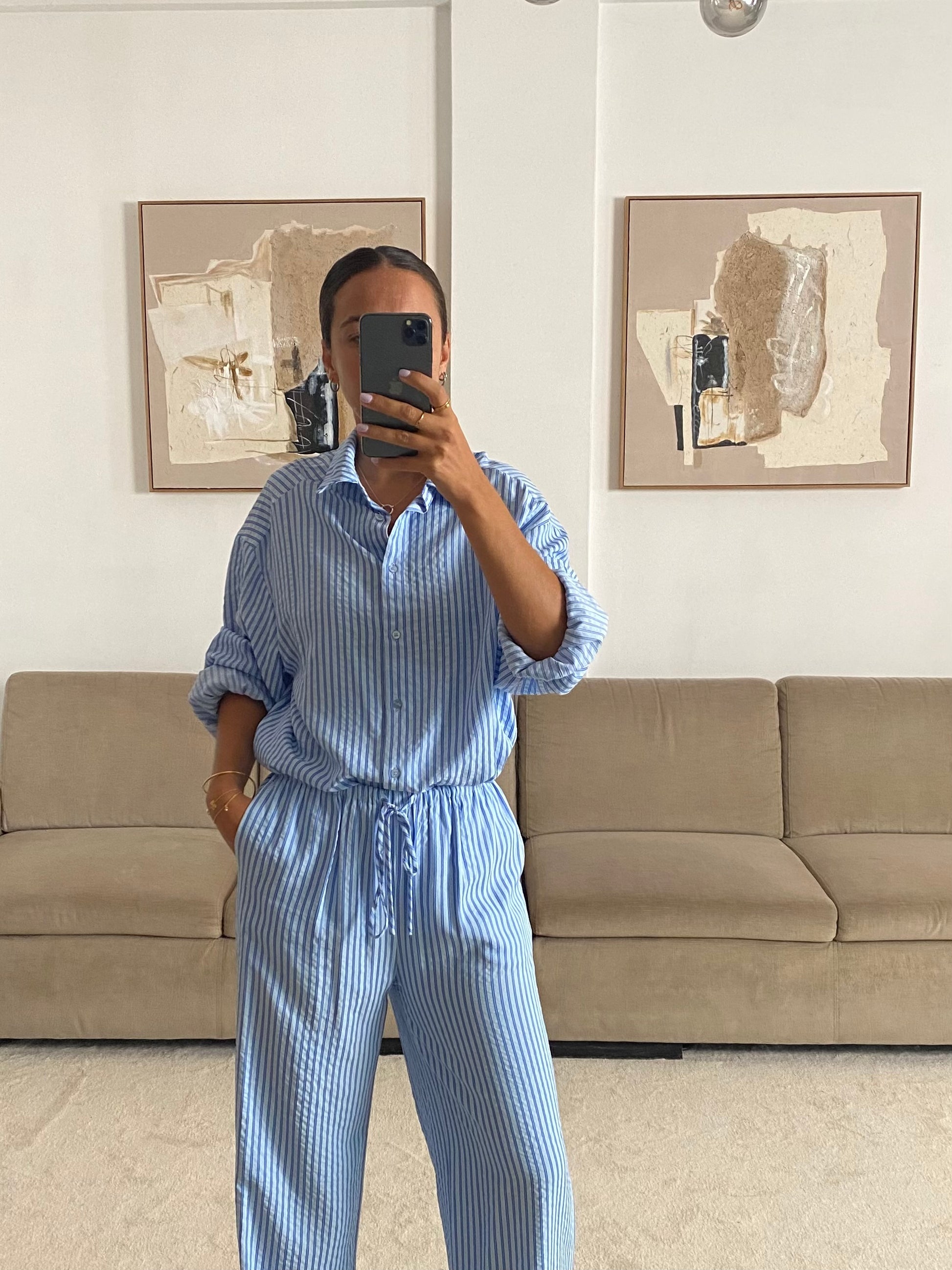 Komplet: koszula i spodnie. Koszula oversize, zapinana na guziki. Spodnie o prostym kroju z elastyczną talią i ściągaczem w postaci sznurka.