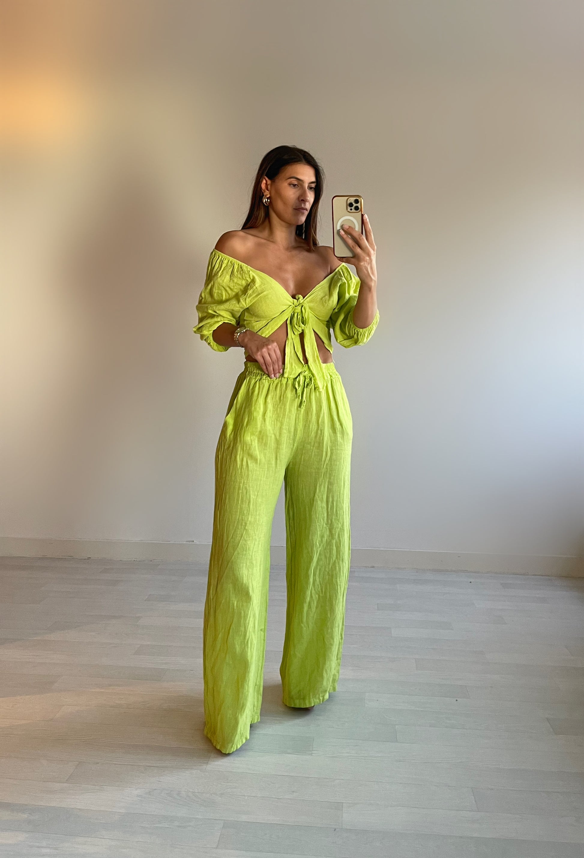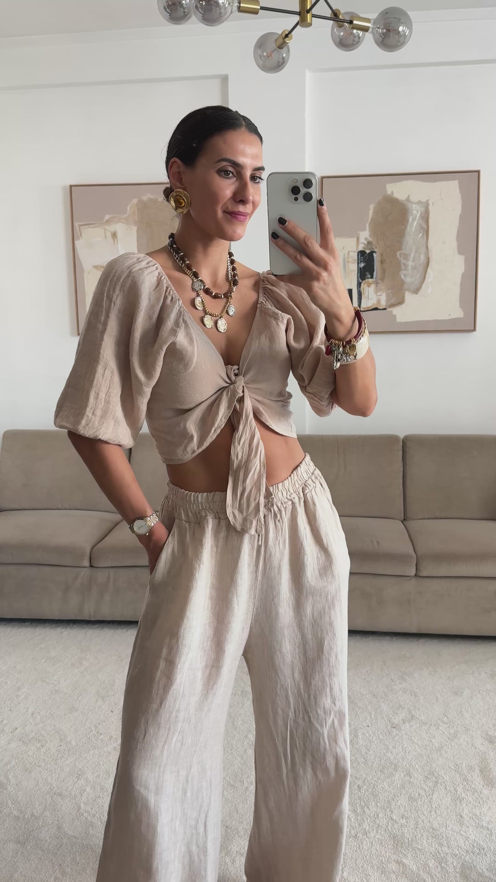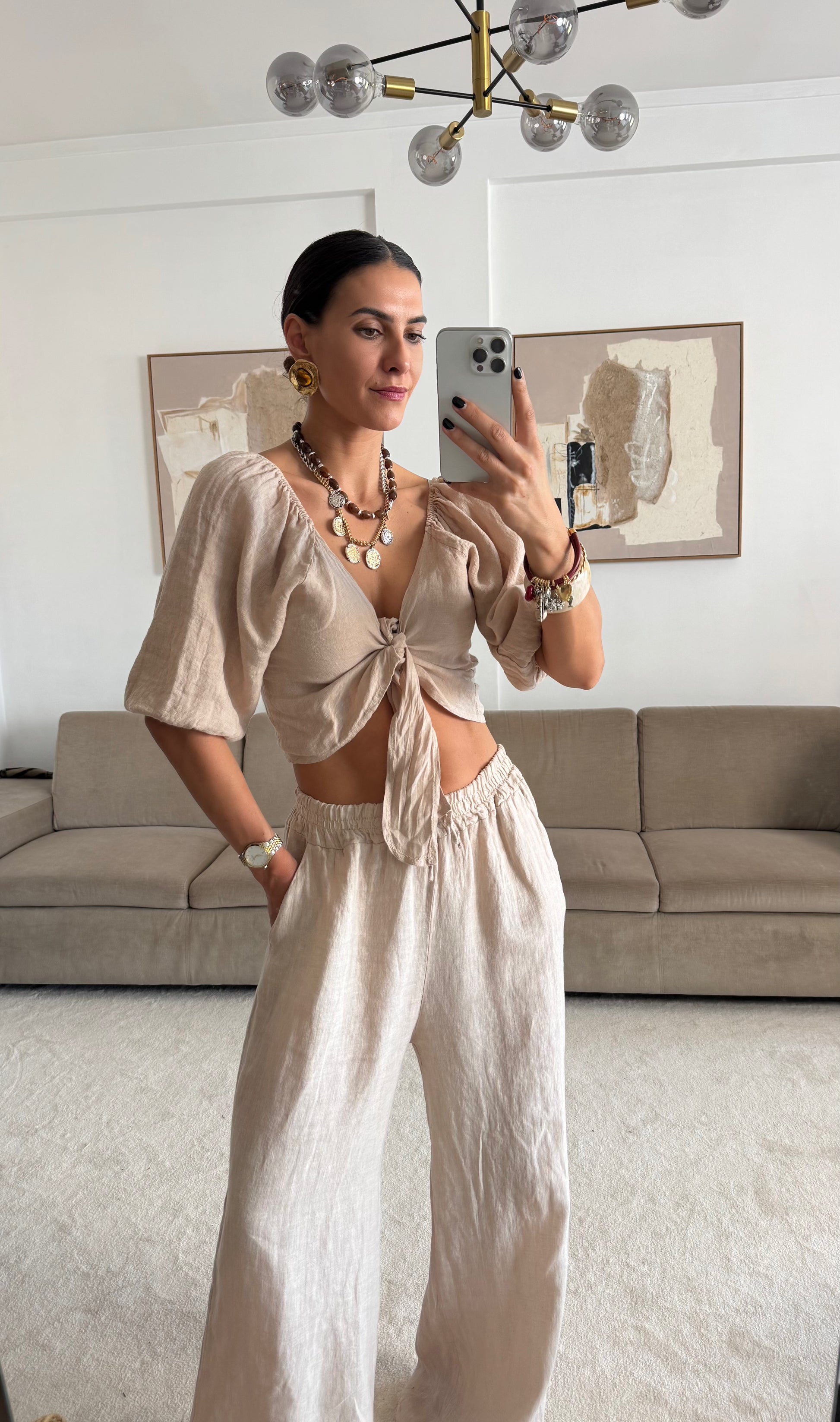 100% lniany krój, zapinany na tasiemkę, z rozszerzanymi rękawami.
