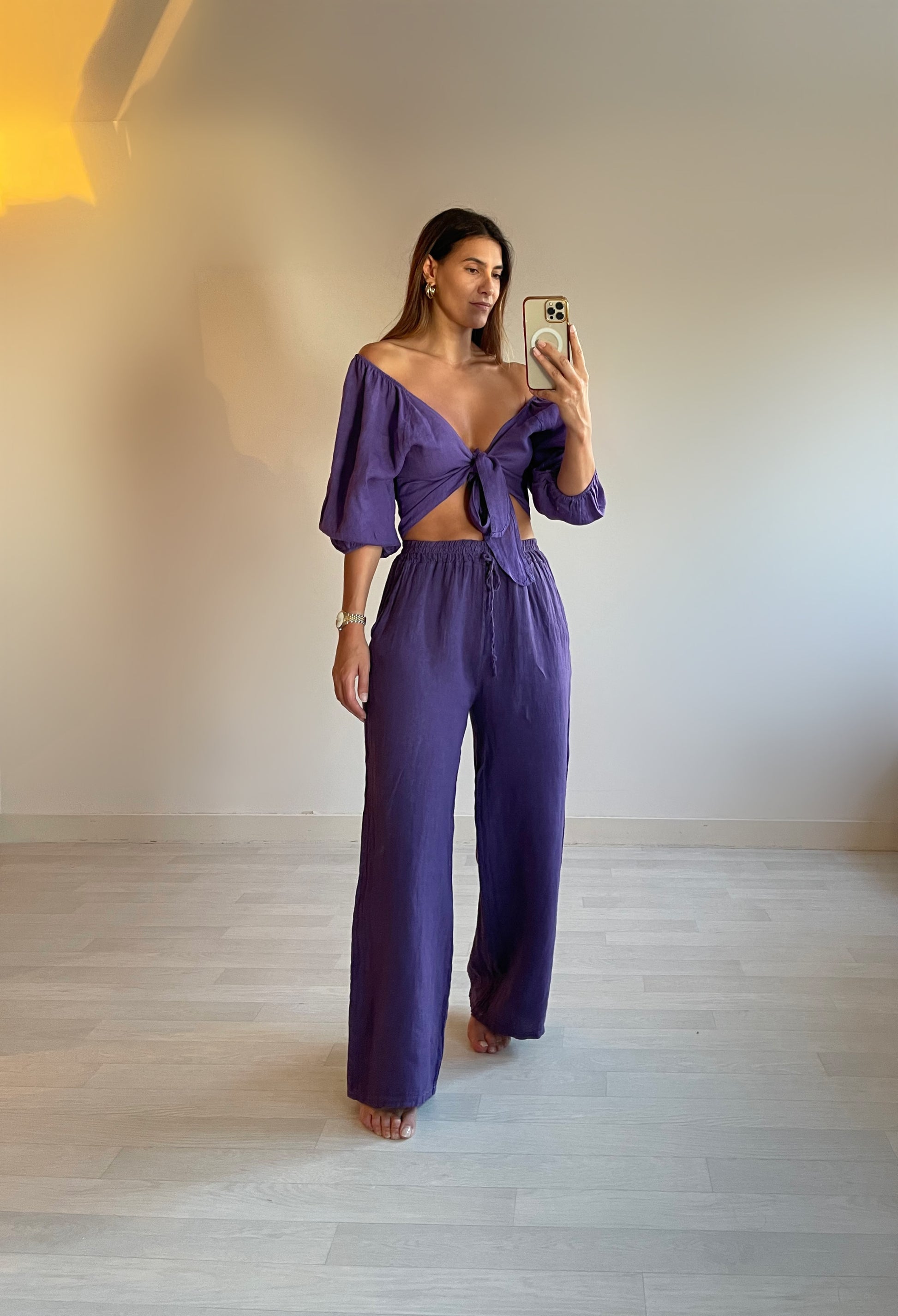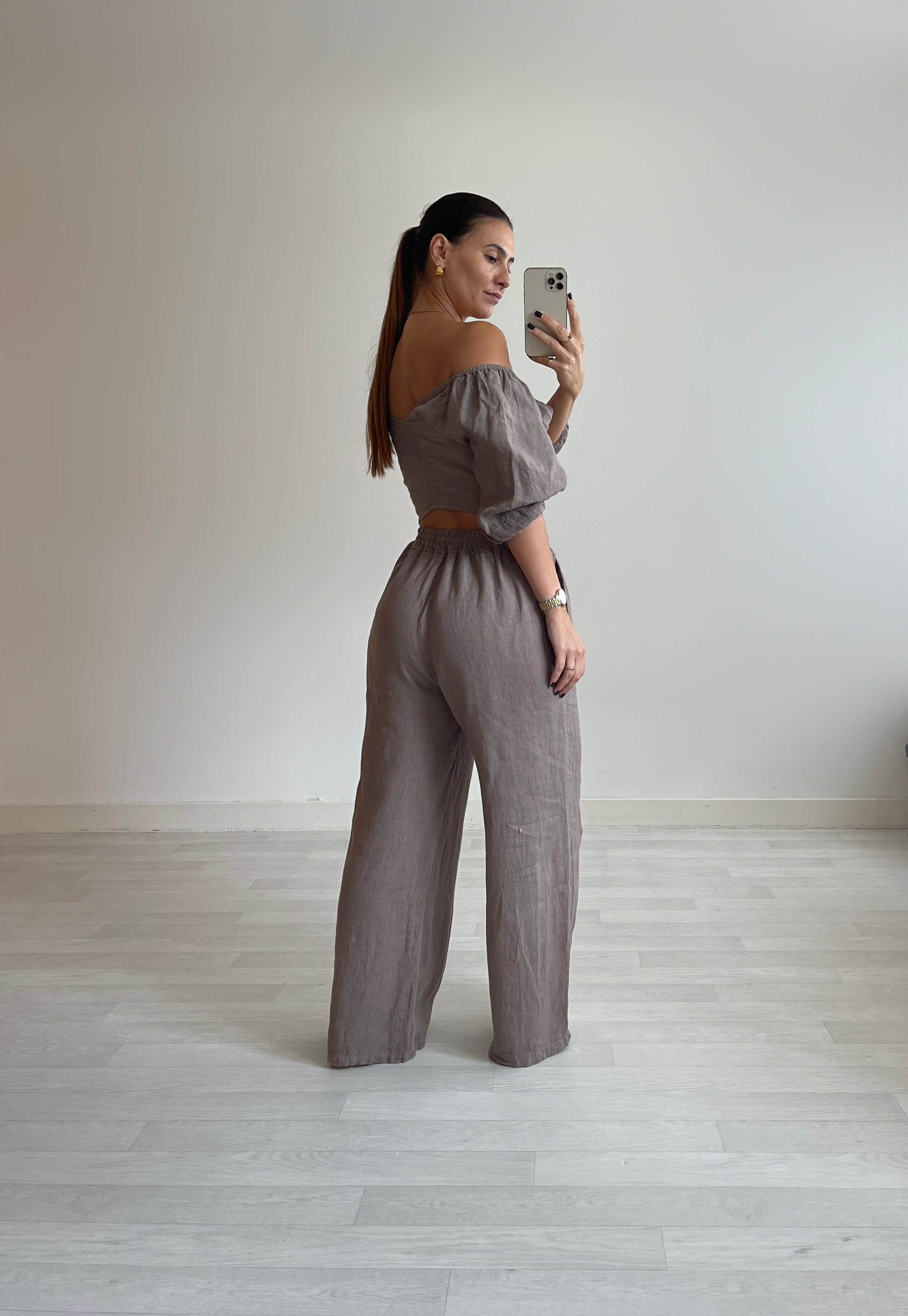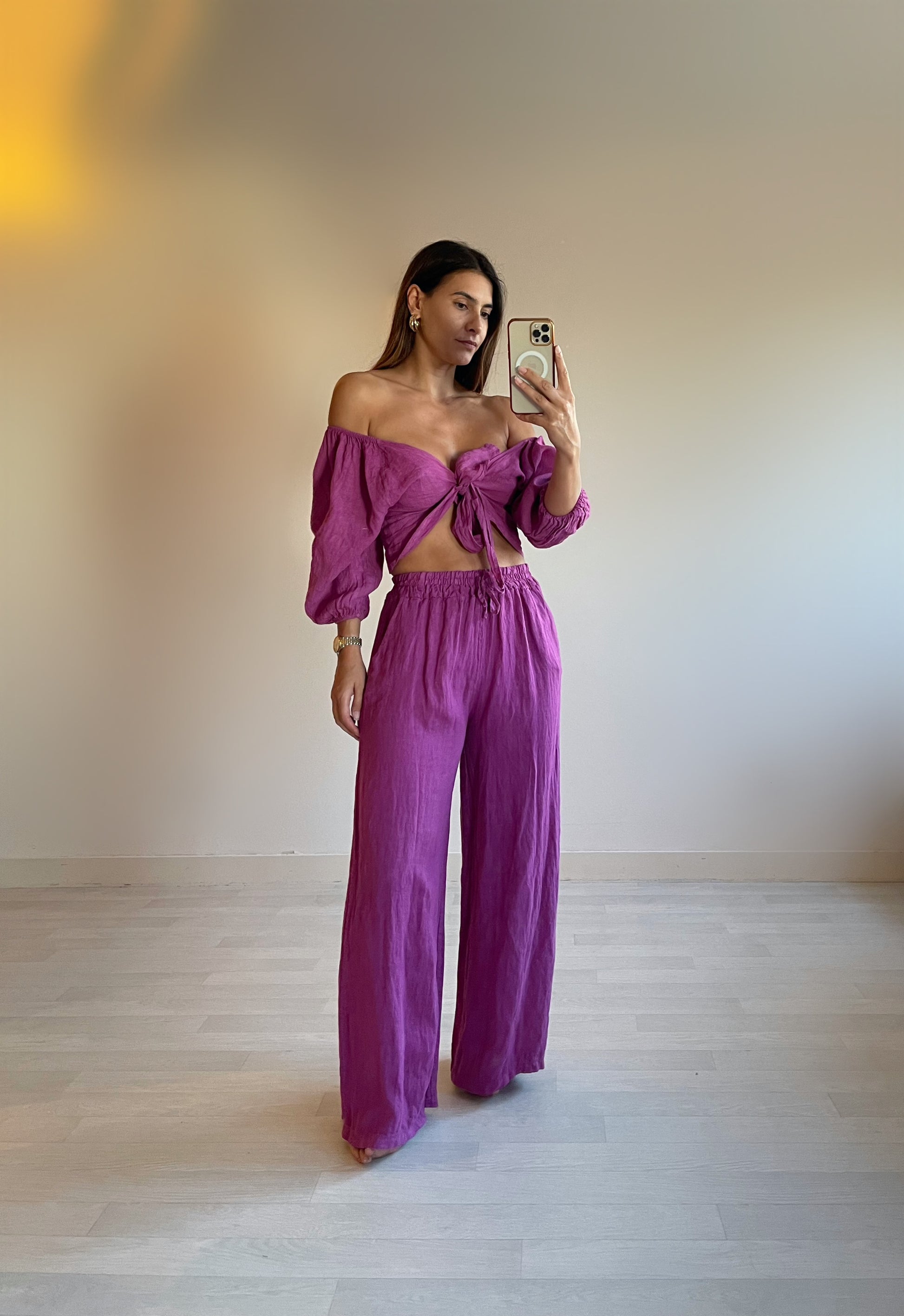 100% lniany krój, zapinany na tasiemkę, z rozszerzanymi rękawami.