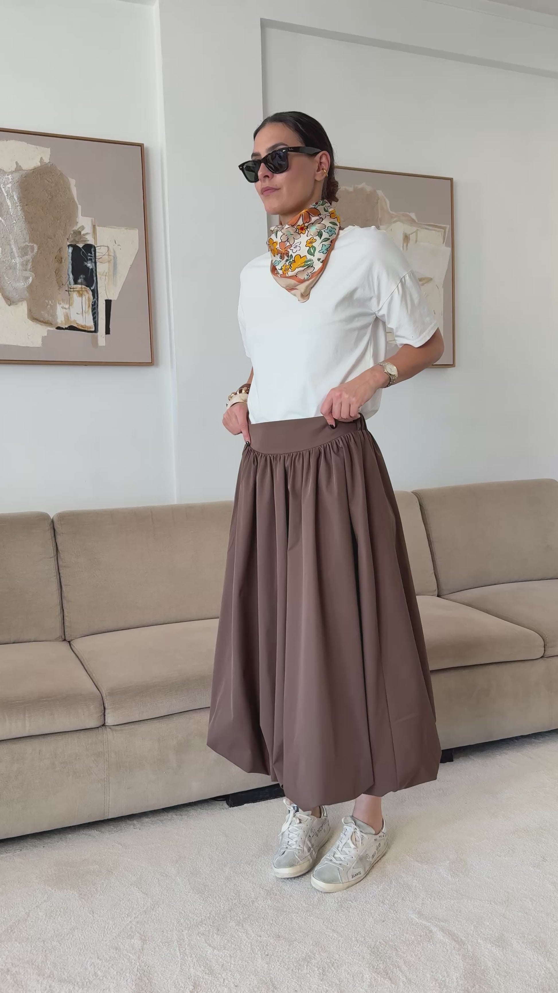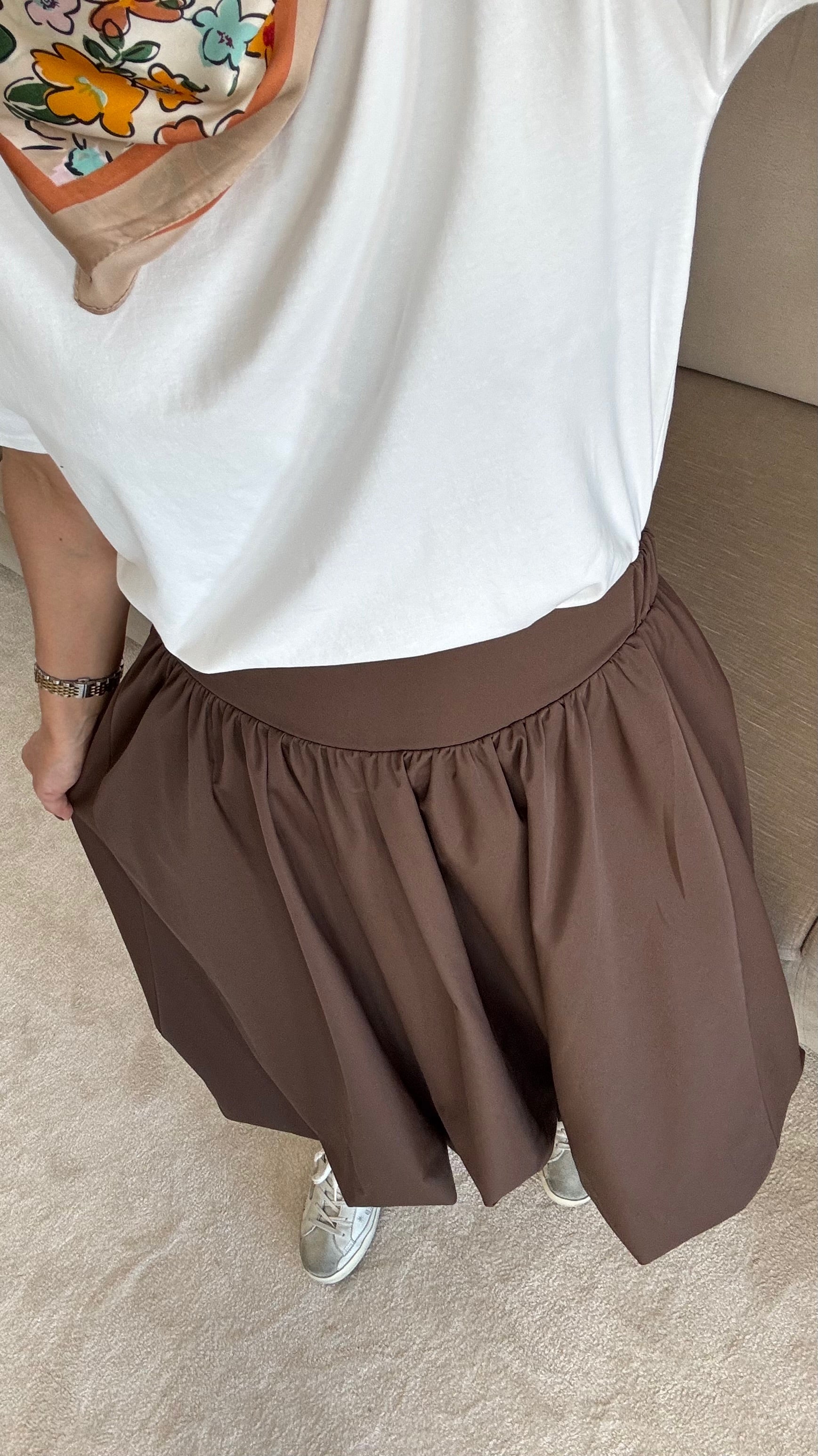 Spódnica midi Balloon z podszewką. Posiada wysoki stan i gumkę w pasie. Dół wykończony balonem.