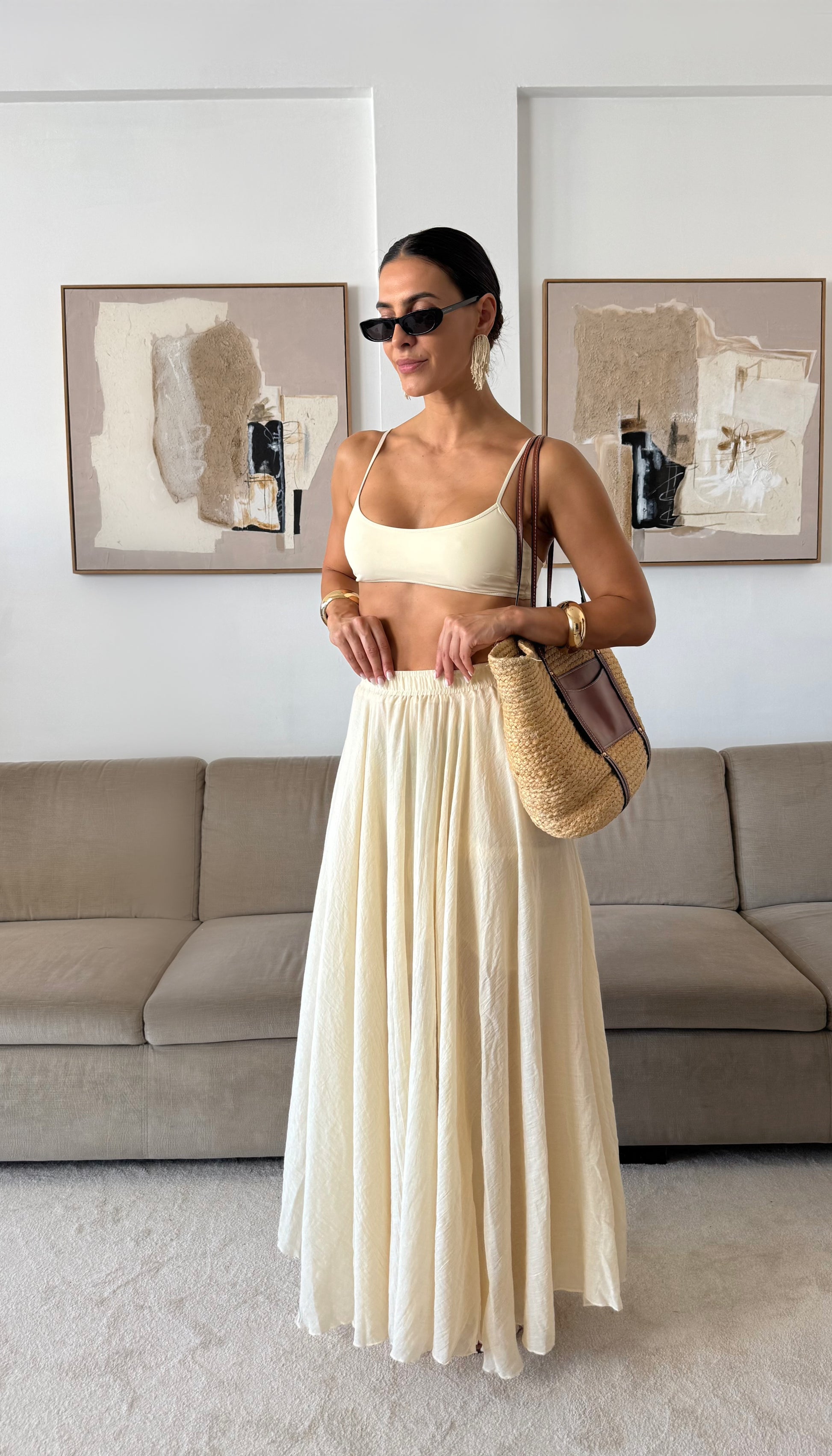 Długa, piaskowa spódnica z podszewką. Elastyczny pas. Pasuje S do L.