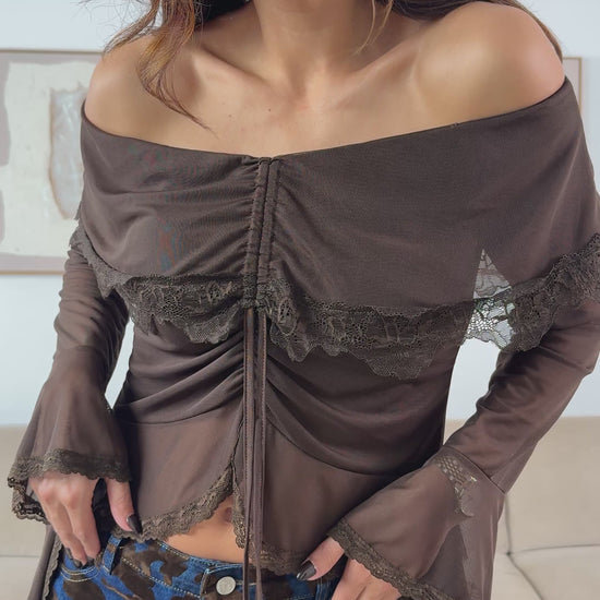 Bluzka wykonana z elastycznej tkaniny z efektem miękkiego tiulu. Fason z odkrytymi ramionami i koronkowymi zdobieniami przy dekolcie i rękawach. Posiada regulowane wiązanie z przodu i luźny krój z wydłużonymi frędzlami.