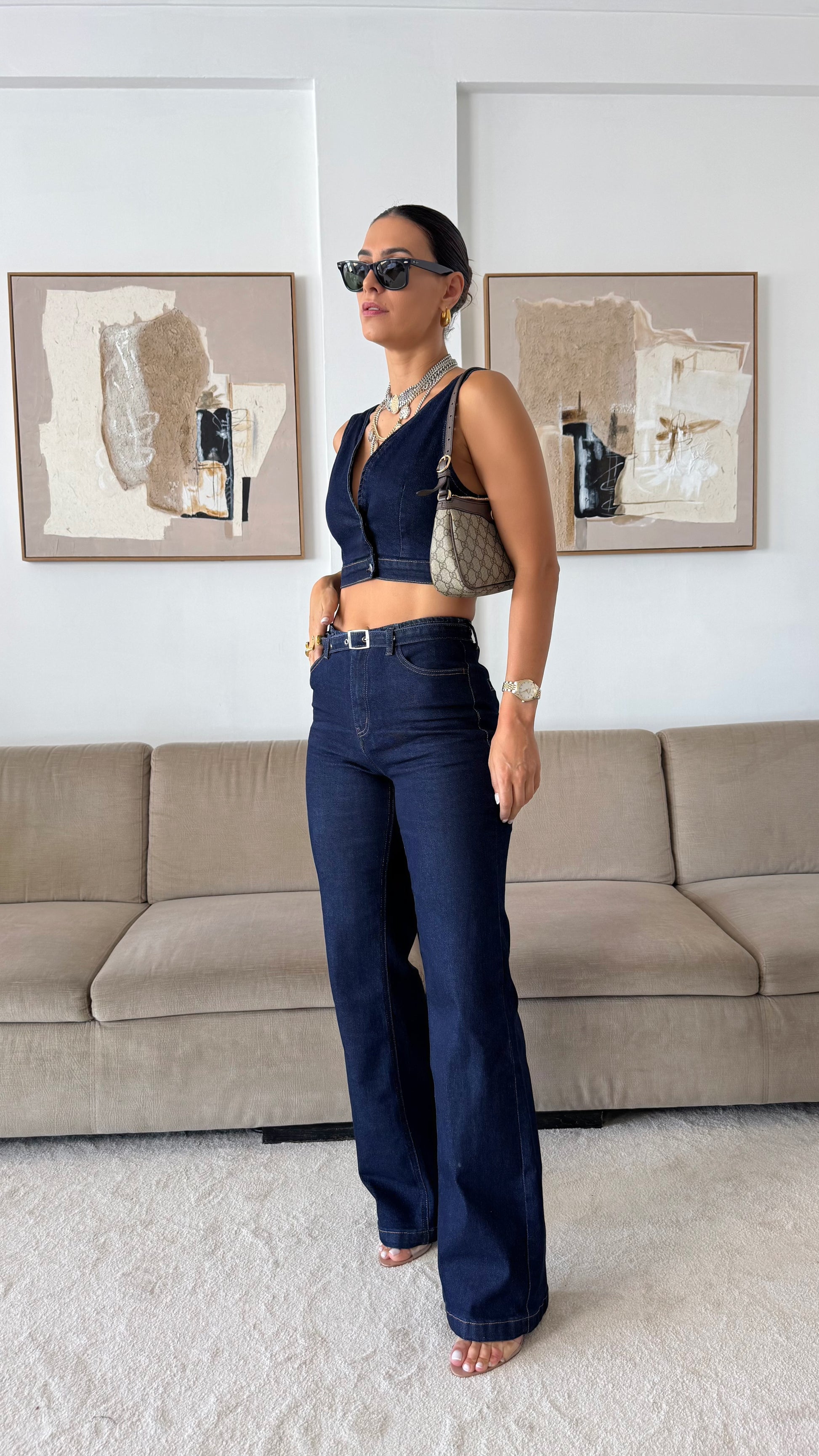 Komplet kamizelka i spodnie. Kamizelka zapinana na guziki, z dekoltem w serek z tyłu i z przodu. Rozszerzane spodnie typu push-up zapinane są na niewidoczny guzik i pasek z tego samego materiału, z kieszeniami z przodu. Z tyłu posiadają efekt kieszeni. Wystarczająco elastyczne; jeśli jesteś pomiędzy rozmiarami, możesz wybrać mniejszy rozmiar.