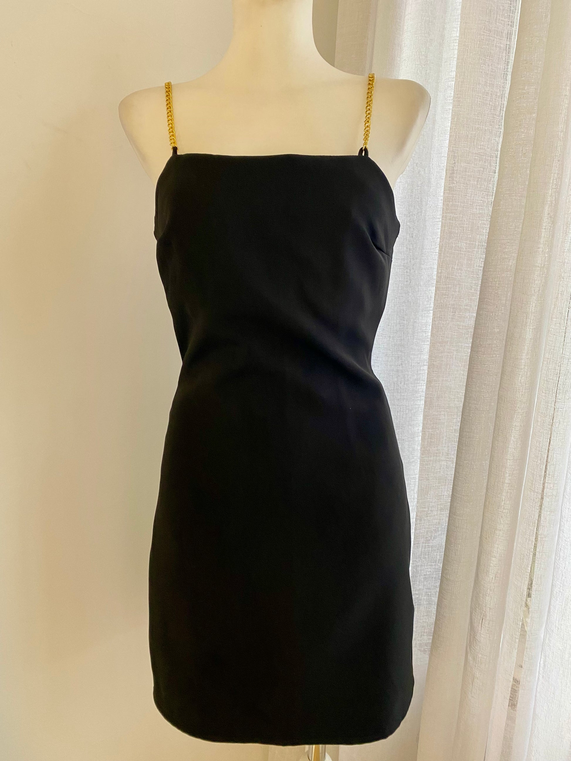 Sukienka z garniturowej tkaniny ze złotym łańcuszkiem. Zapinana z tyłu na niewidoczny zamek błyskawiczny.