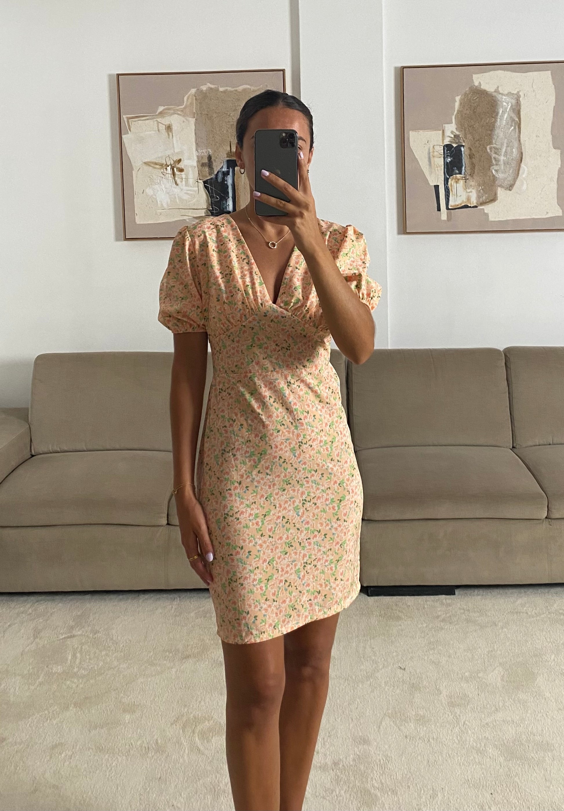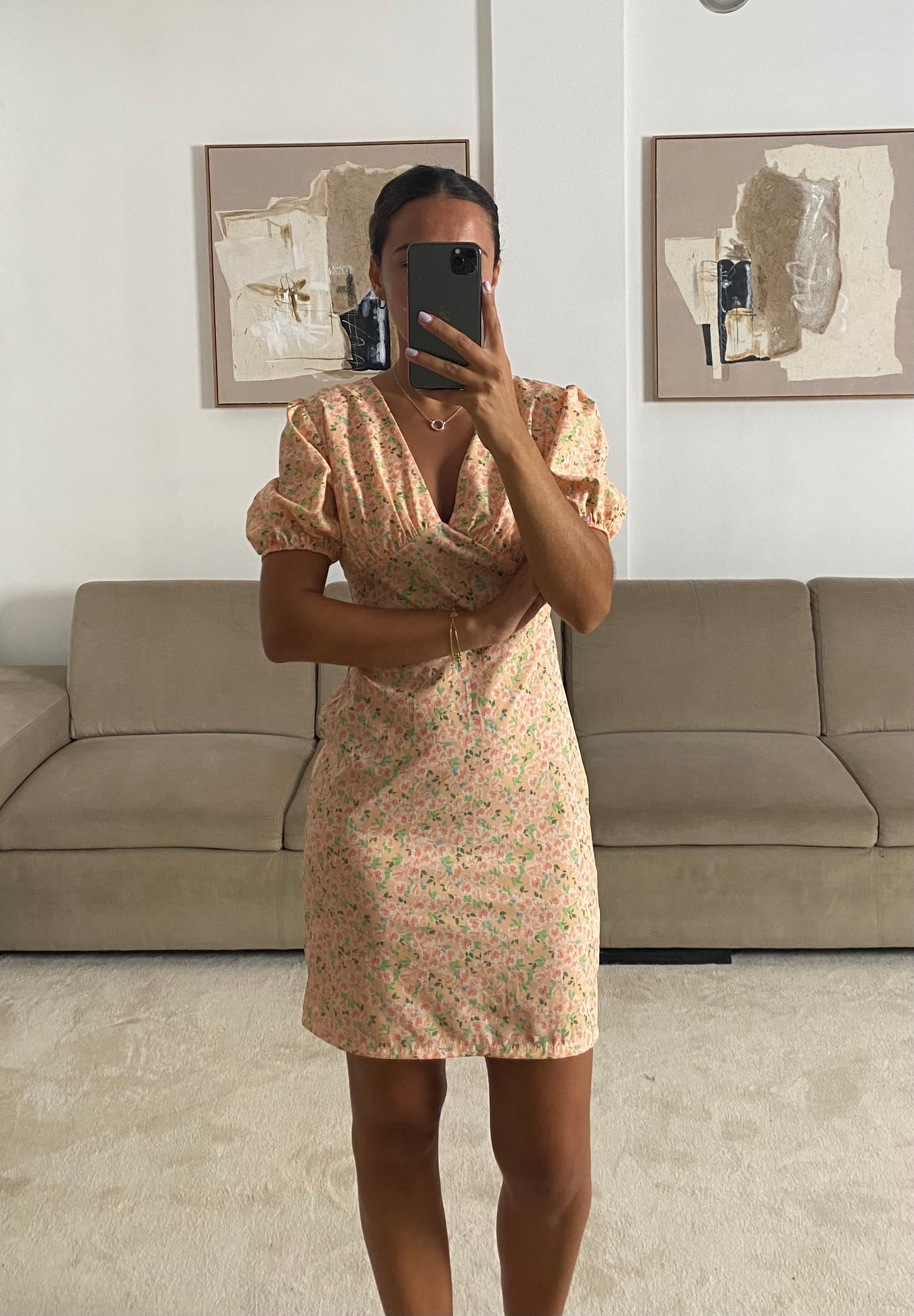 Krótka sukienka z gumką z tyłu. Dekolt w serek i bufiaste rękawy. S do L.