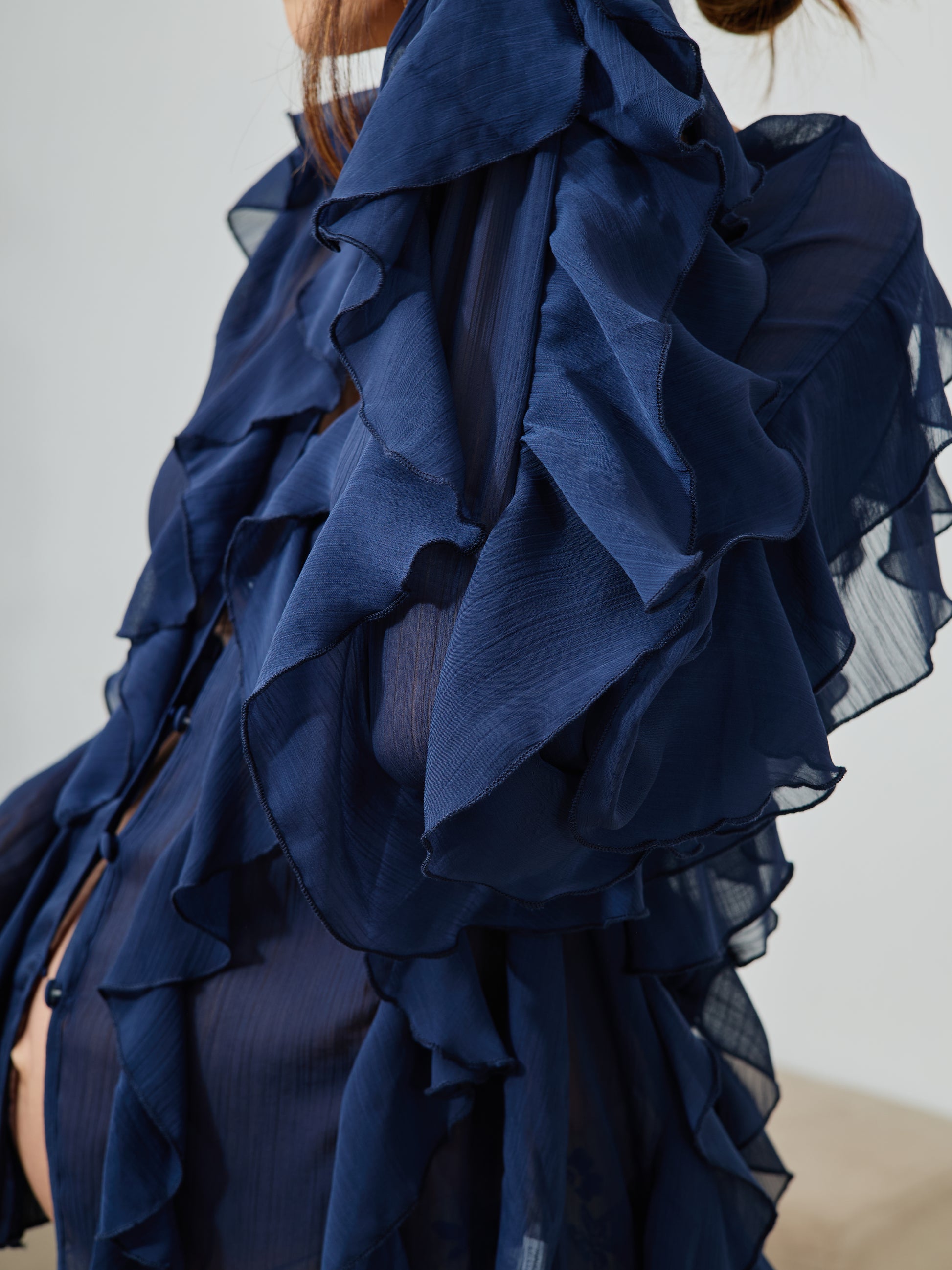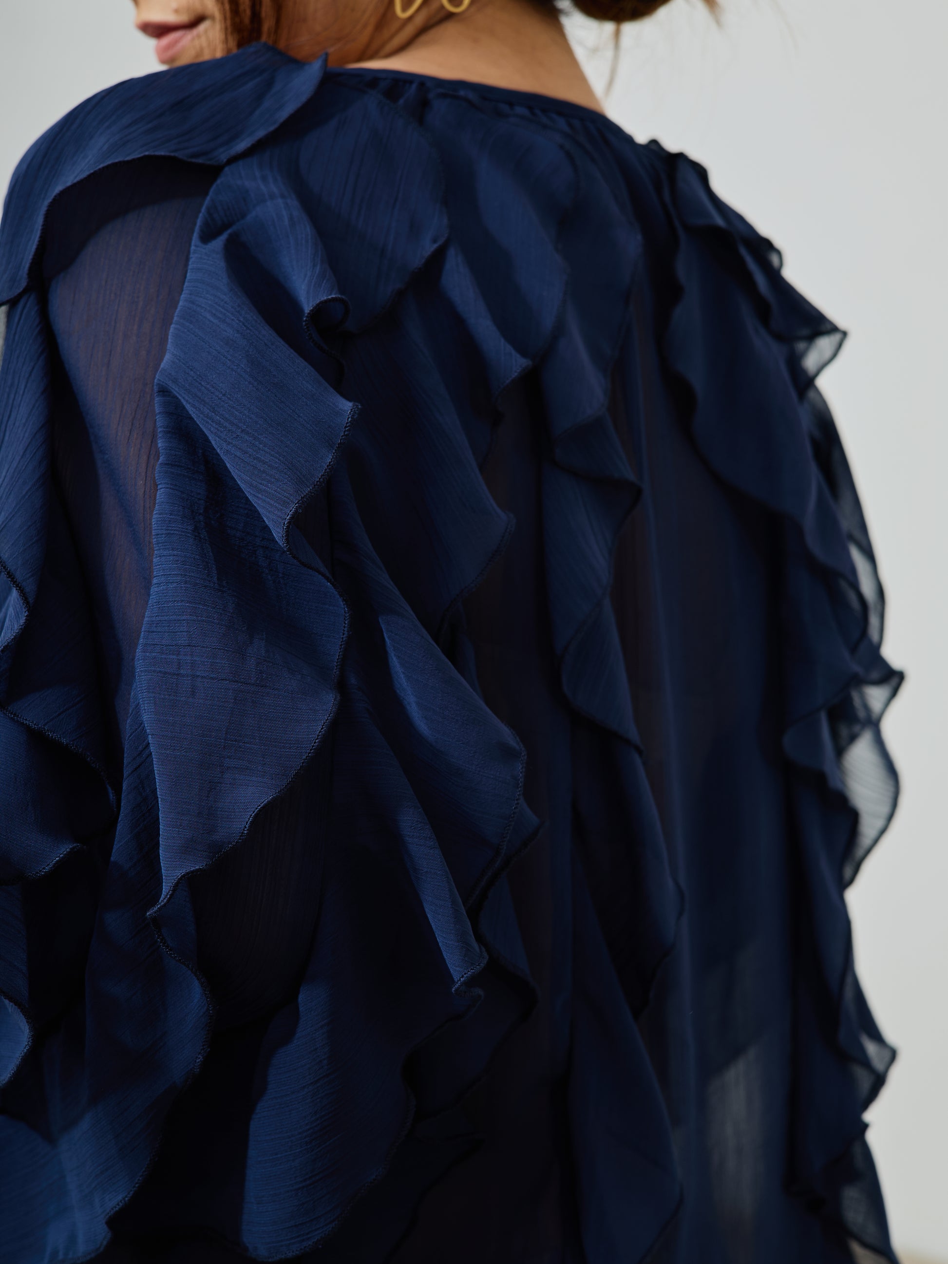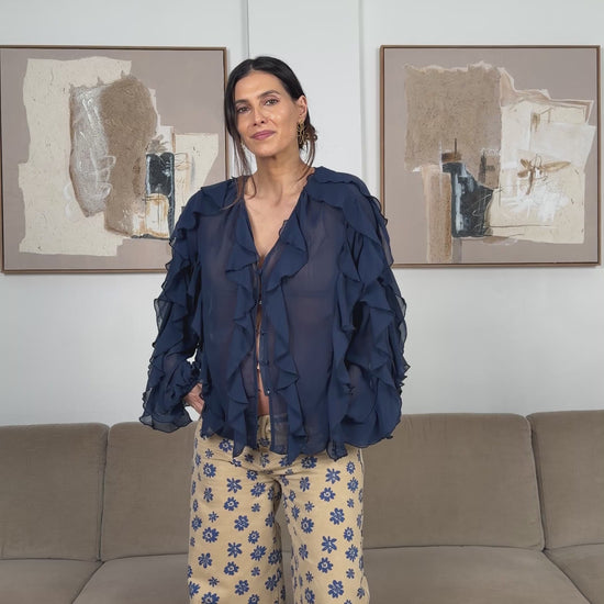 Blusa Boho Folhos Azul Marinho