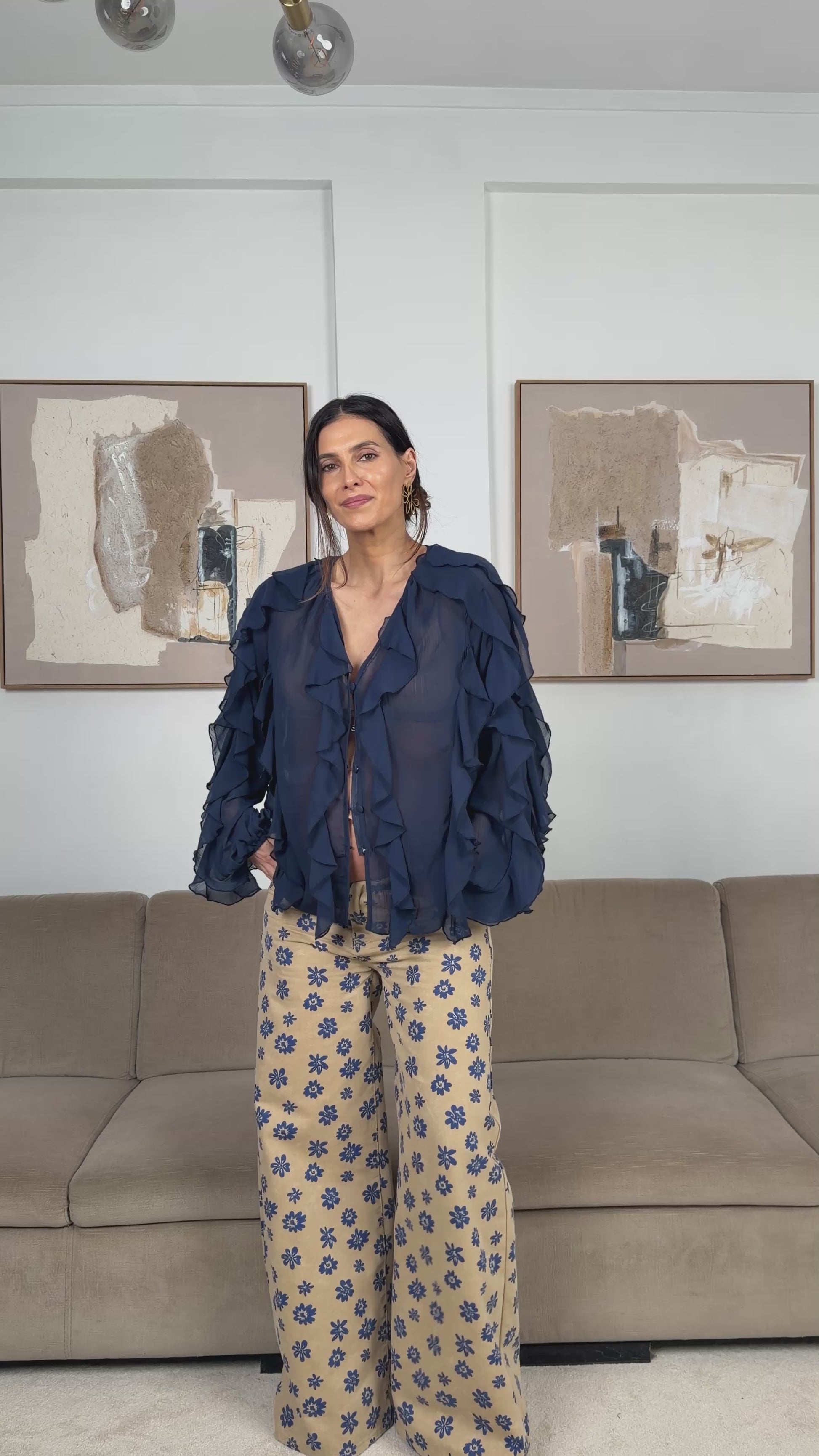 Tecido fluido. Design com folhos. Gola V com botões. Manga comprida abaloada. Punhos elásticos. Veste do S ao L.