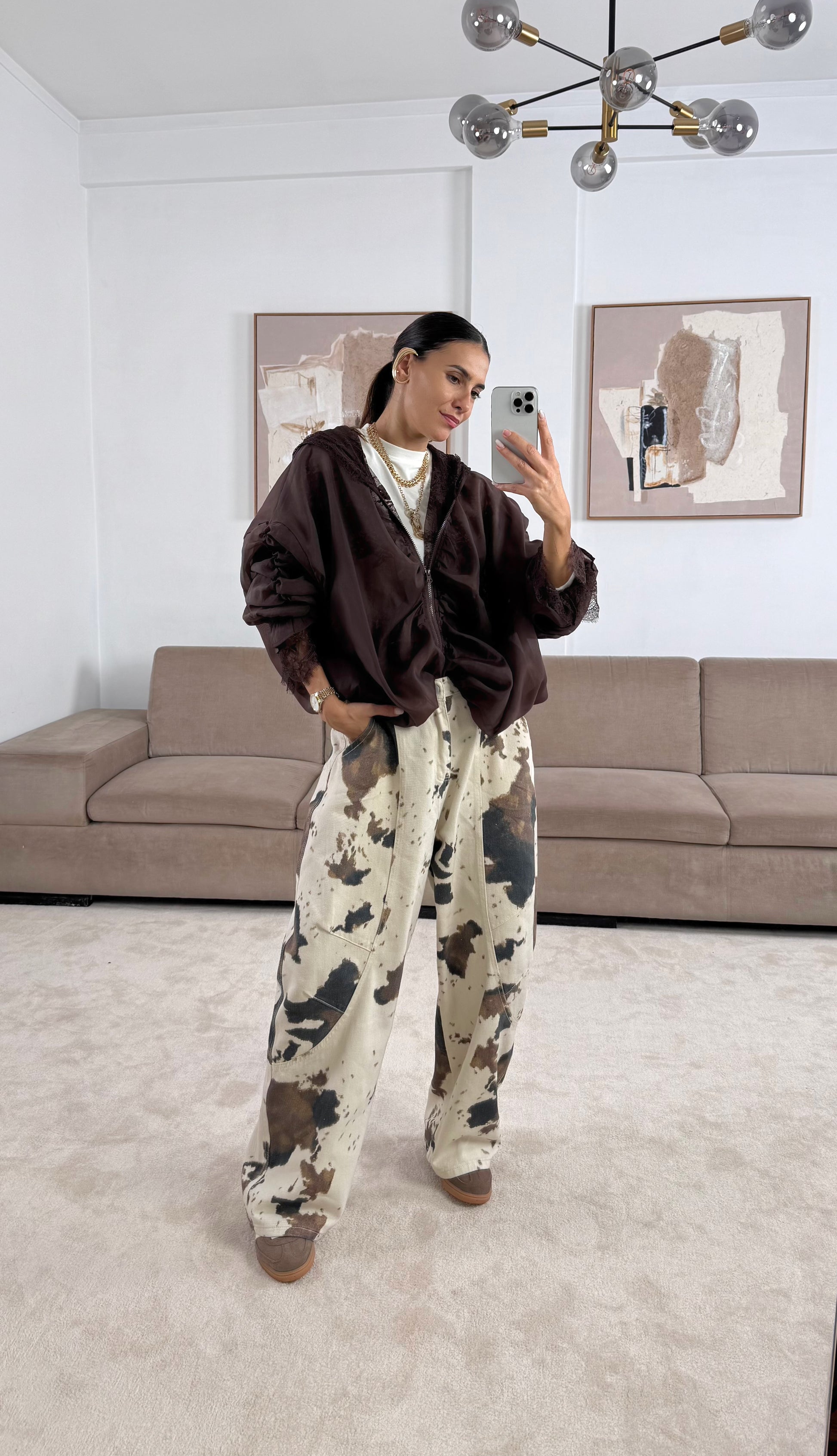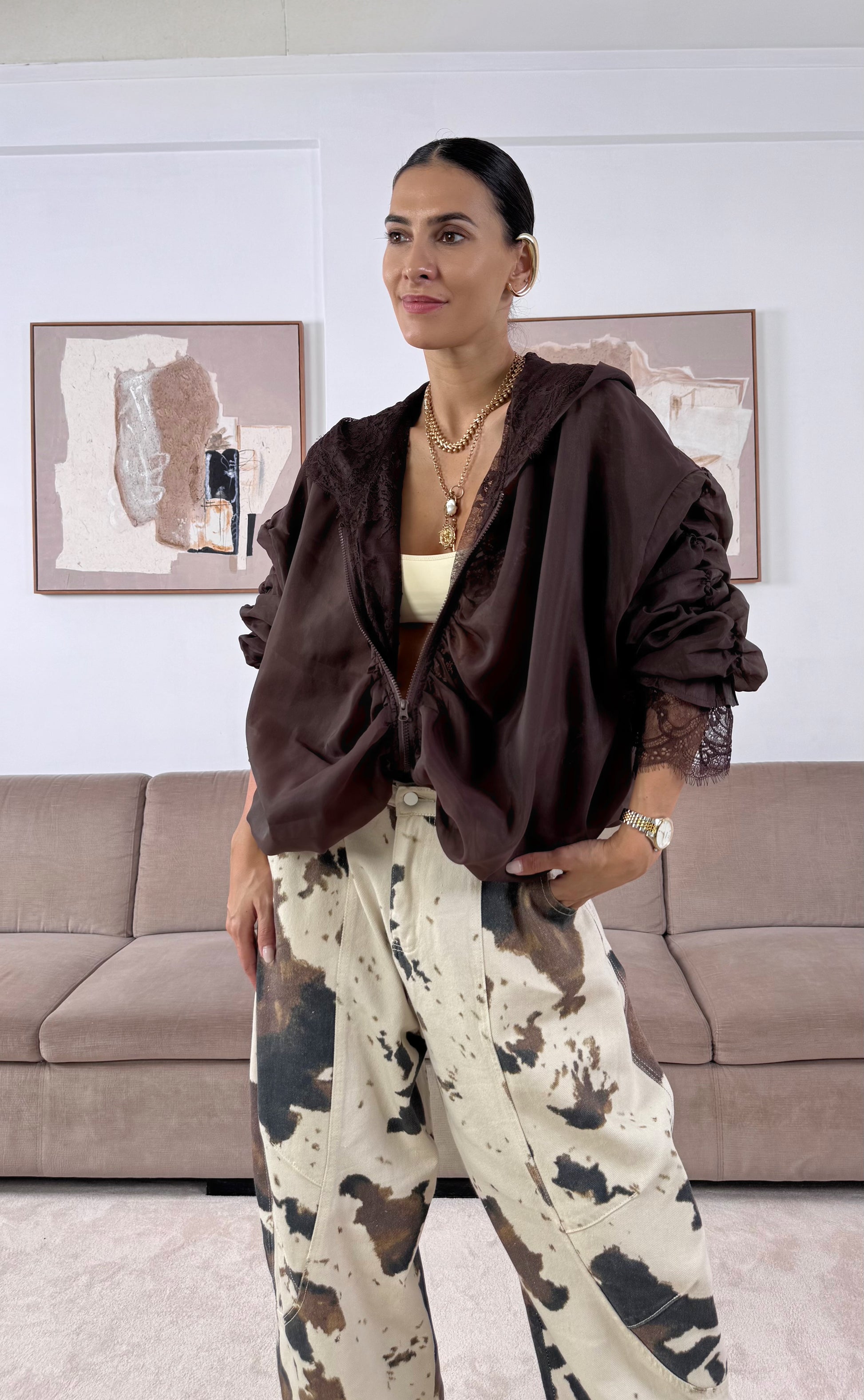 Casaco estilo bomber em tom castanho. Apresenta duplo capuz, sendo uma das camadas em renda decorativa, para um look moderno com um toque romântico.