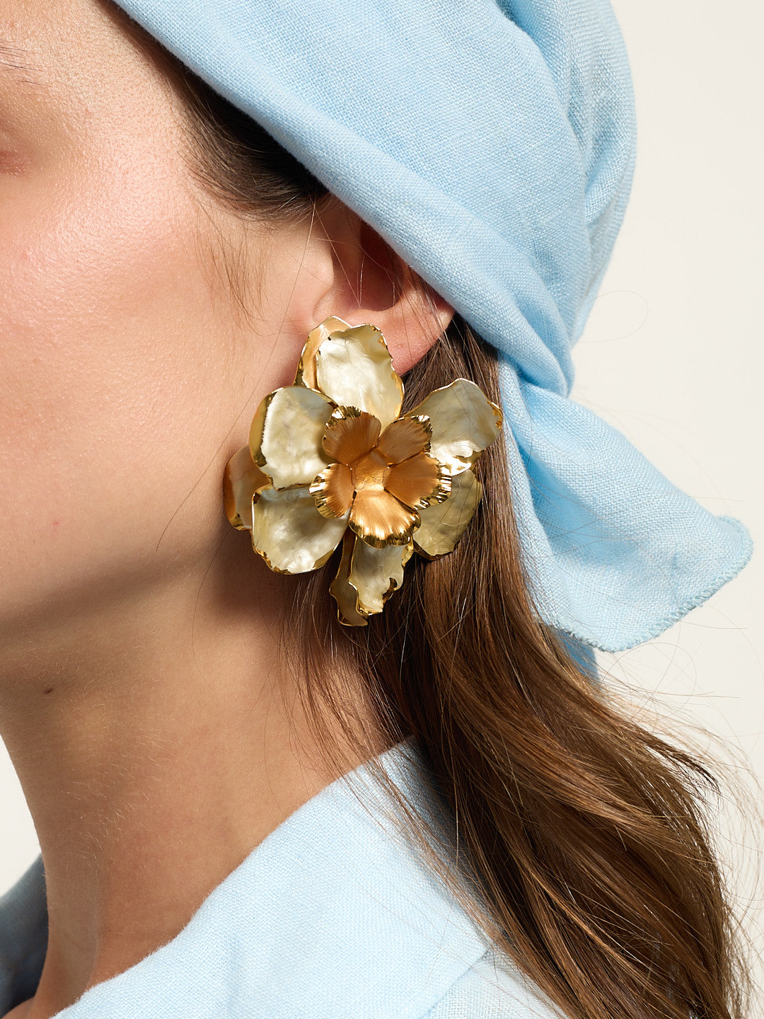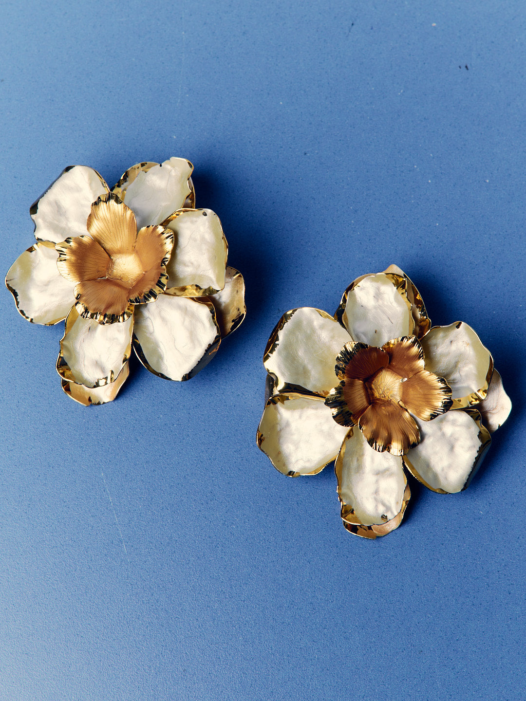 Brincos com modelo de flor, com pétalas sobrepostas que criam um efeito tridimensional. O design combina um acabamento esmaltado em tom pérola com rebordos e centro metálicos dourados.