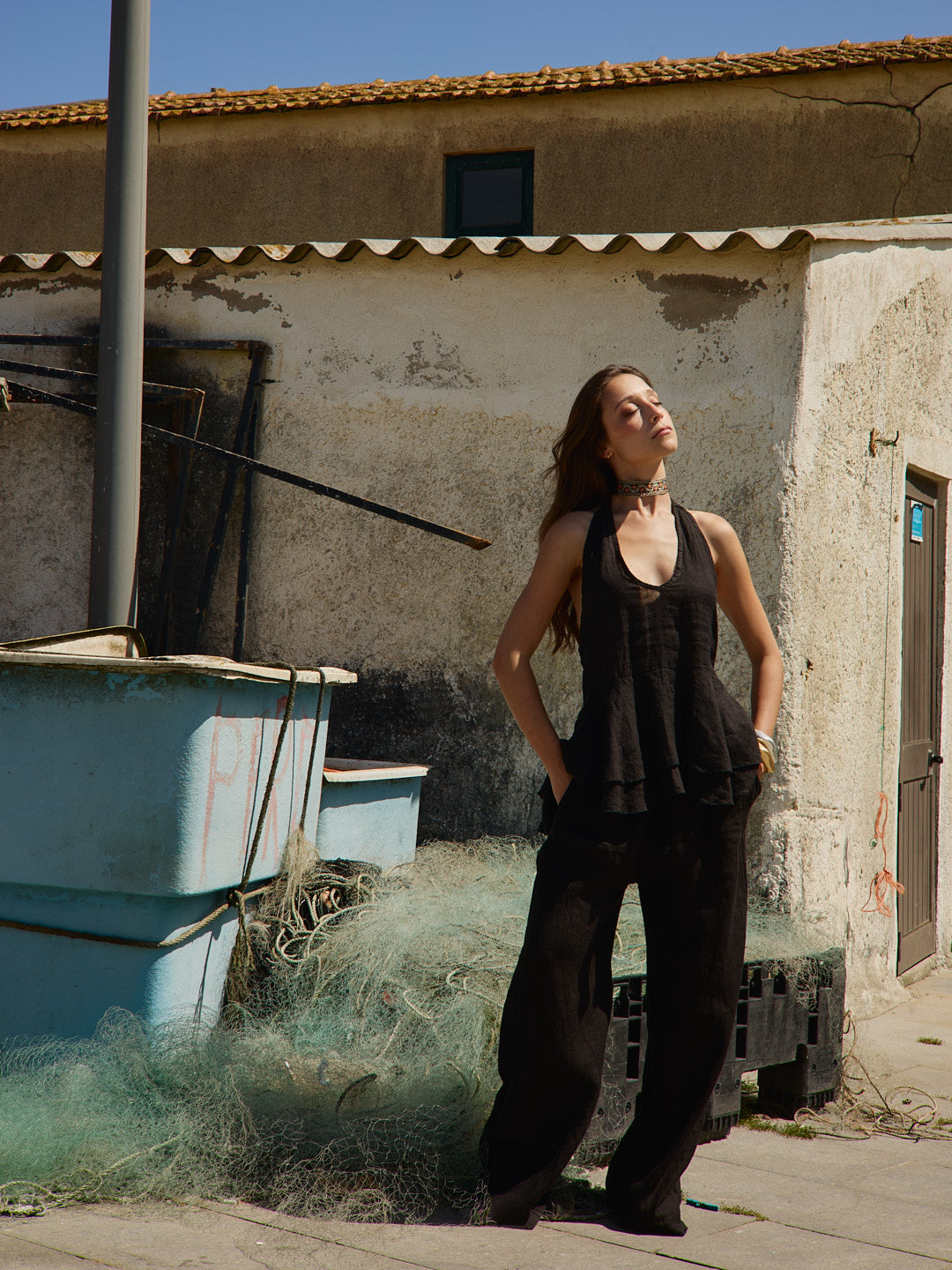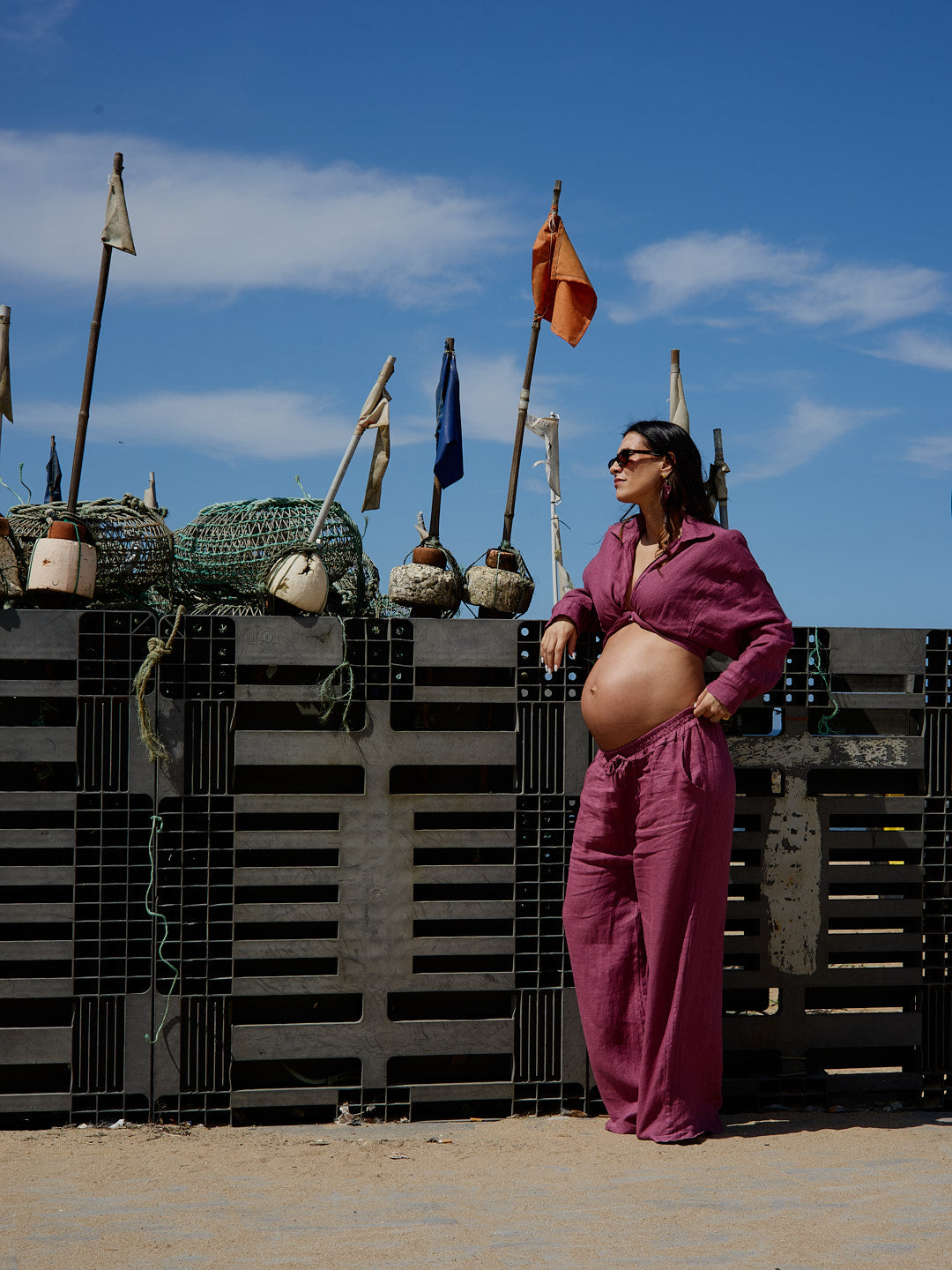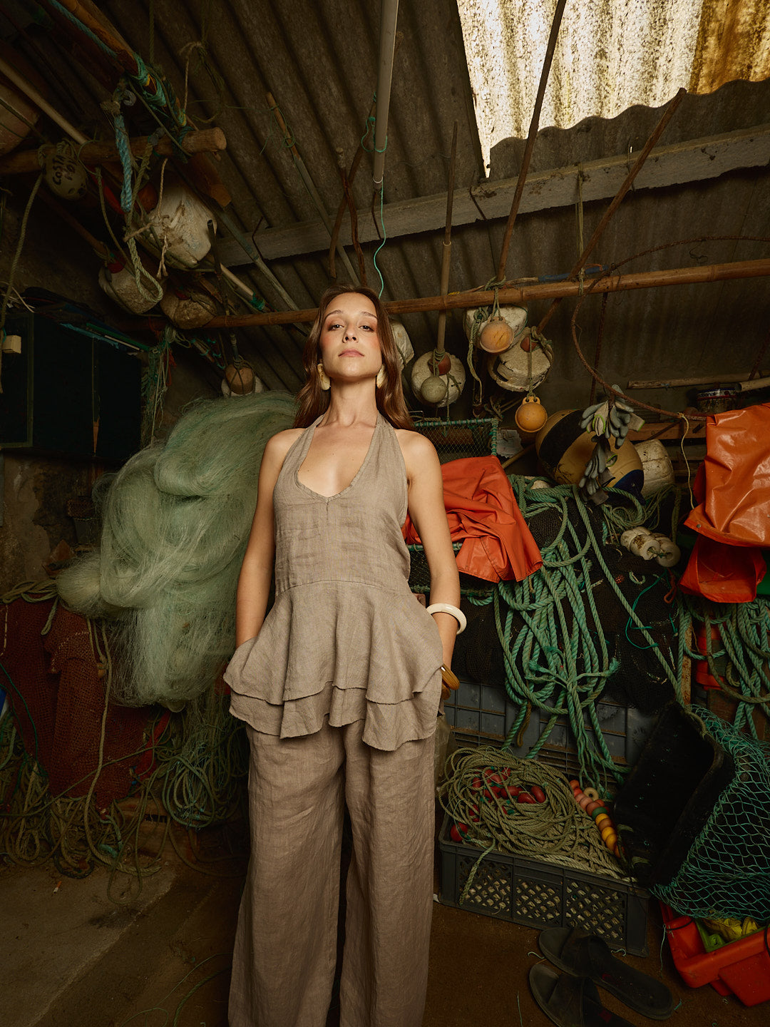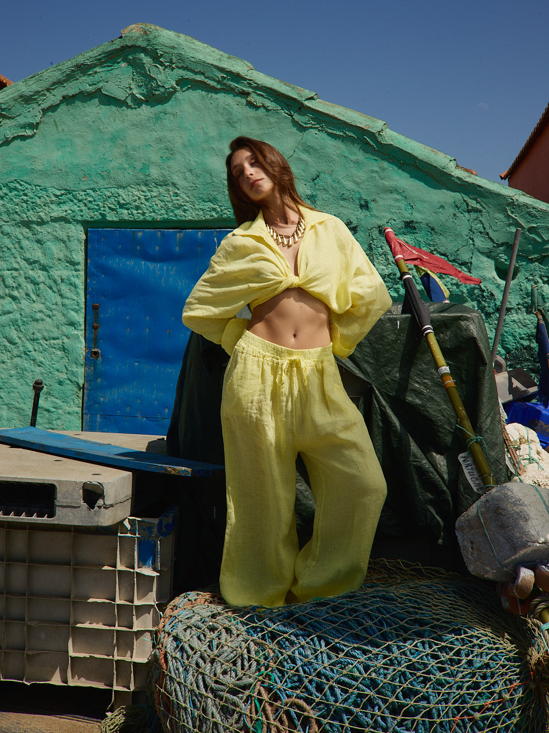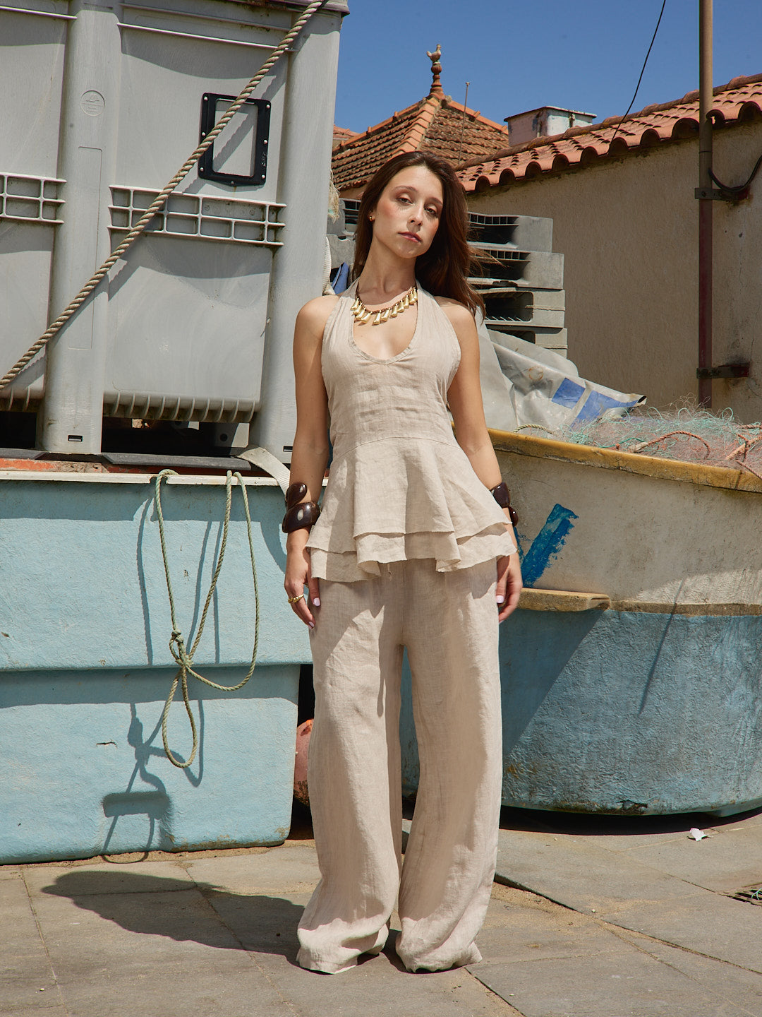Calça linho, tem elástico na cintura e bolsos. Vestem do S ao XL.
