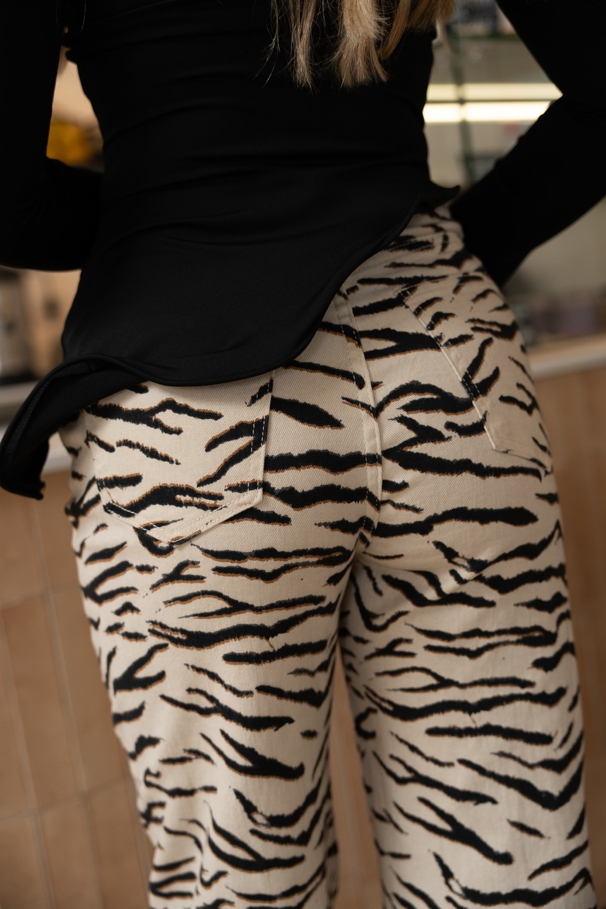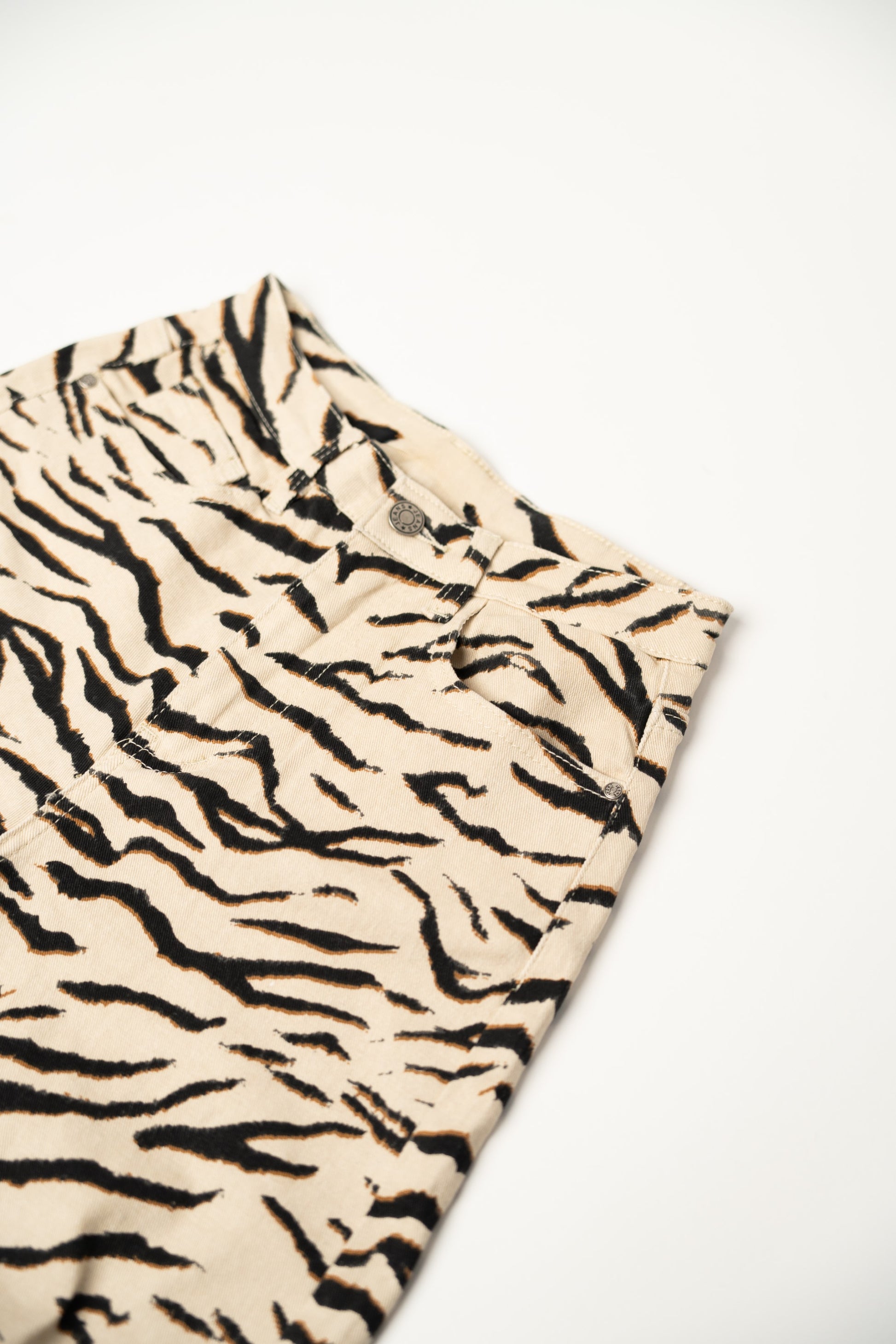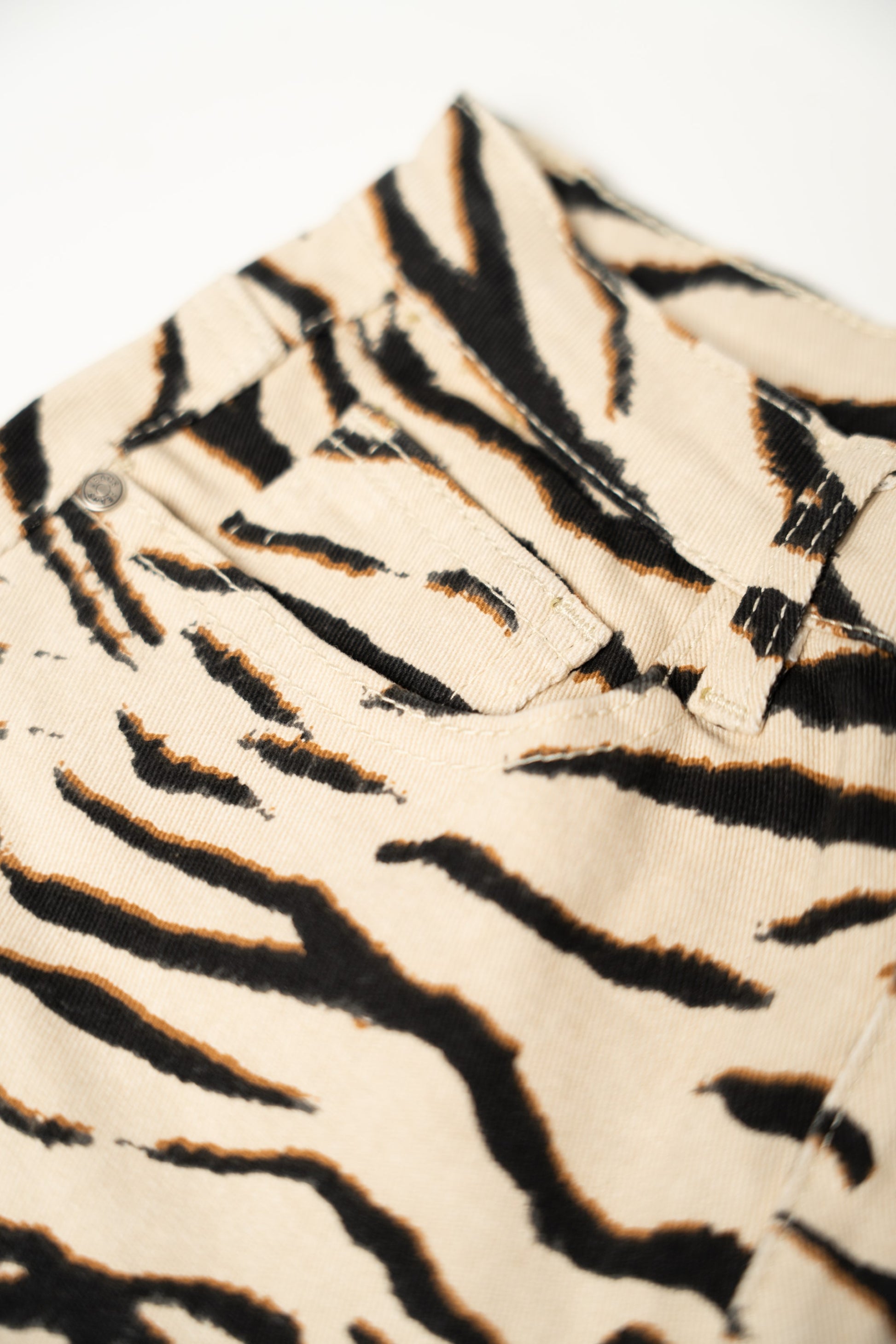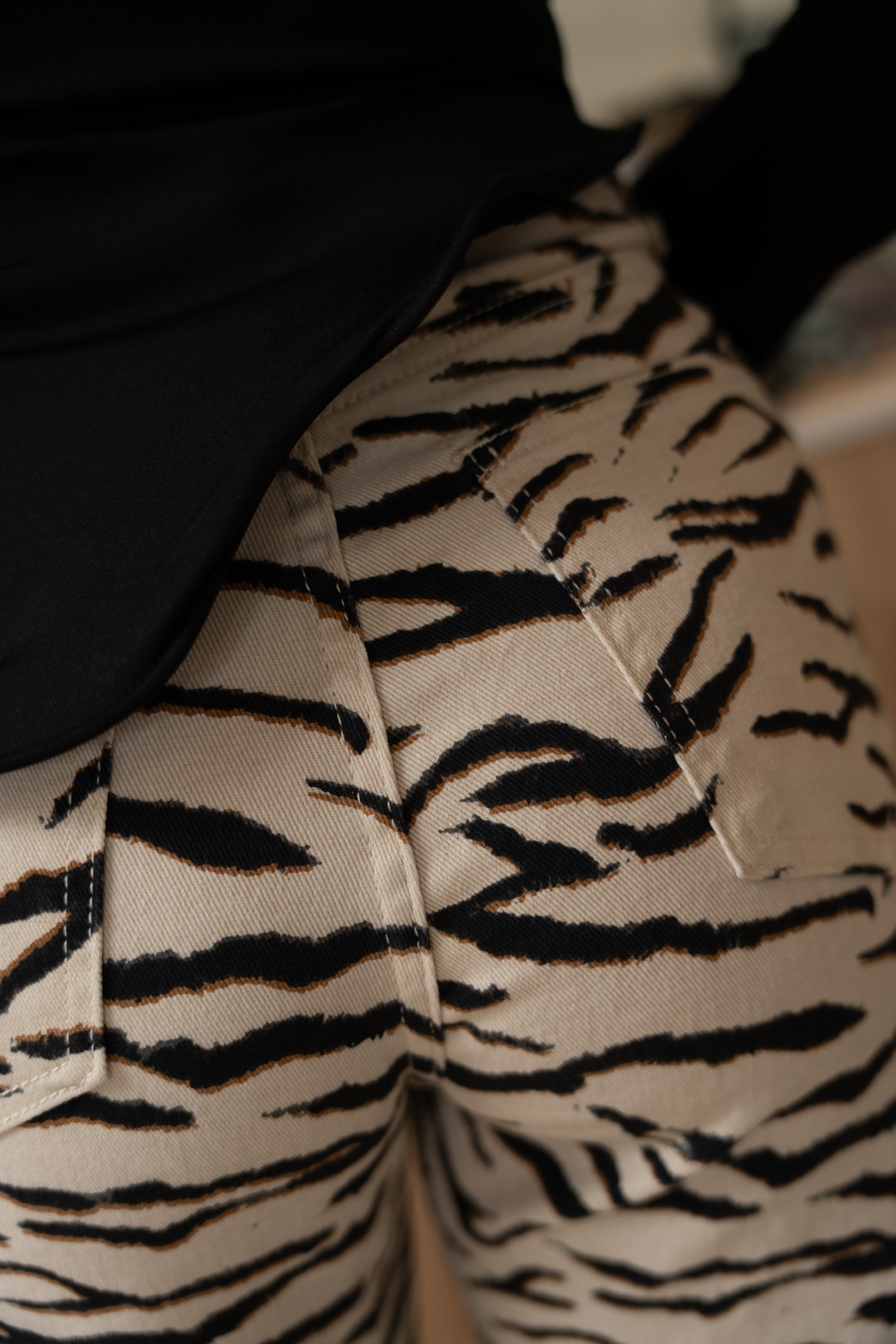 Calças com corte straight leg, com cintura subida e padrão tigre. Tem ligeira elasticidade.