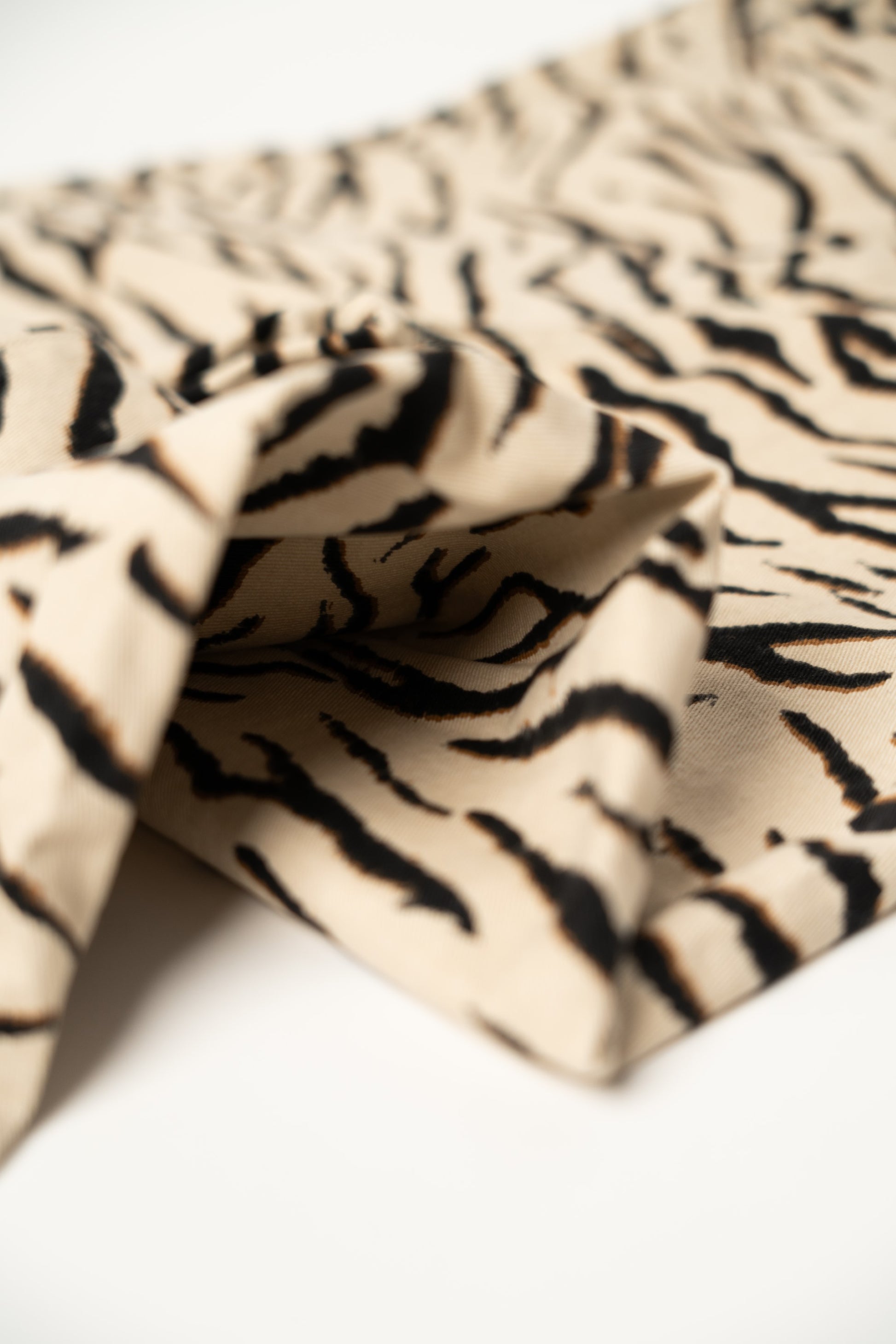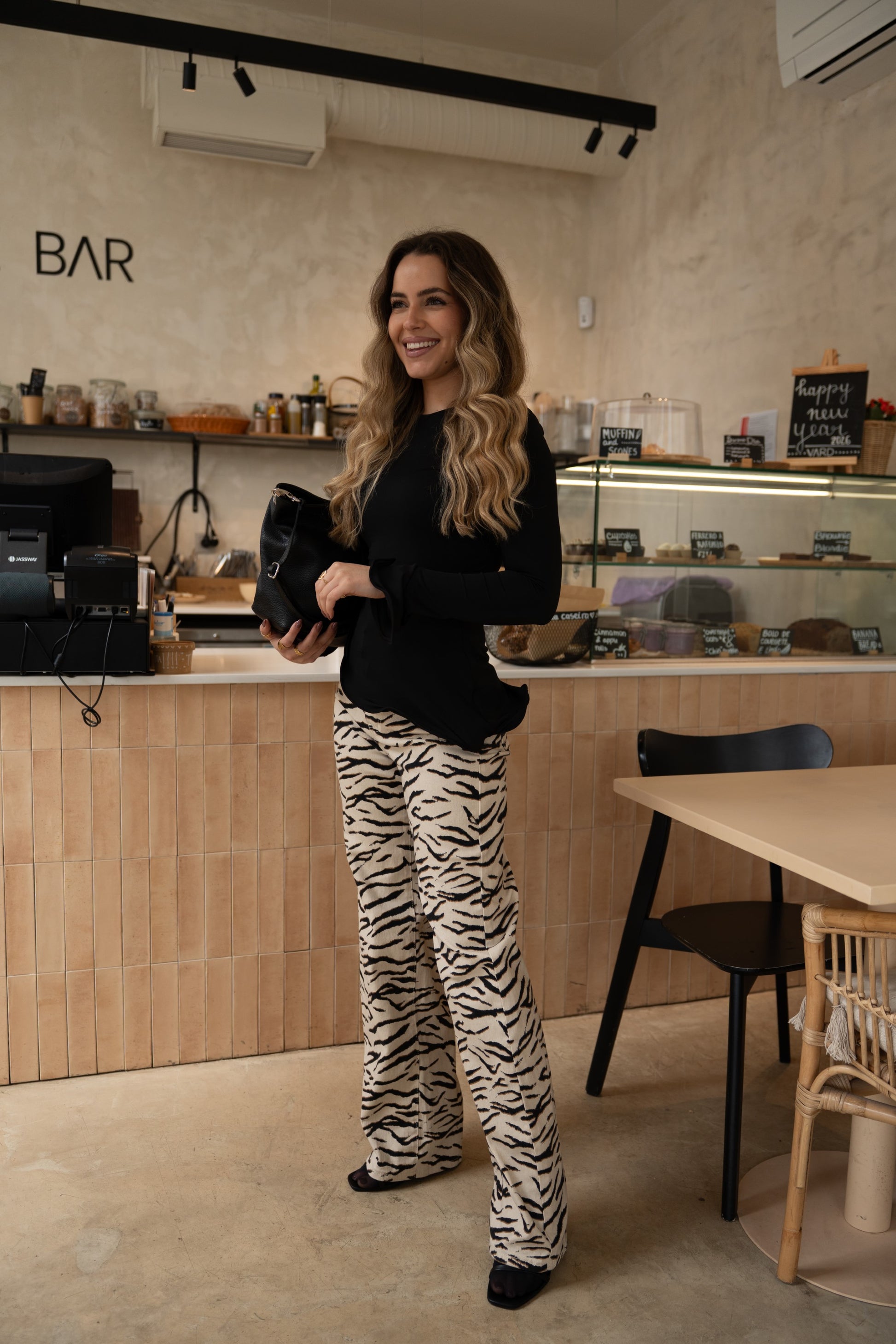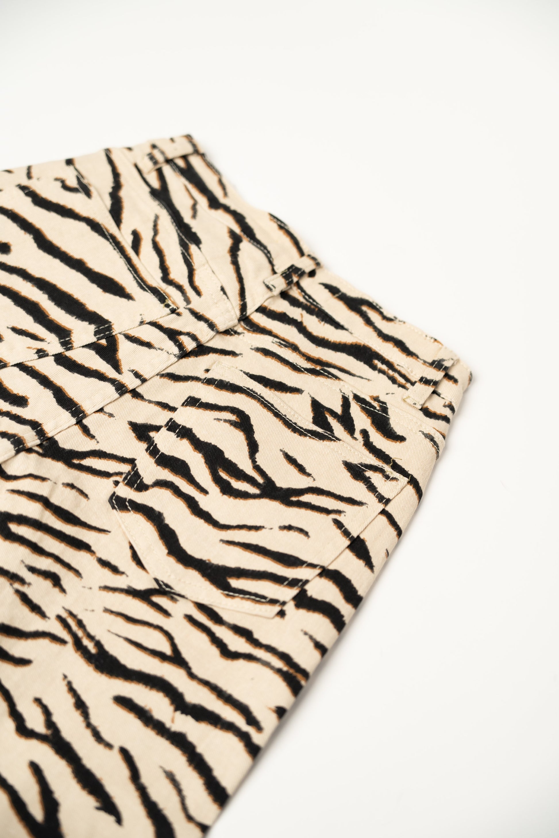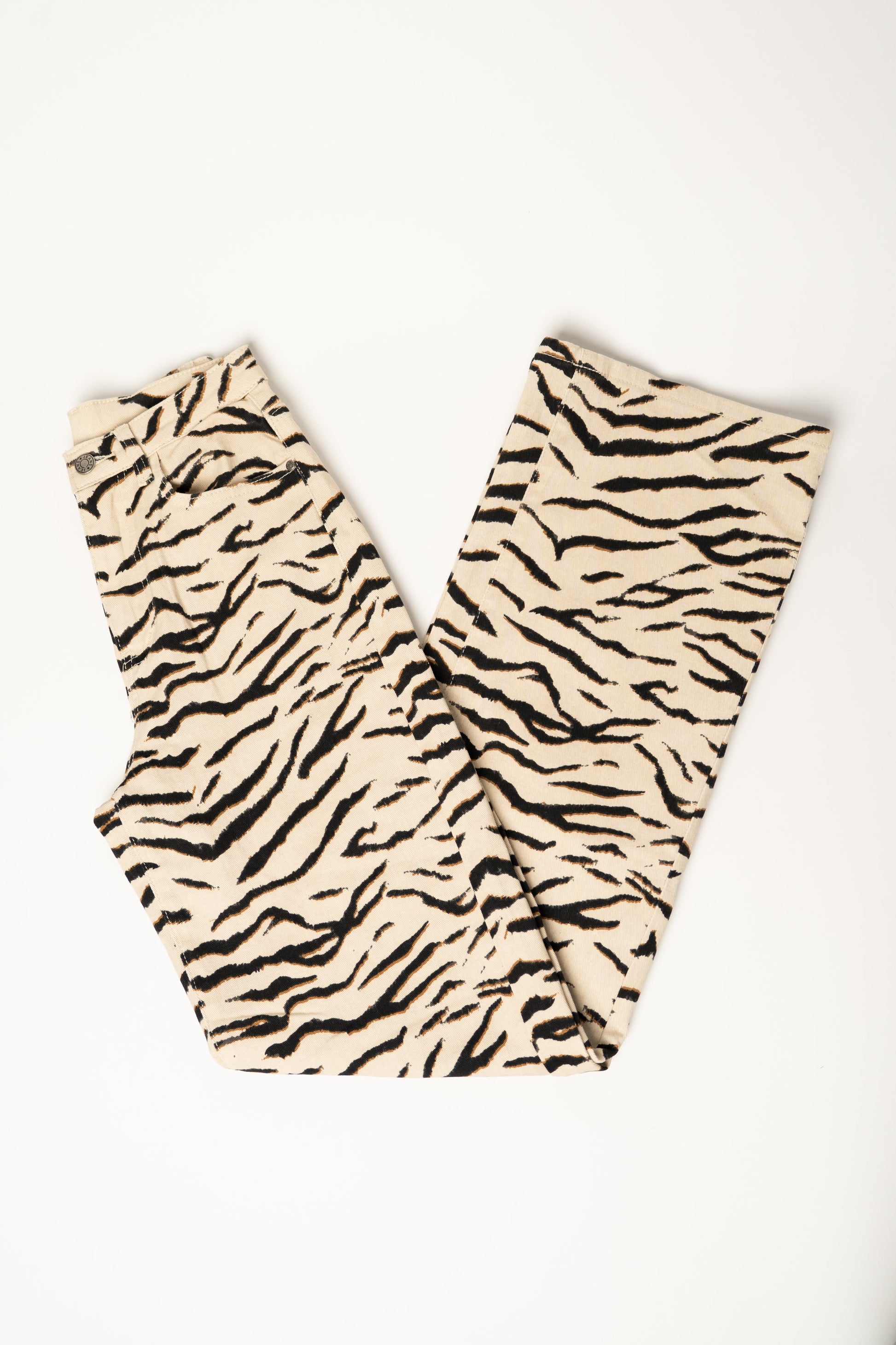 Calças com corte straight leg, com cintura subida e padrão tigre. Tem ligeira elasticidade.