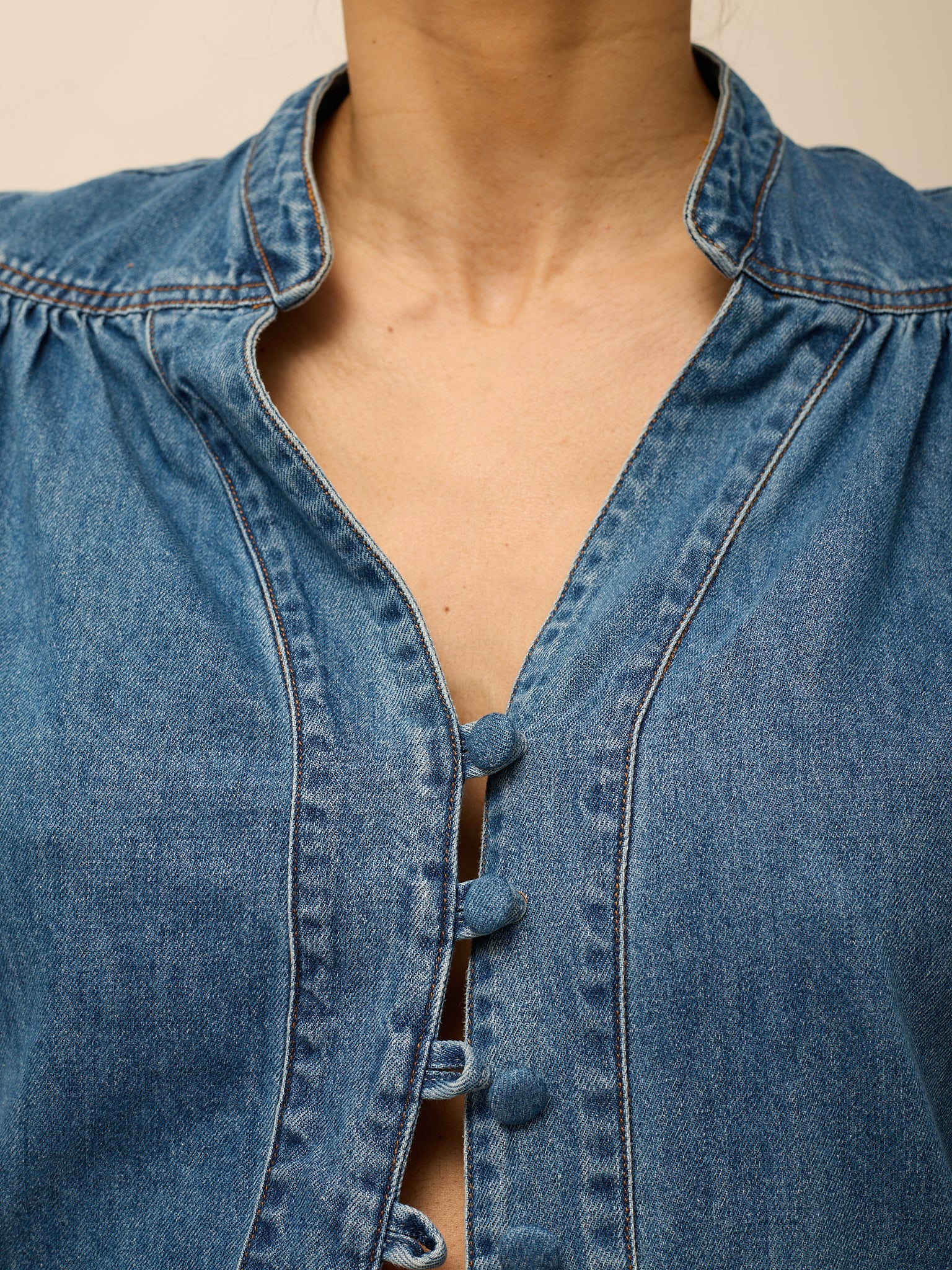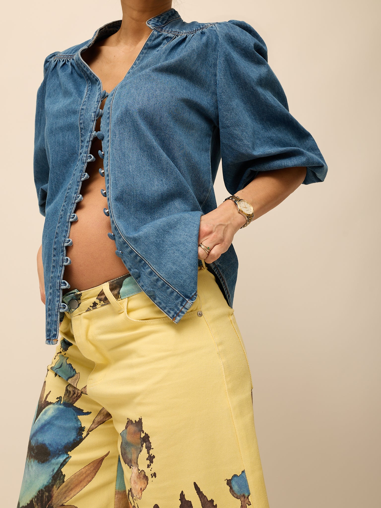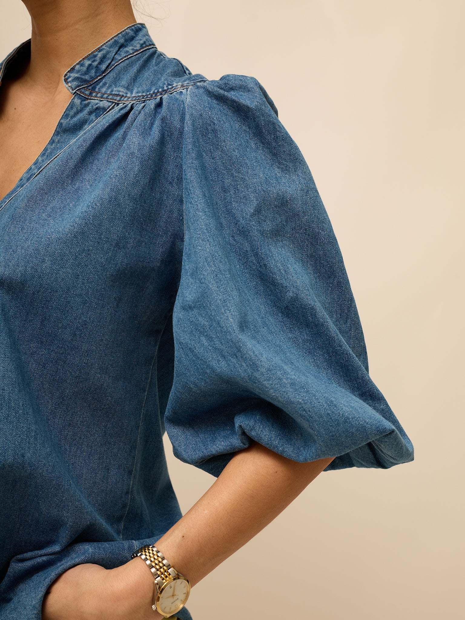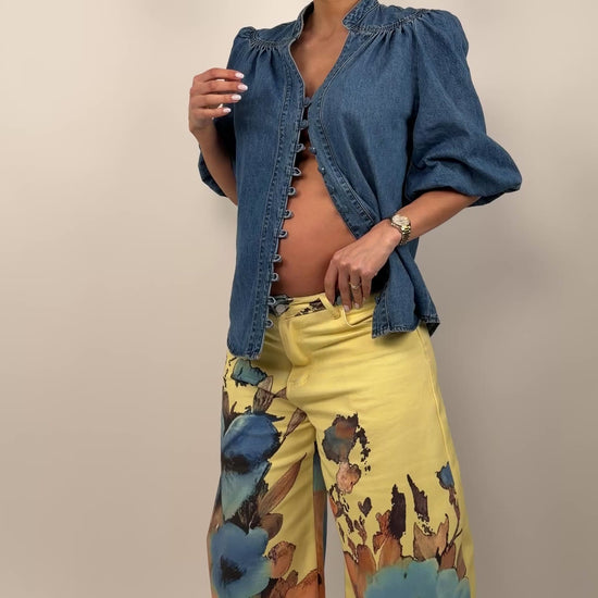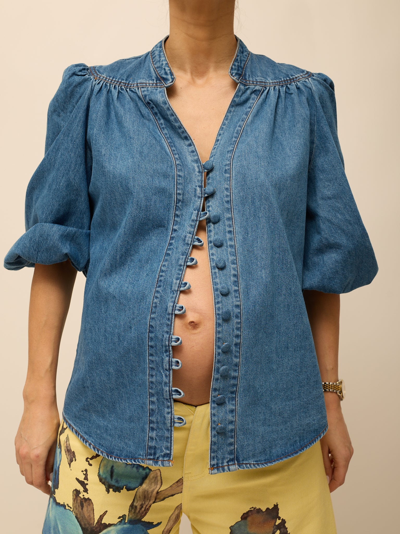 Camisa em ganga com gola de cós e botões ao longo da frente. Mangas balão a 3/4. Aperta com botões em ganga. Veste do S ao L.
