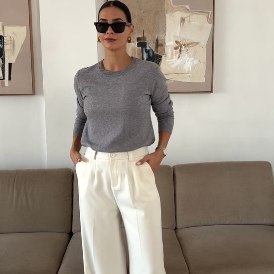 Camisola feminina em malha, macia e confortável, ideal para o dia a dia. Com design clássico e atemporal, apresenta gola redonda, mangas compridas e acabamento canelado nos punhos e na bainha. Versátil e prática, pode ser usada sozinha ou como sobreposição em camisas, criando looks casuais ou mais elegantes.