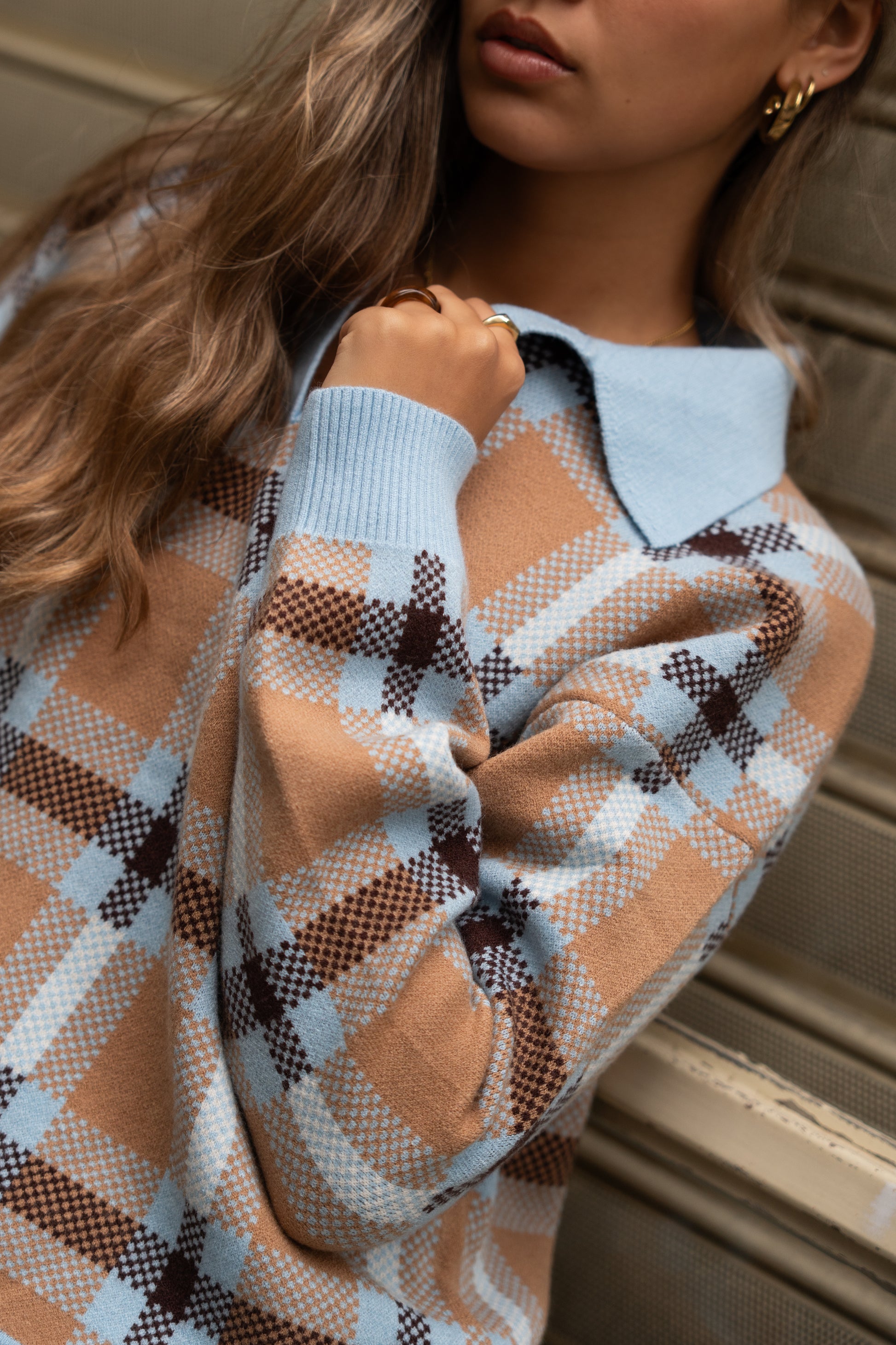 Camisola em malha com punhos canelados, decote em V e gola azul.