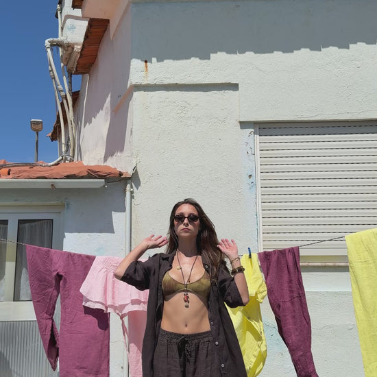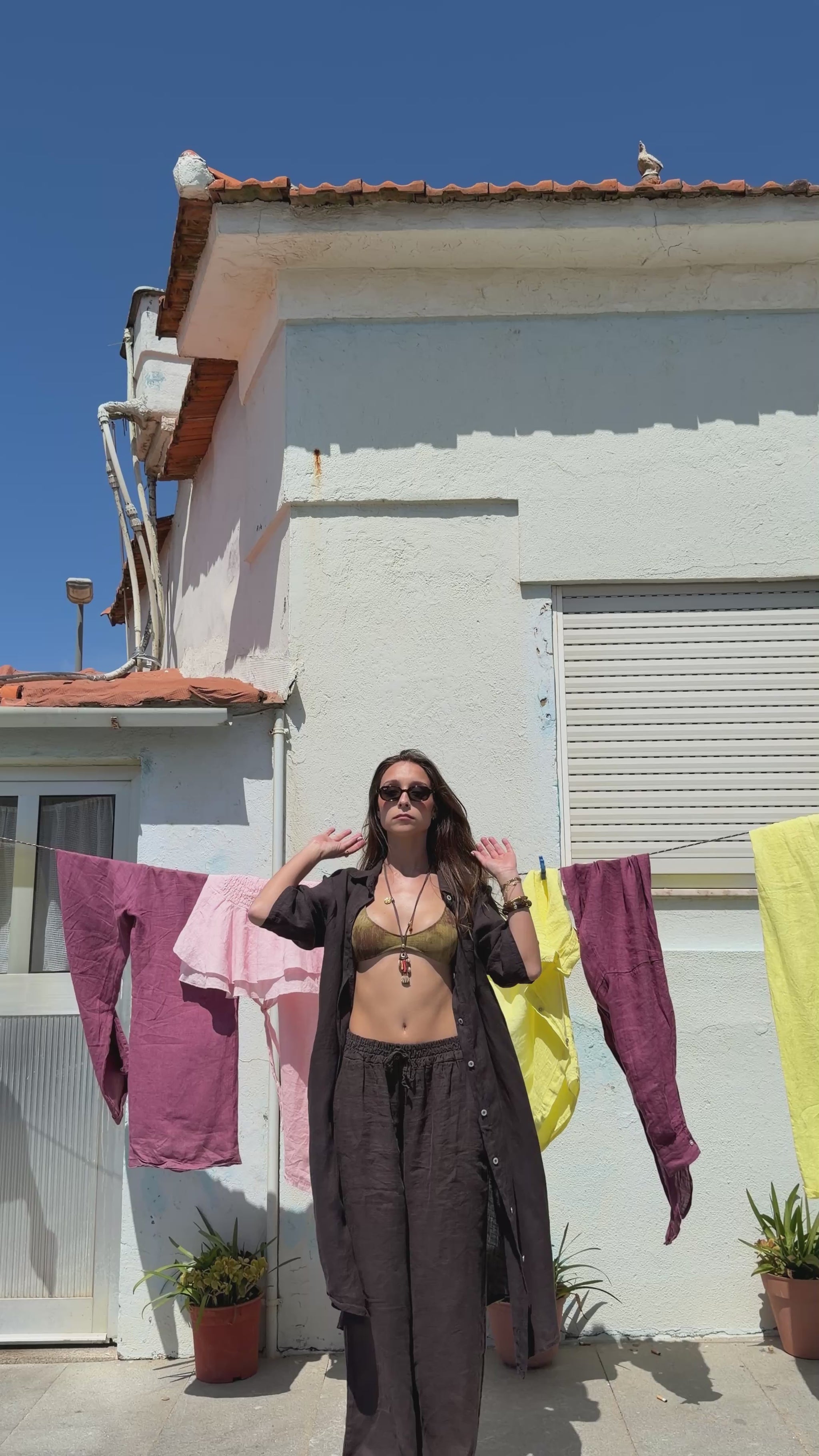 Cada peça em linho é tingida manualmente, tornando cada conjunto único. Pequenas variações de tom entre o top e as calças podem ocorrer naturalmente, refletindo o processo artesanal.