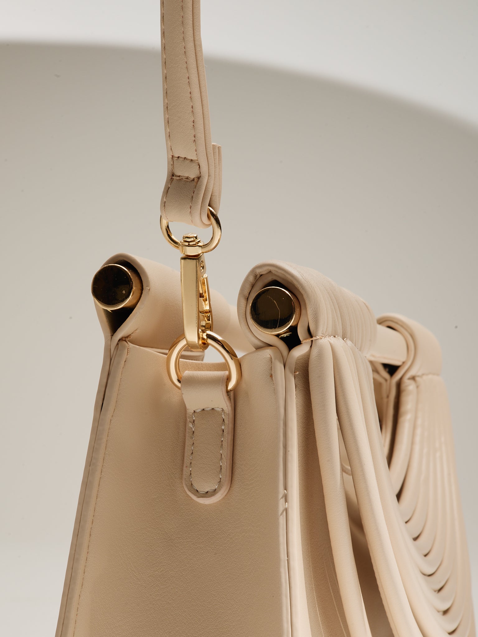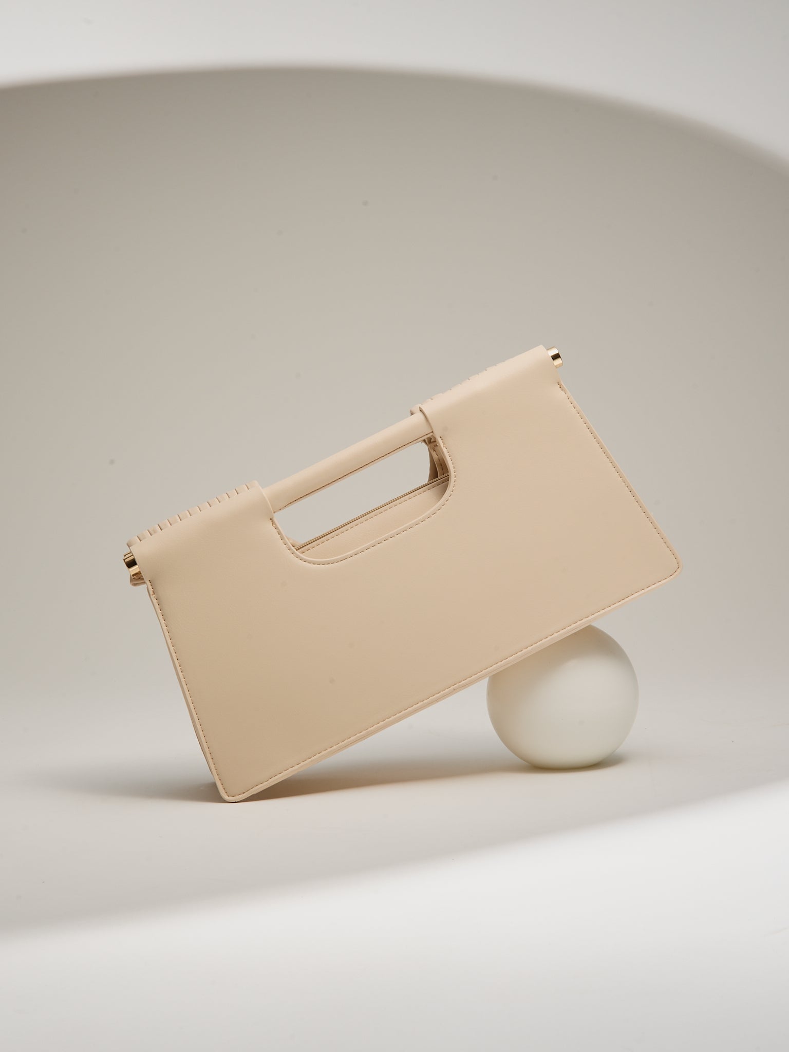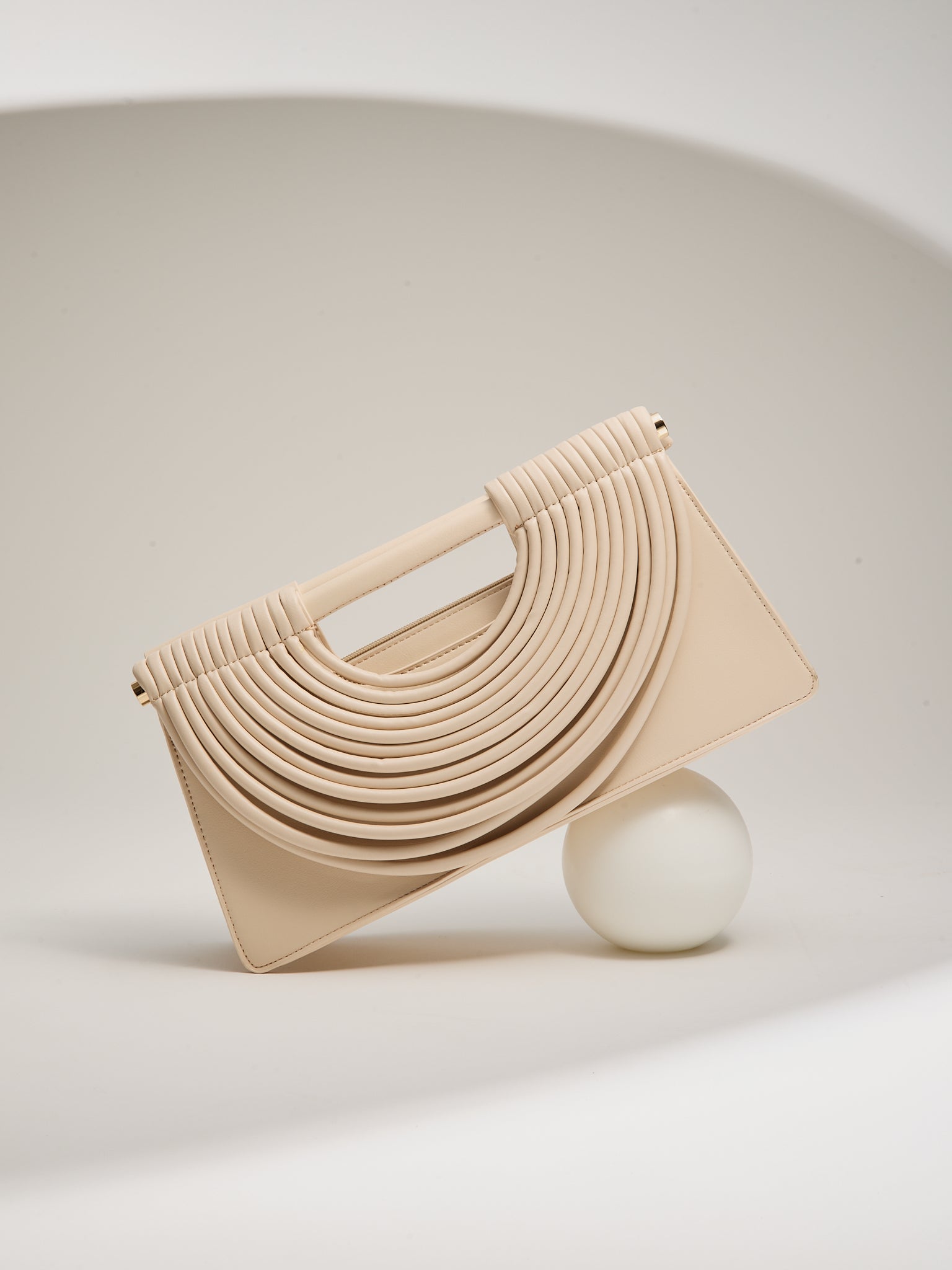 Mala clutch estruturada em tom bege claro, com design moderno e sofisticado. Destaca-se pelo detalhe frontal em arcos sobrepostos, criando um efeito escultural e elegante. Fecha com fecho zíper. Possui alça rígida integrada e acabamentos metálicos dourados. Tem alça removível.