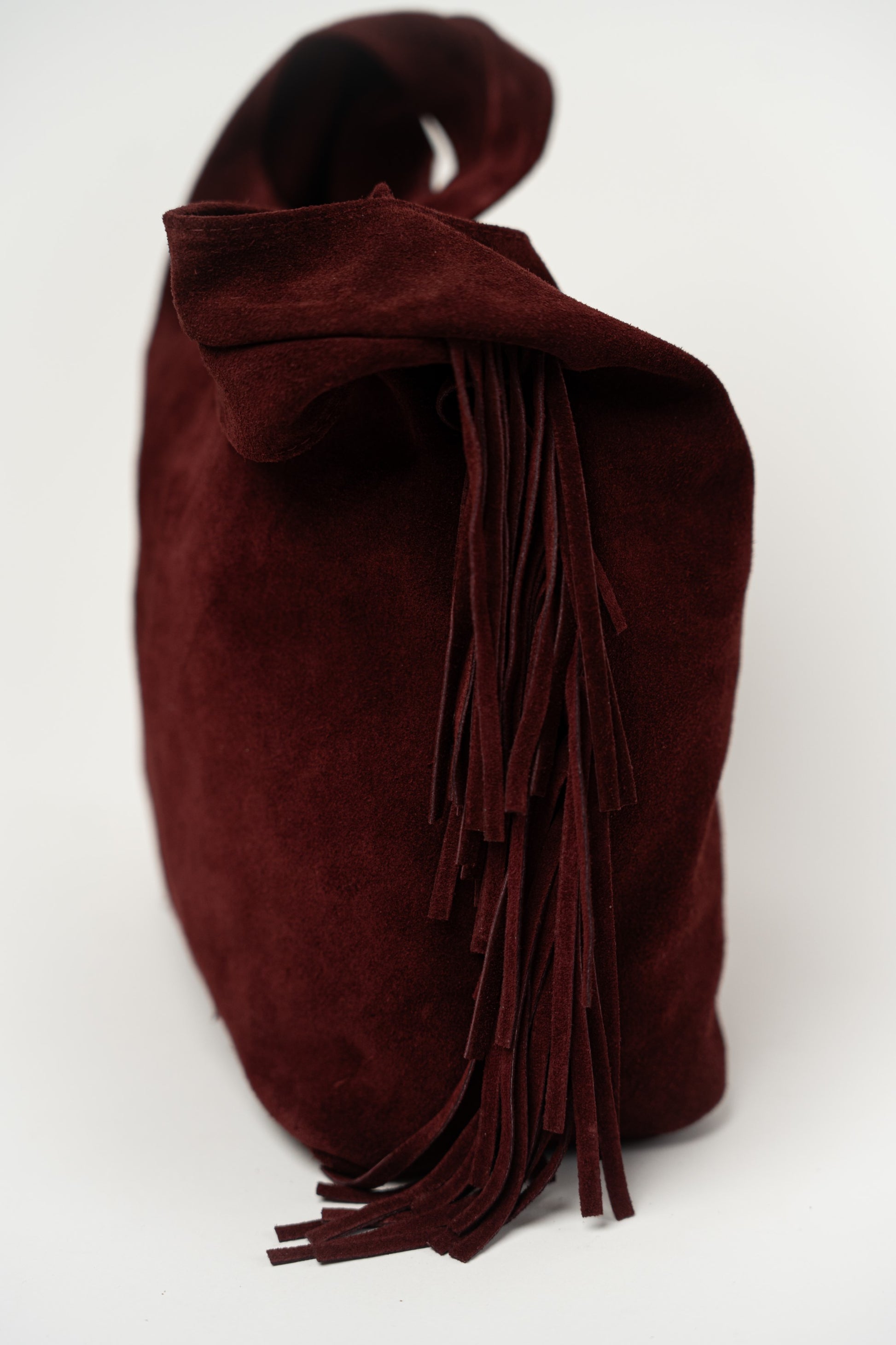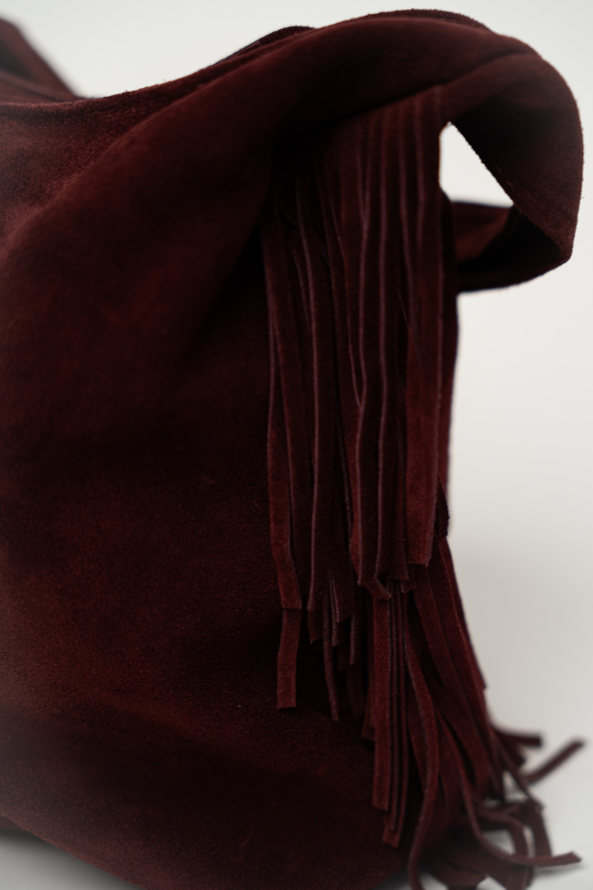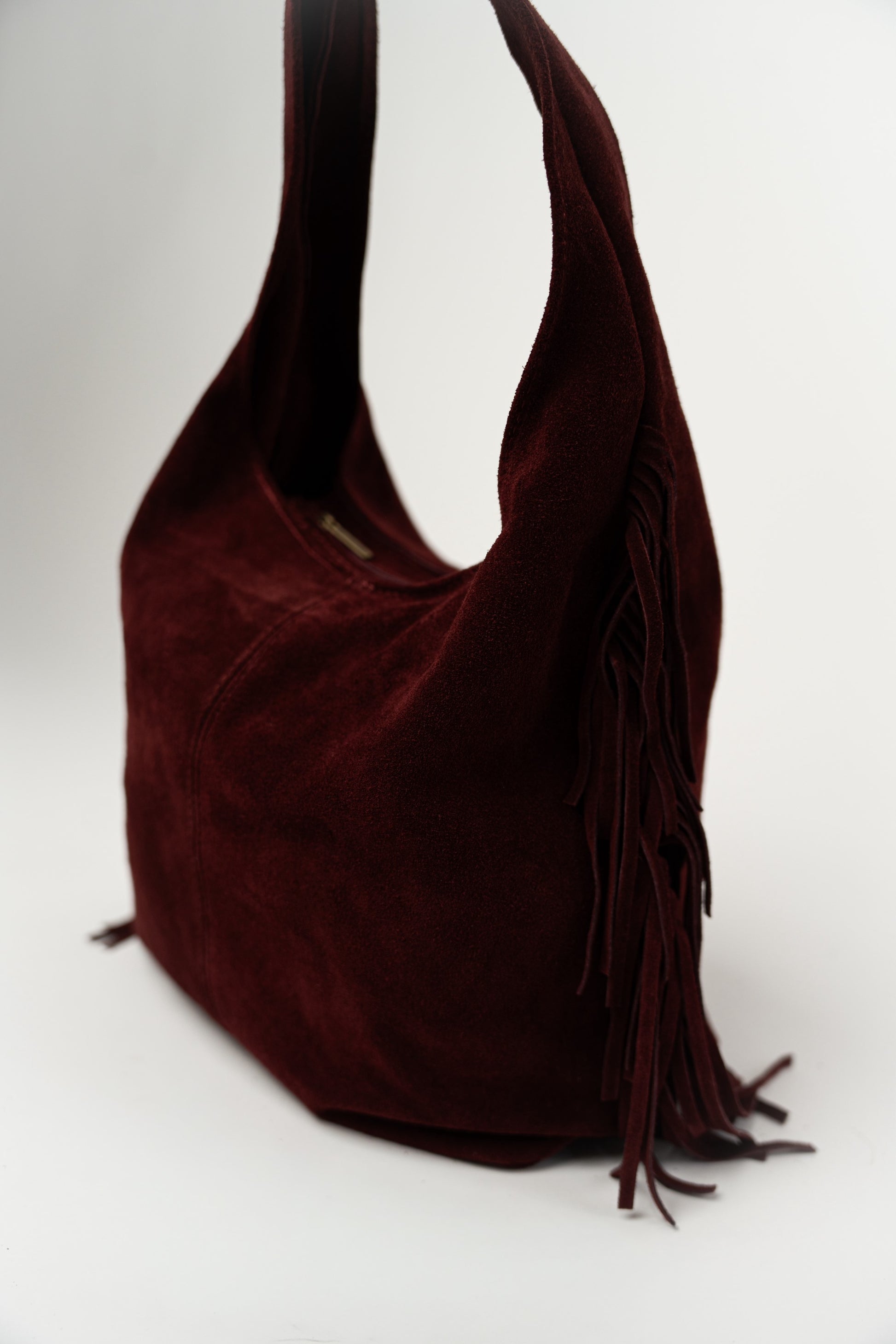 Mala de ombro grande, em pele pêssego e com bolsa interior. Pespontos marcados. Franjas compridas laterais. Fecho com fecho de correr em Bordeaux.