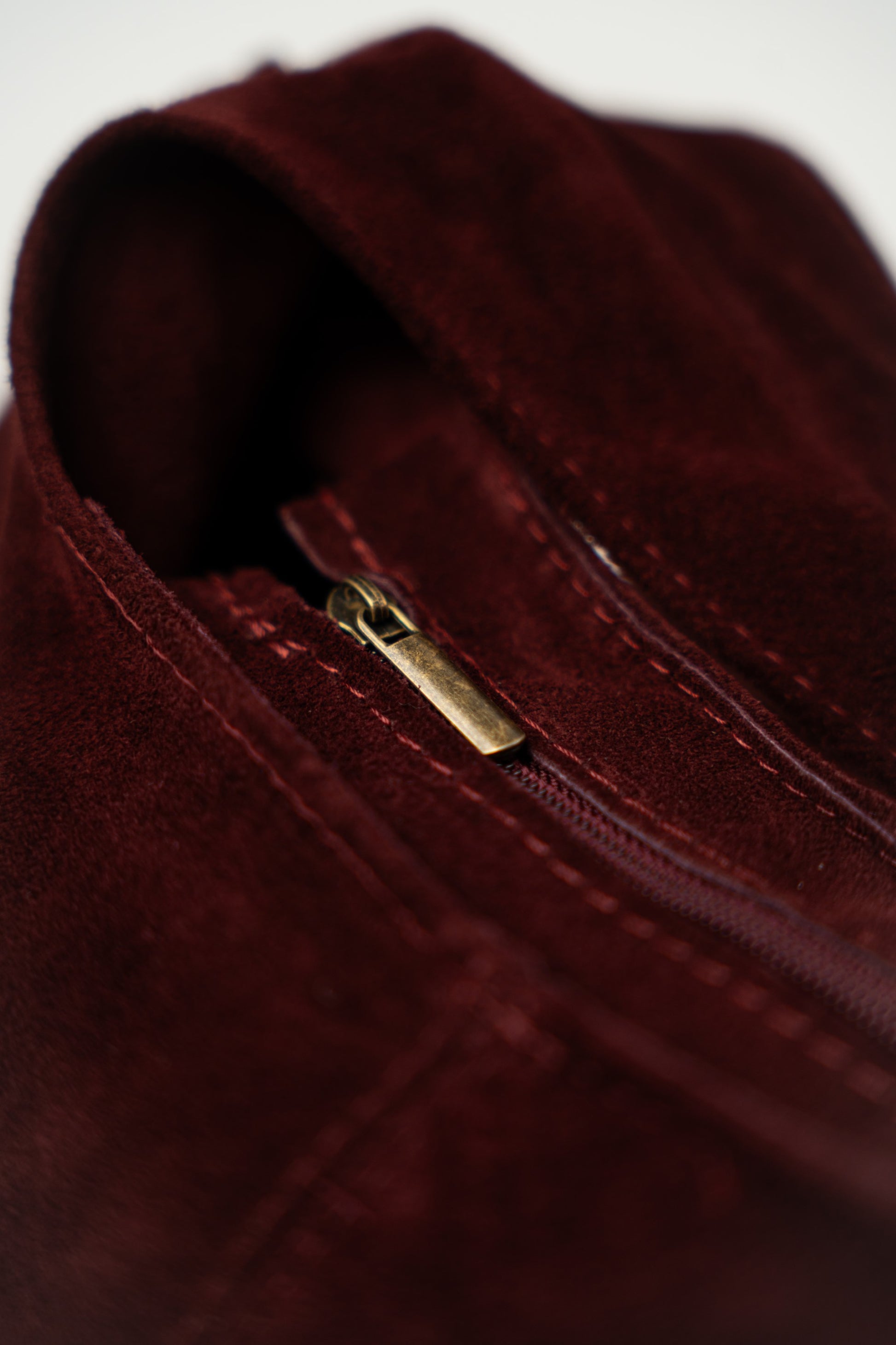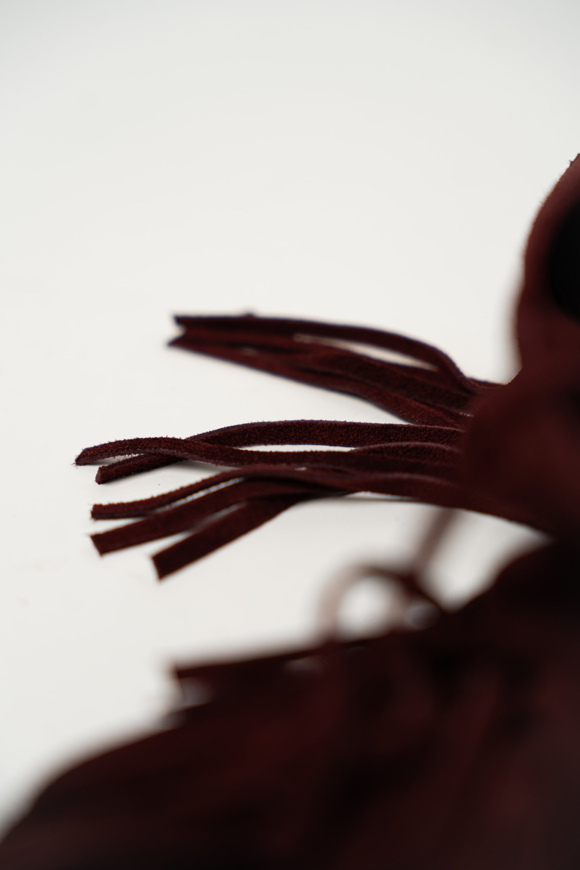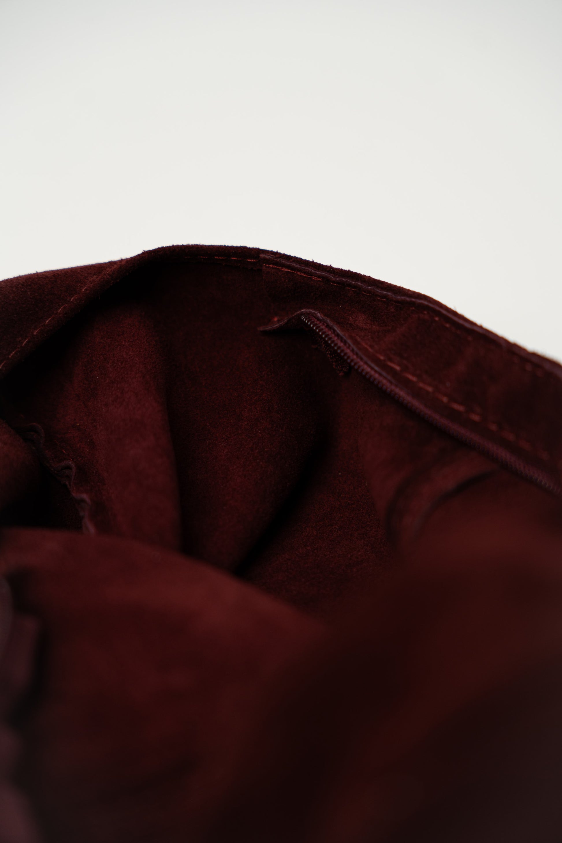 Mala de ombro grande, em pele pêssego e com bolsa interior. Pespontos marcados. Franjas compridas laterais. Fecho com fecho de correr em Bordeaux.