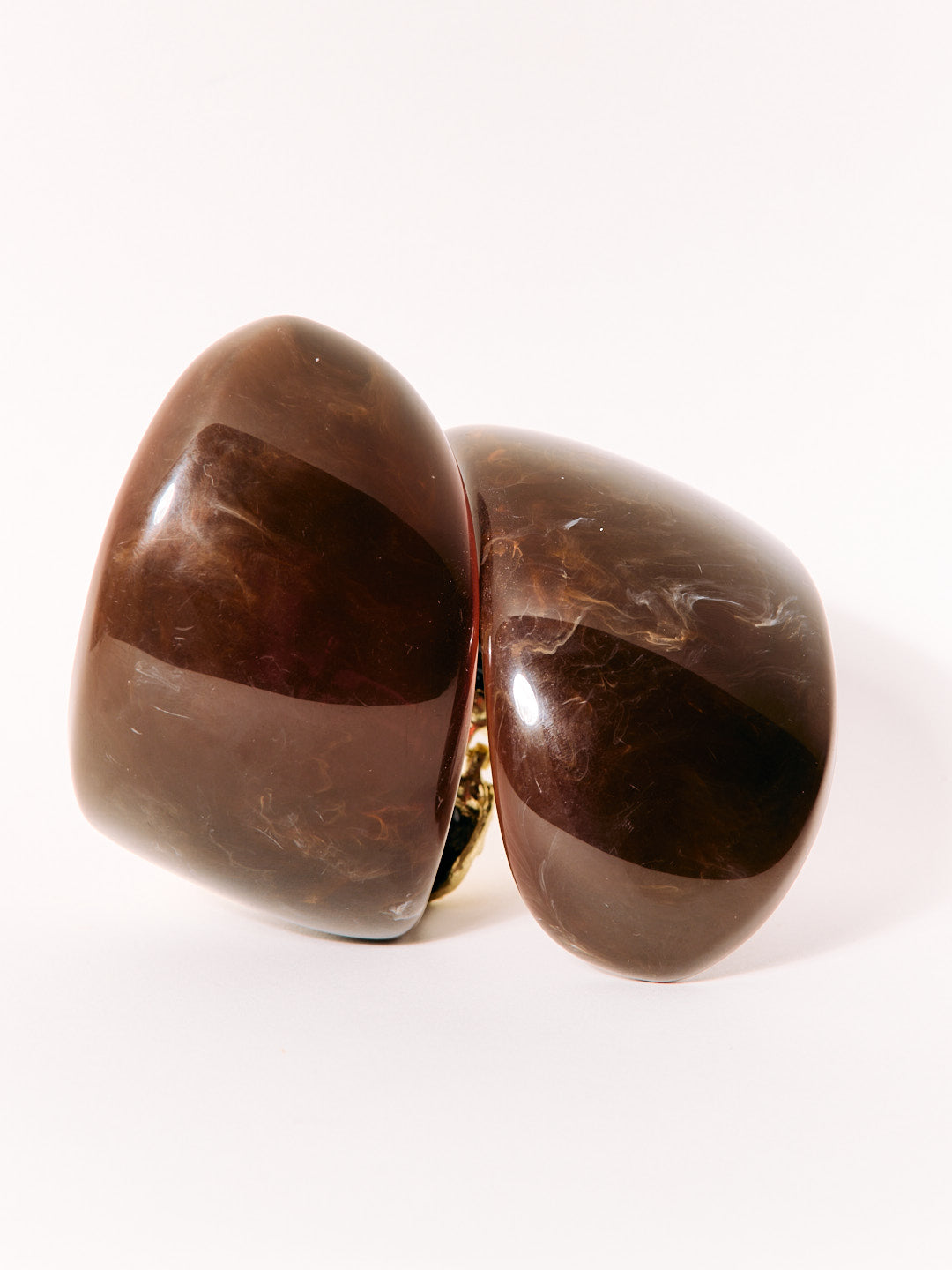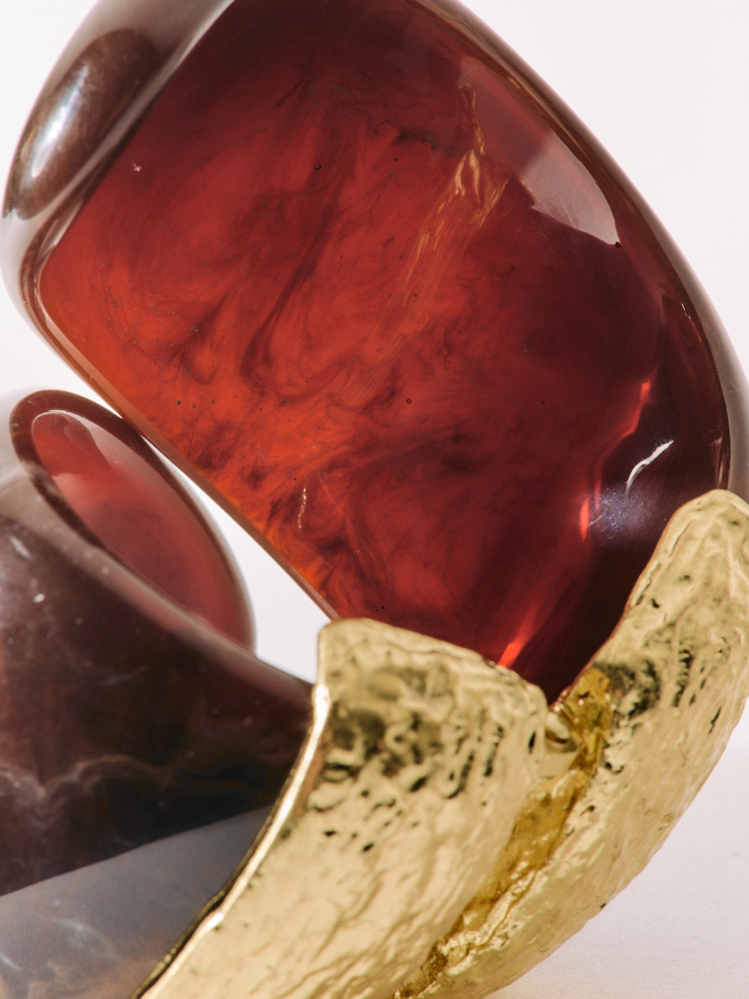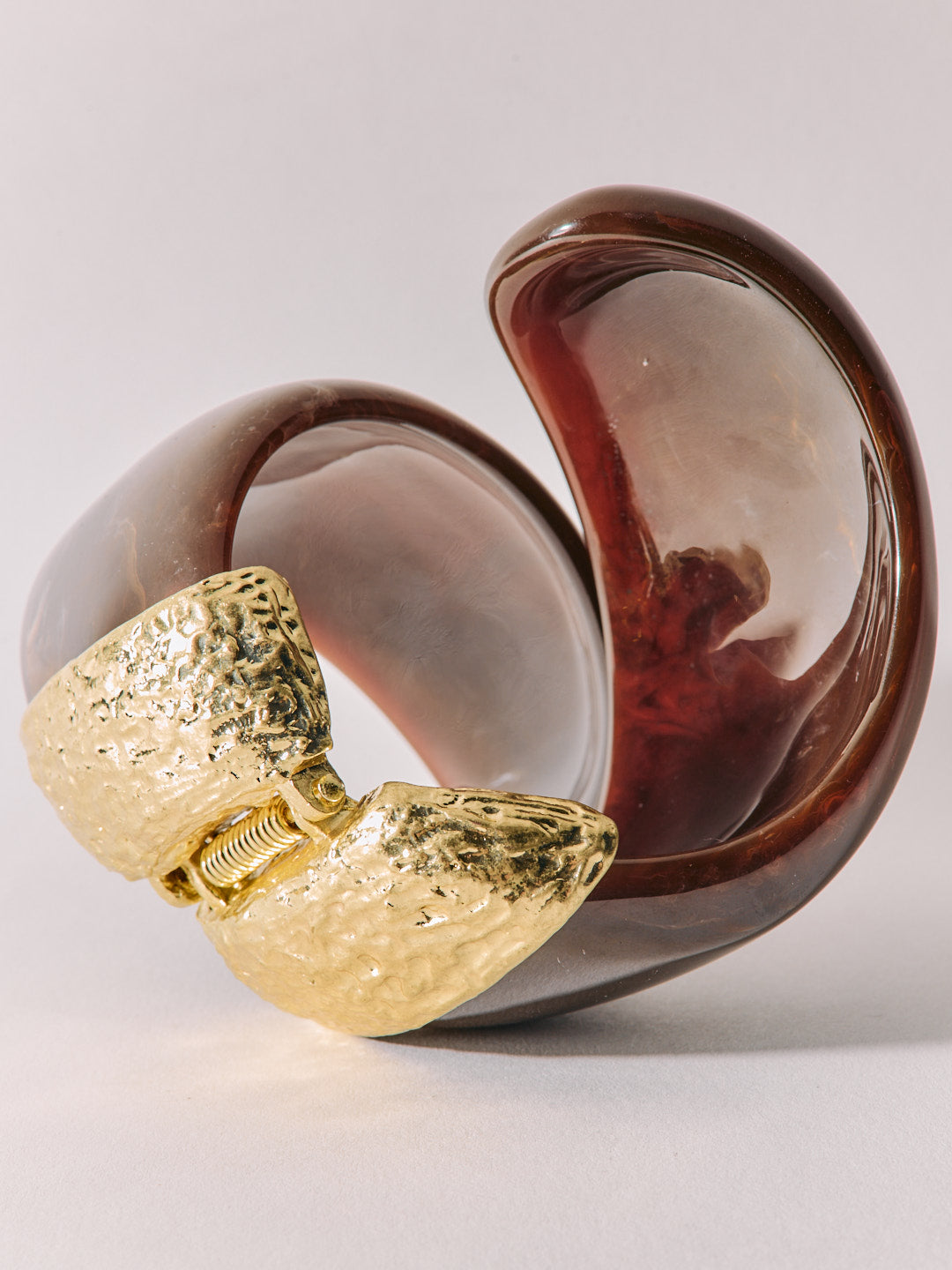 Pulseira rígida confecionada em resina com acabamento polido. O design destaca-se pela sua silhueta assimétrica e volumosa, apresentando um sofisticado efeito marmoreado em tons de âmbar e chocolate. Detalhe dourado texturizado com efeito mola.