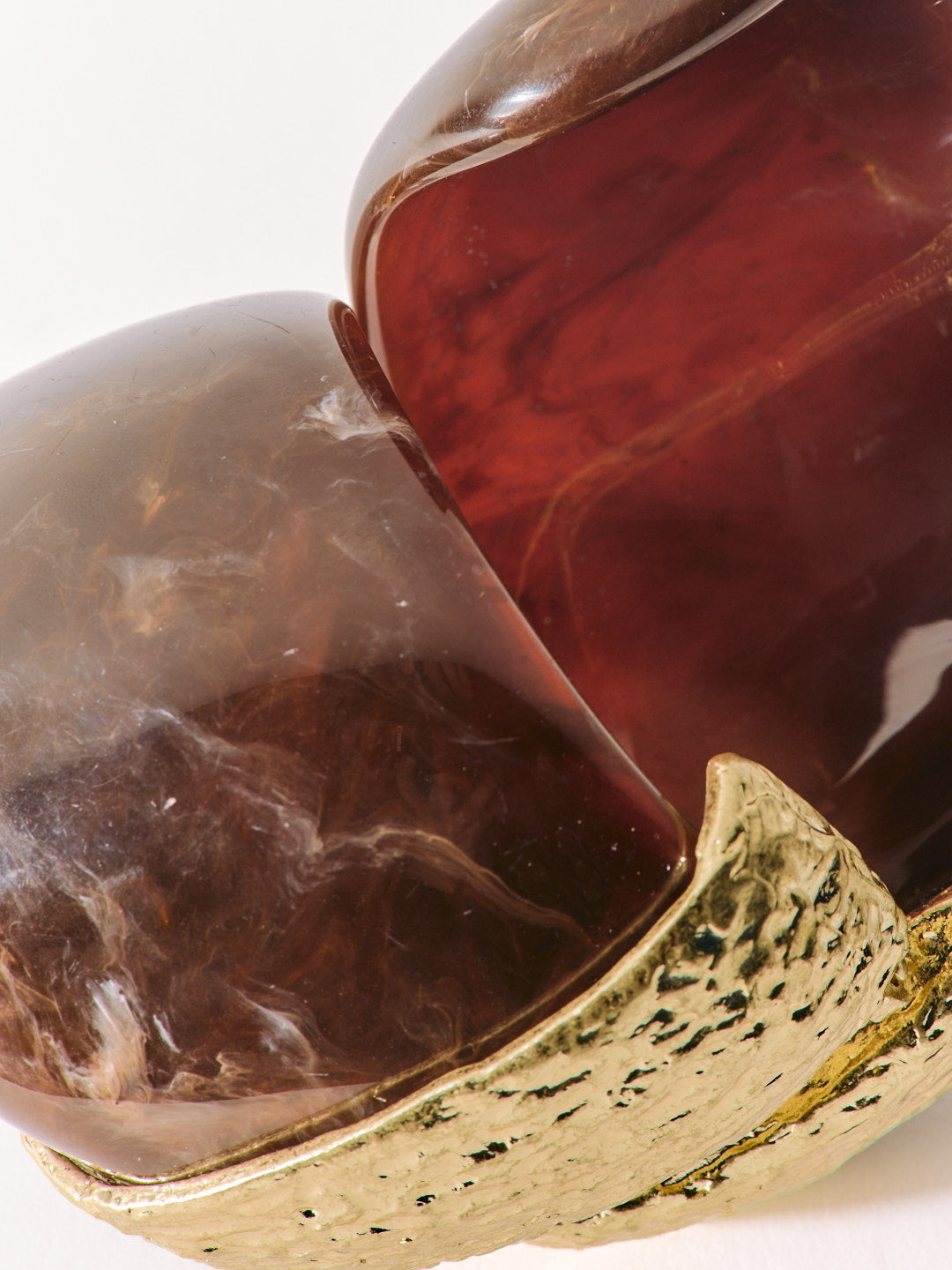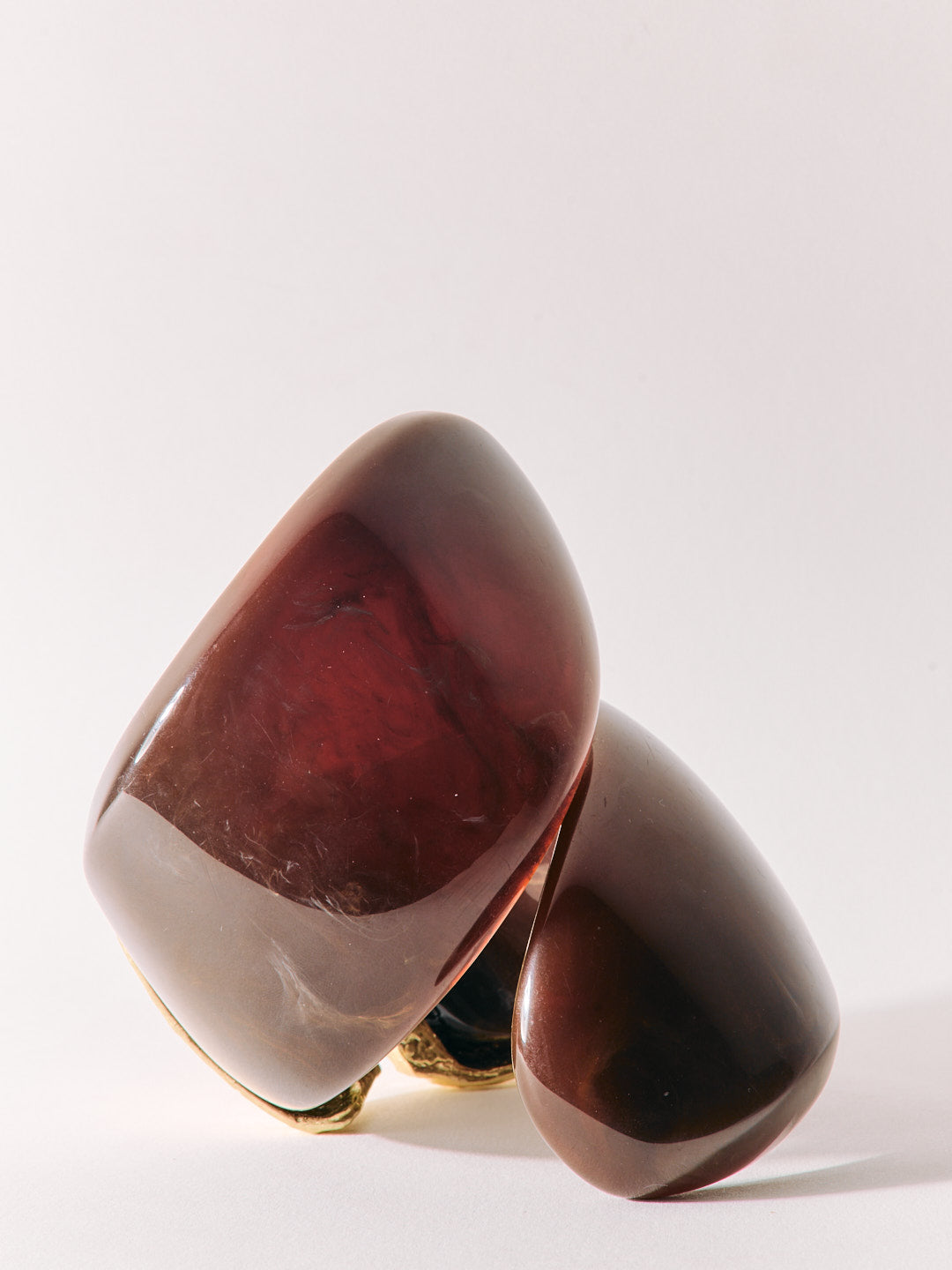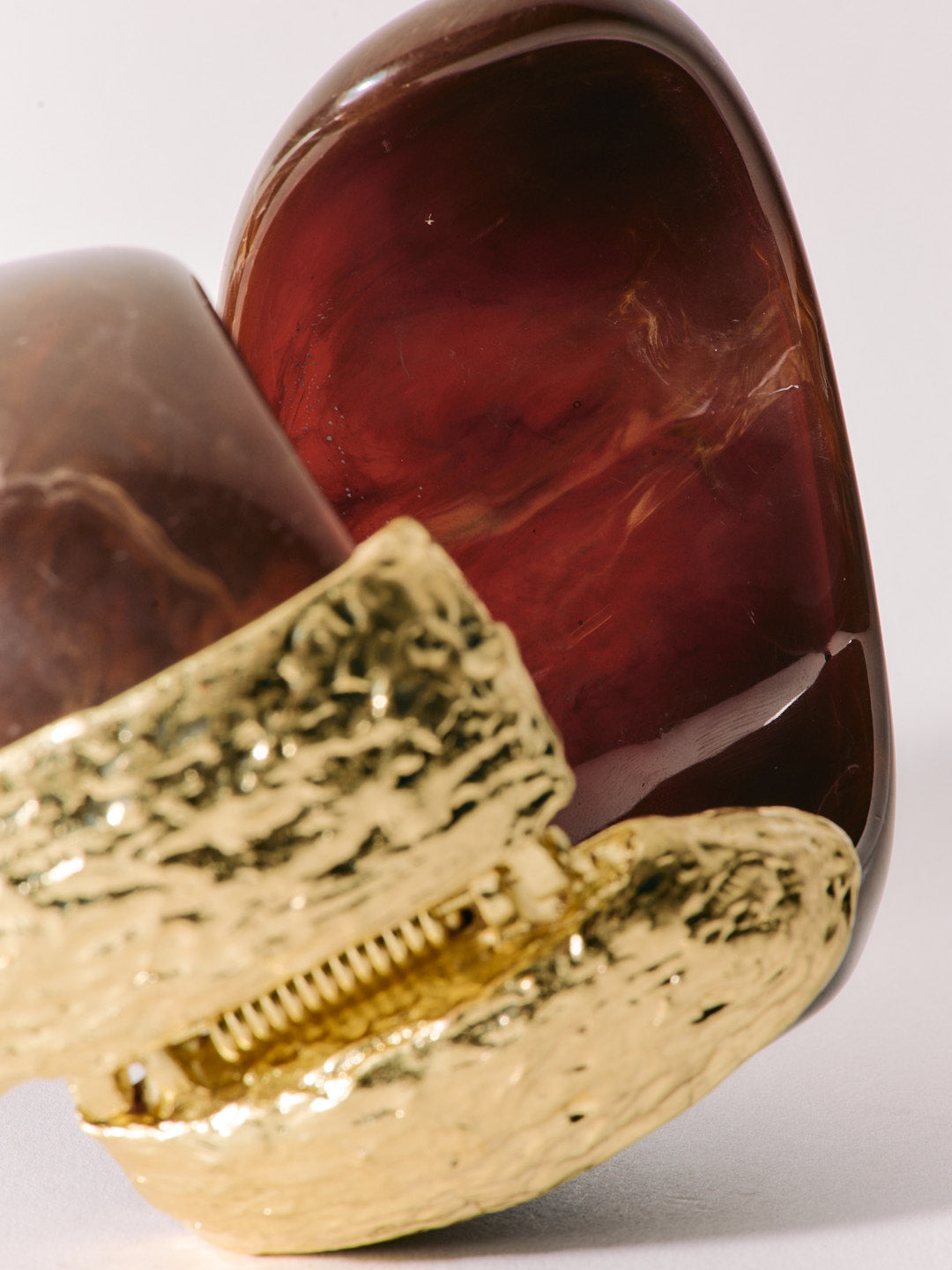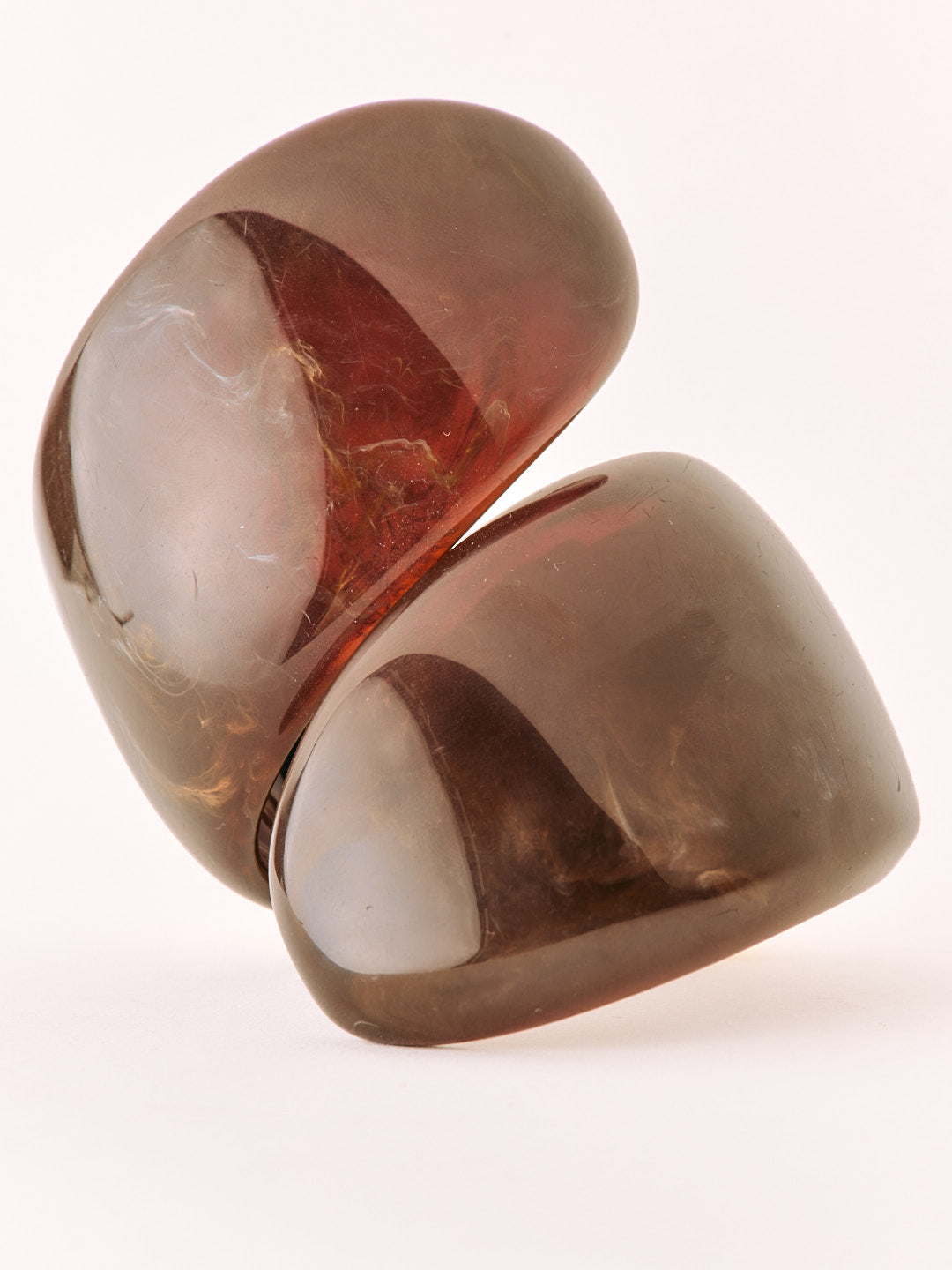 Pulseira rígida confecionada em resina com acabamento polido. O design destaca-se pela sua silhueta assimétrica e volumosa, apresentando um sofisticado efeito marmoreado em tons de âmbar e chocolate. Detalhe dourado texturizado com efeito mola.