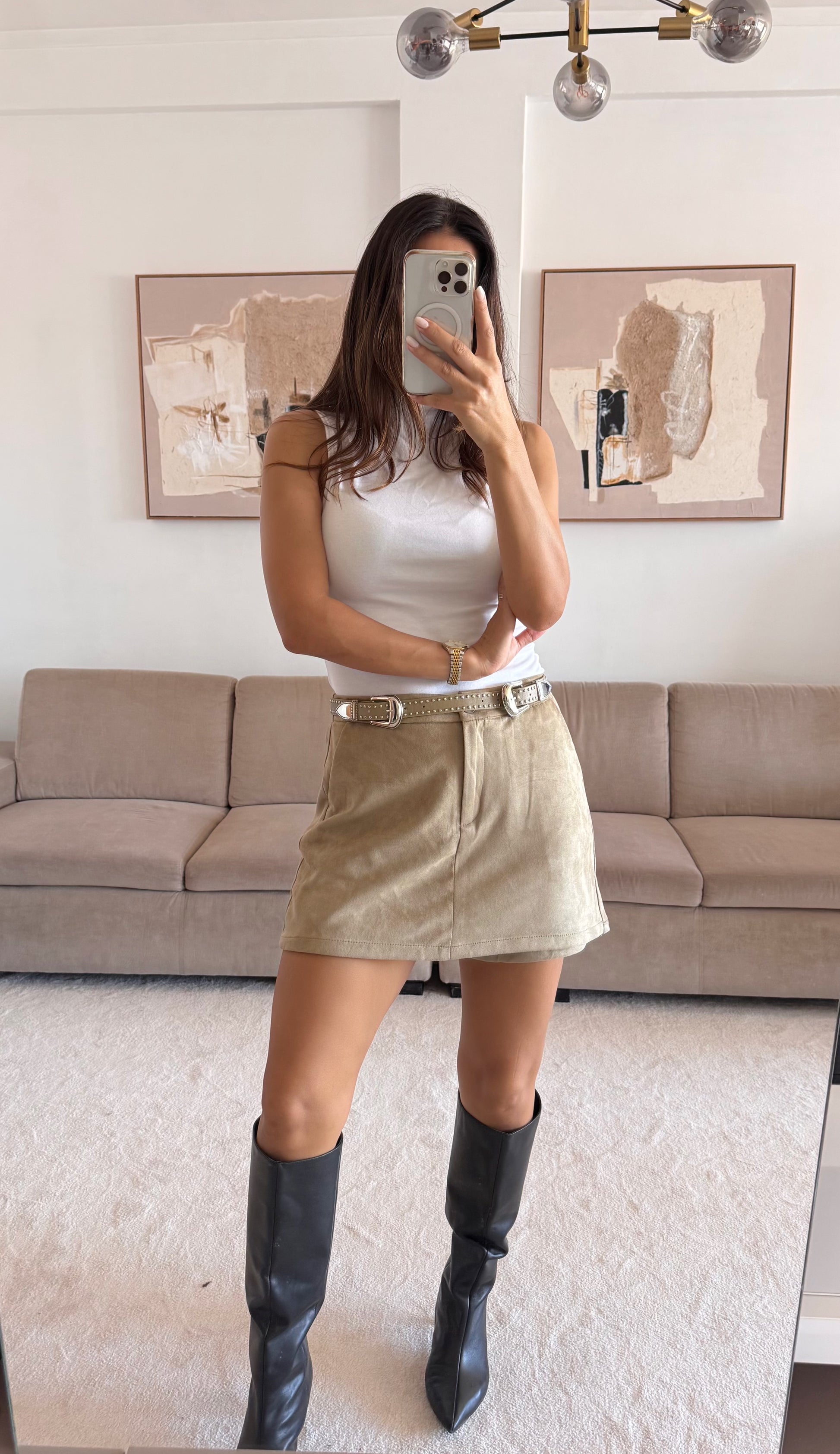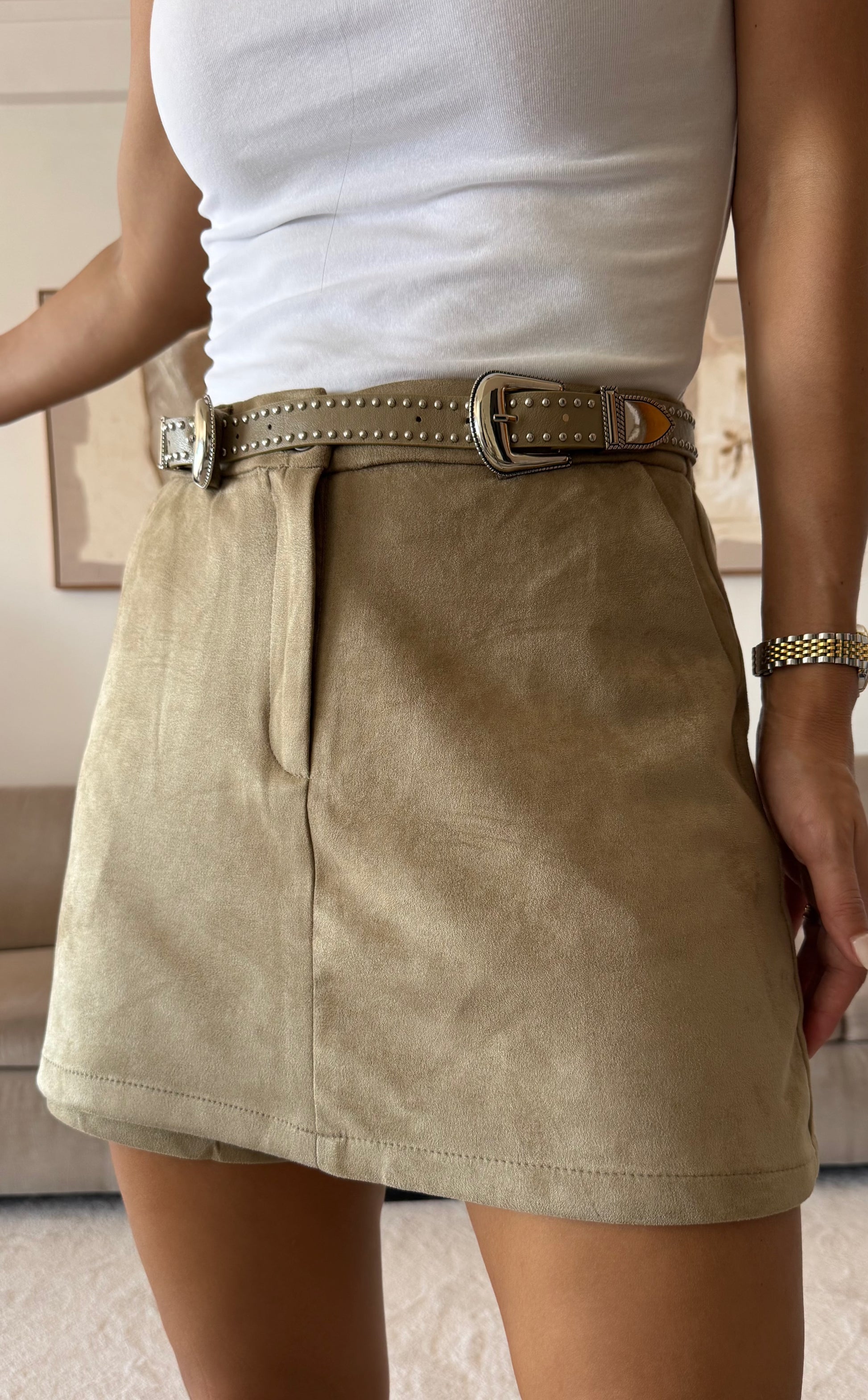 Saia-calção feminina em tom bege, ideal para a nova estação. O design moderno une a liberdade dos calções ao visual sofisticado de uma saia, oferecendo conforto sem comprometer o estilo. Confeccionada em tecido pele pêssego e elasticidade na cintura, esta peça apresenta um corte curto e fluido. Com cinto incluído, com tachas metálicas e fivela prateada, que valoriza a cintura e adiciona um toque trendy ao conjunto.