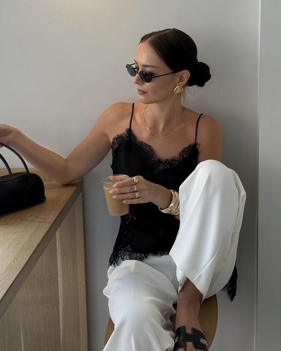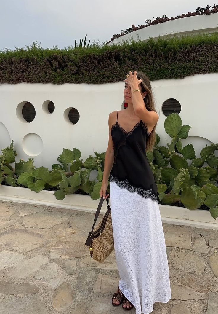 Top acetinado com decote em bico e alças finas. Pormenor de aplicação de renda. Bainha assimétrica.