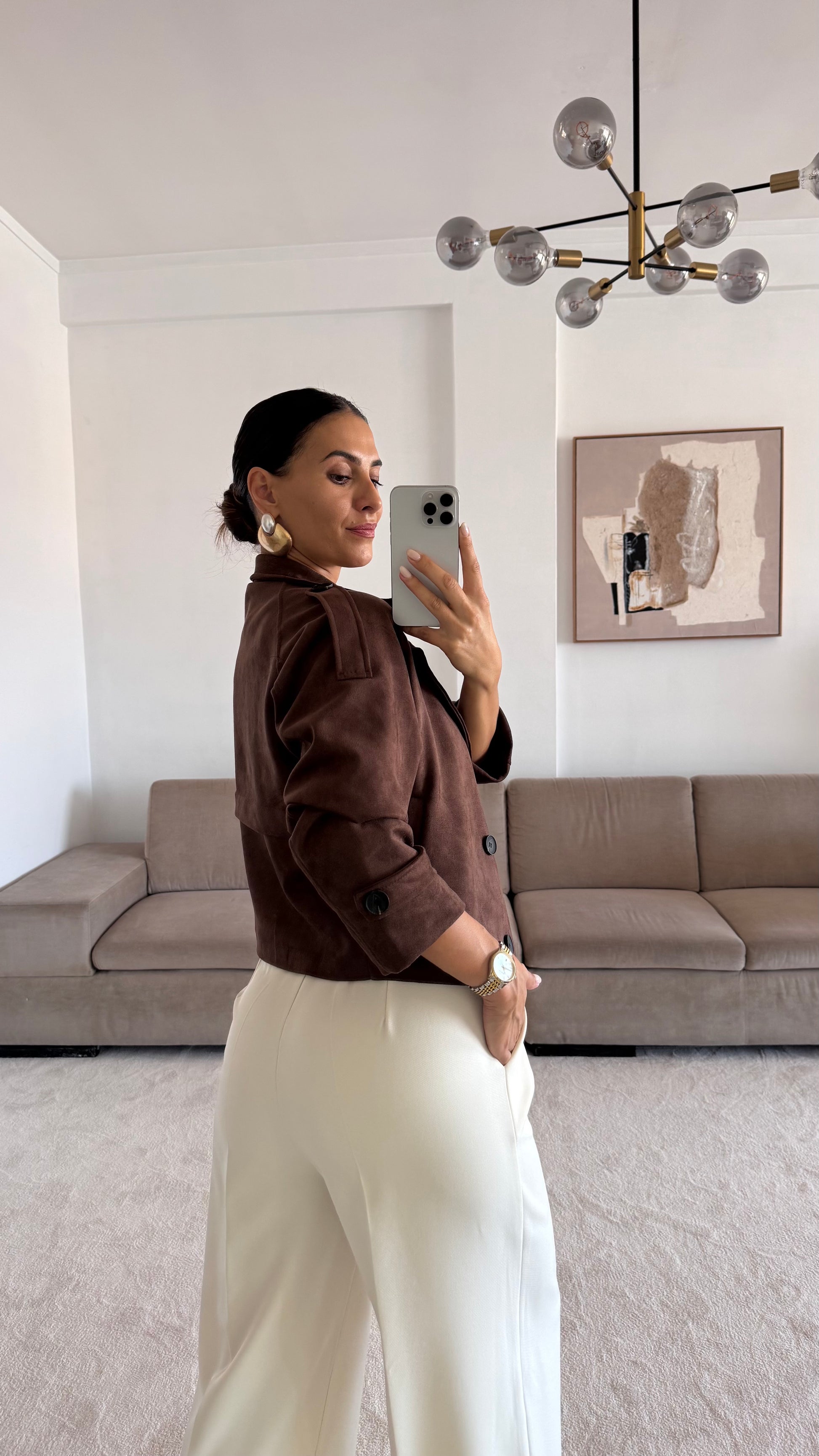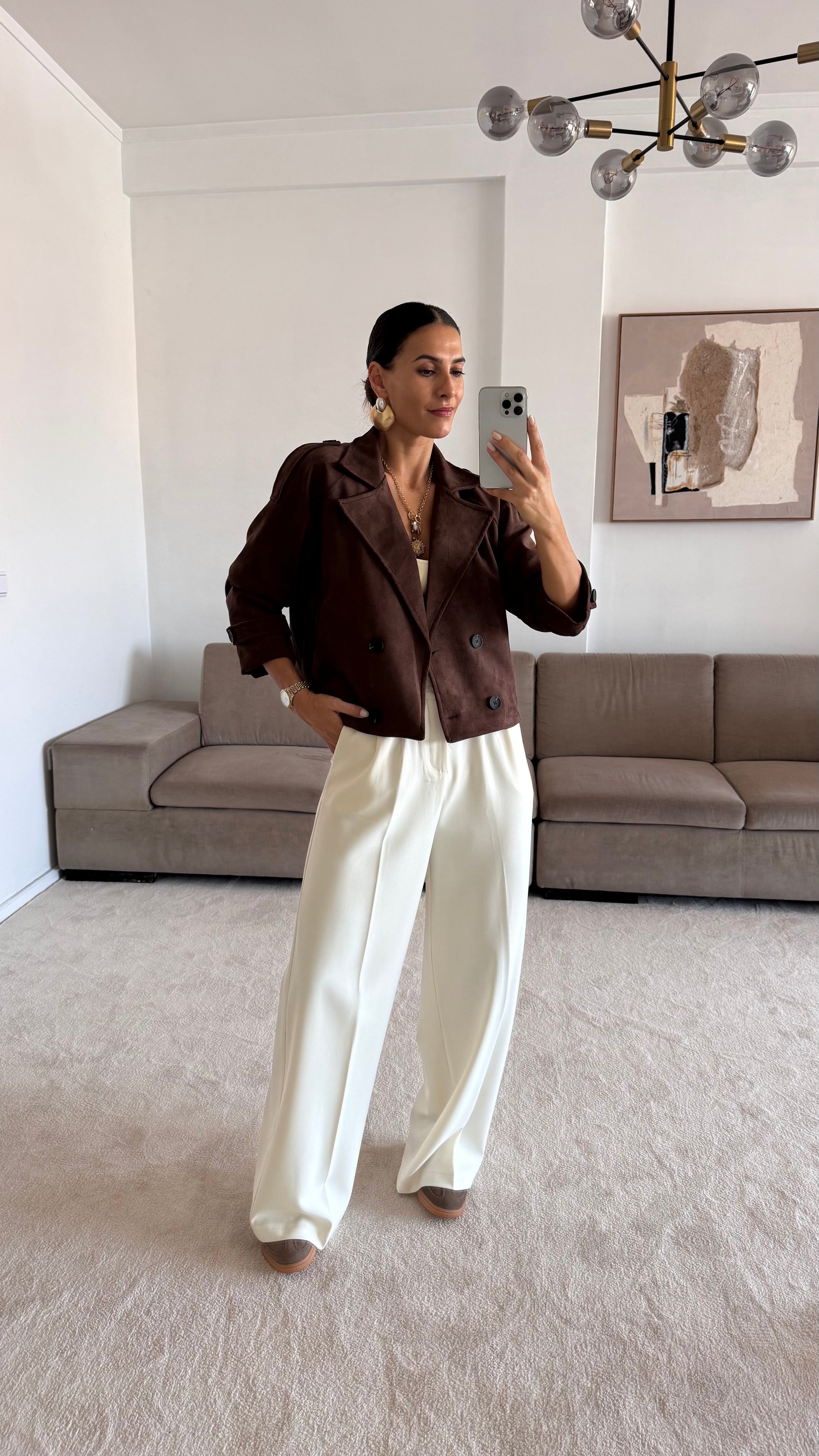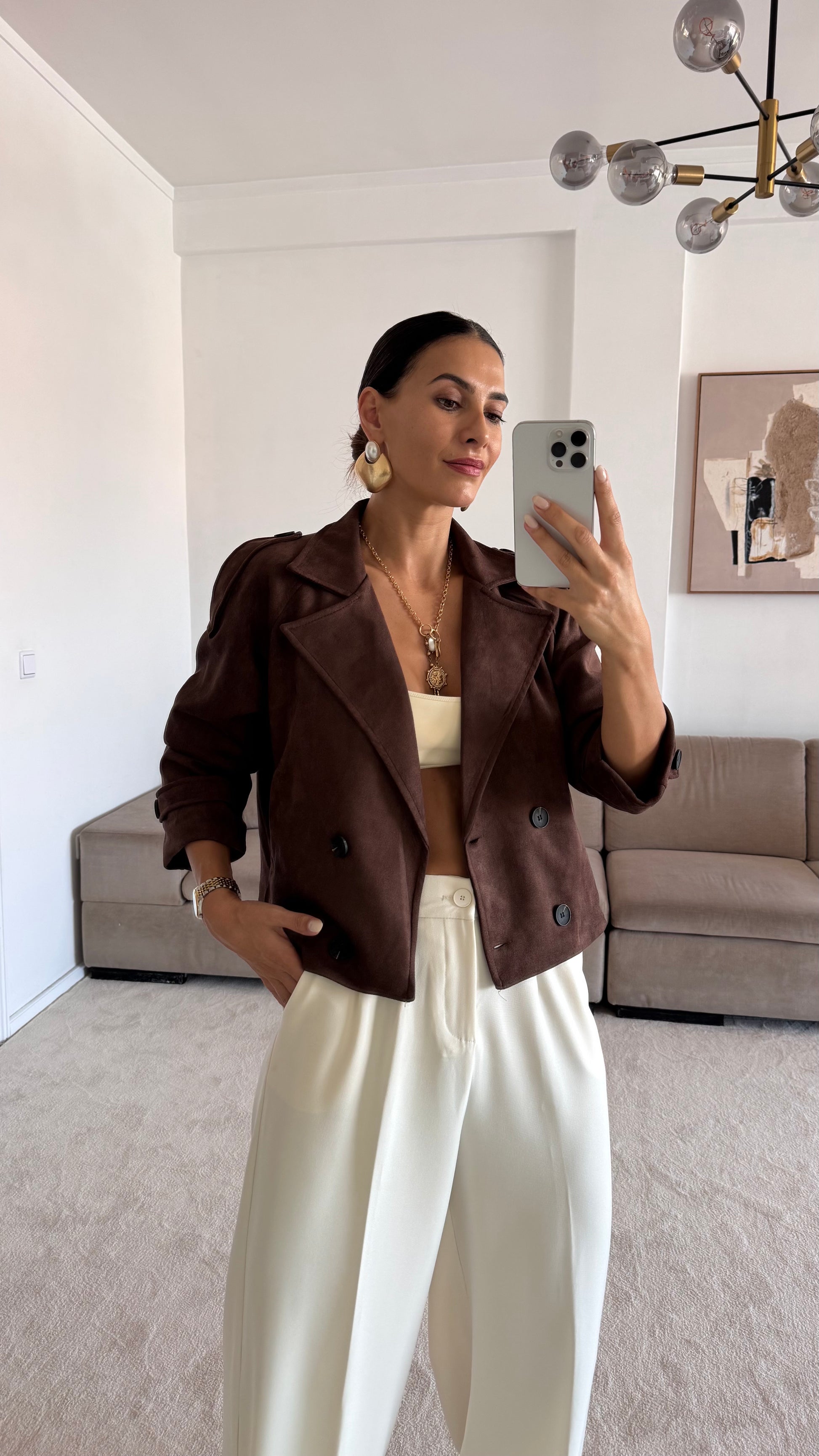 Trench Soho em tecido pele pêssego, a peça tendência que combina elegância e modernidade. Confeccionado em tecido macio com acabamento premium, este casaco curto é forrado e apresenta lapelas largas, fecho em botões duplos e detalhe nos ombros que reforça a sua estrutura elegante.