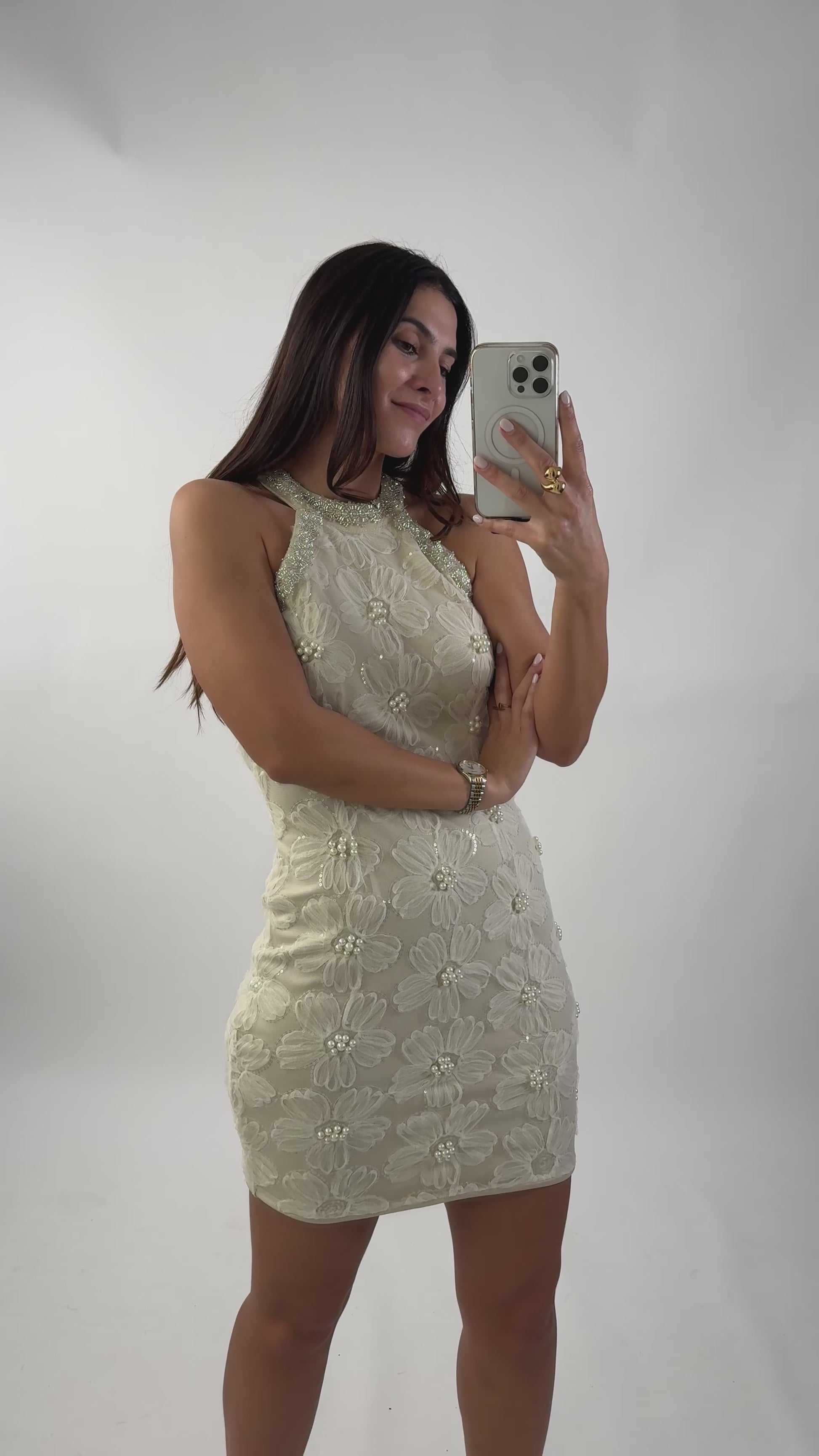 Vestido em tule forrado com decote halter. Aperta com fecho atrás. Todo em detalhes de flores em tule e pérolas. Tem missangas a acompanhar o decote do vestido.