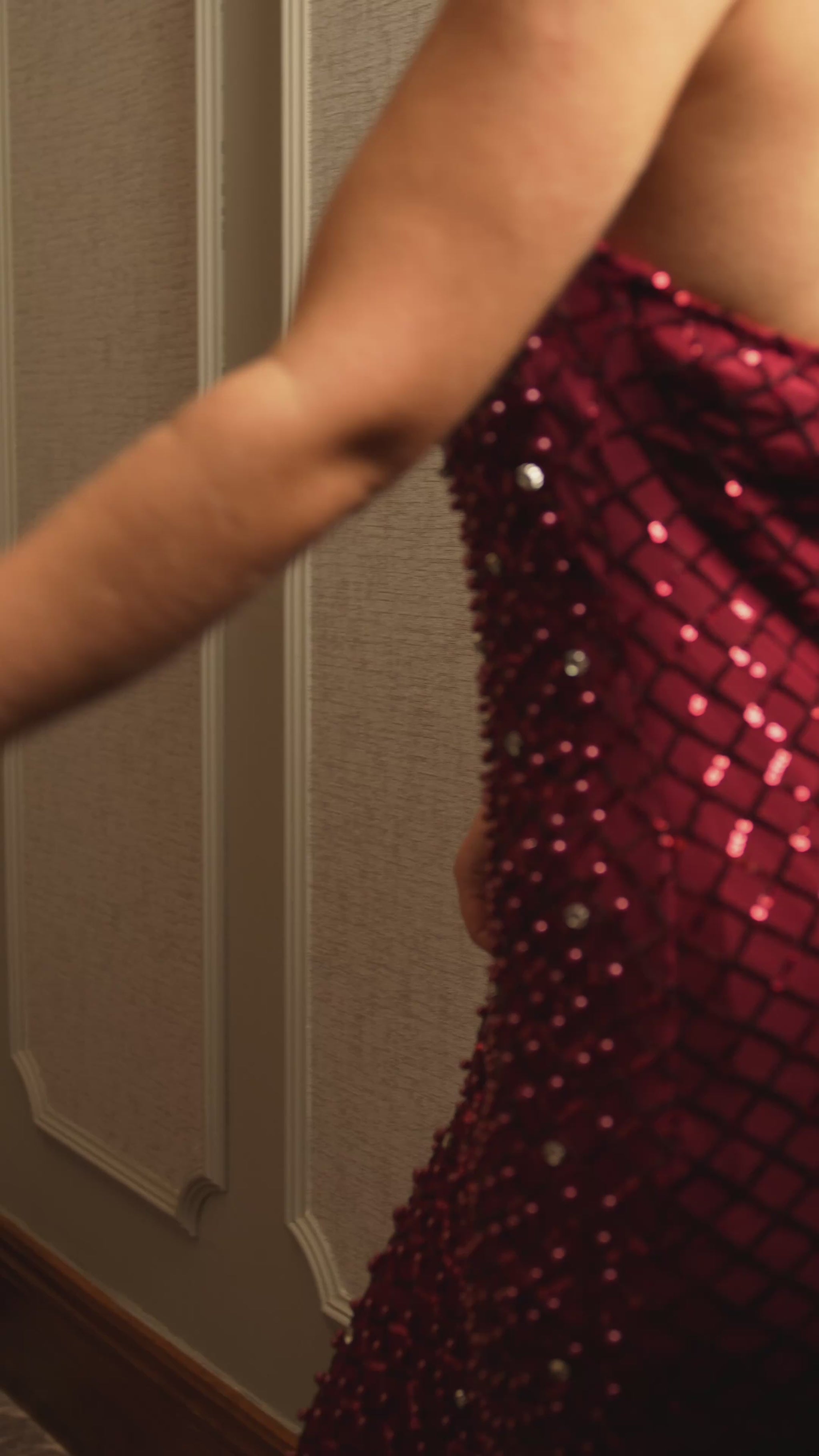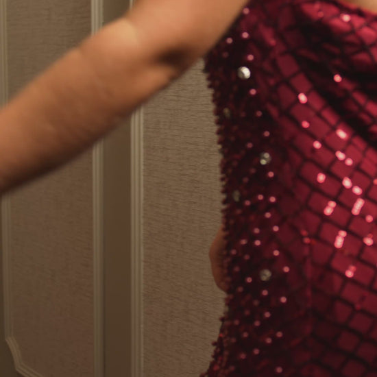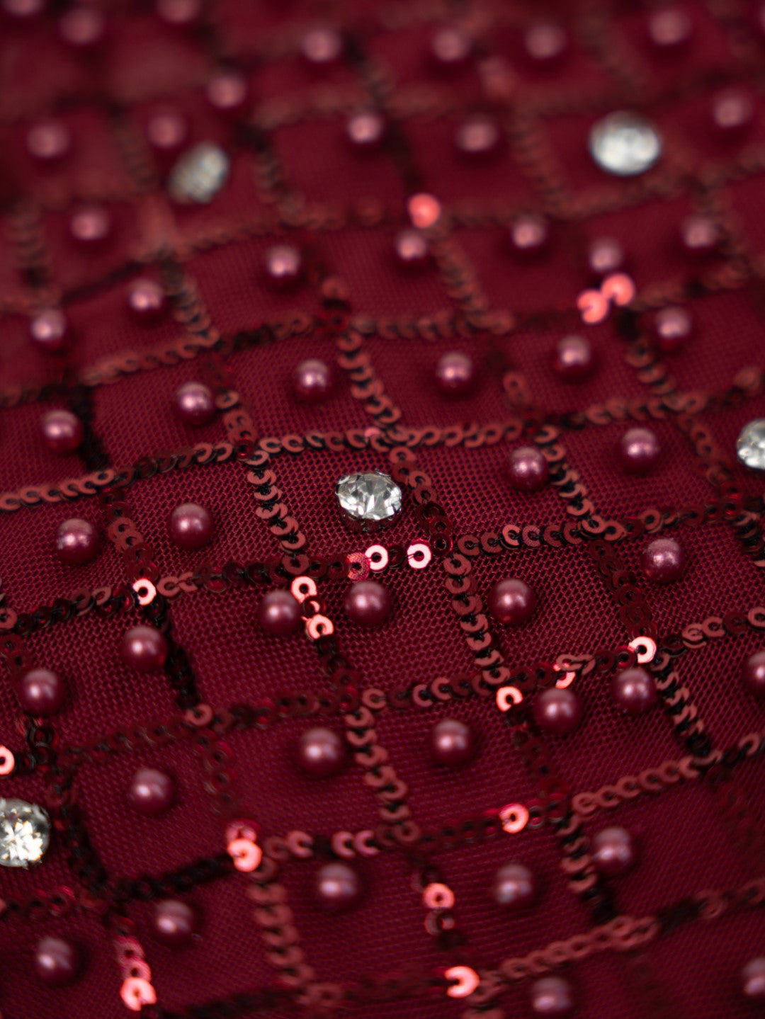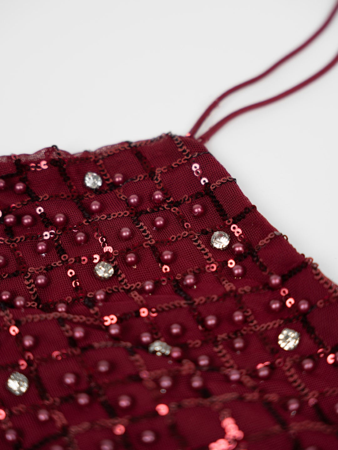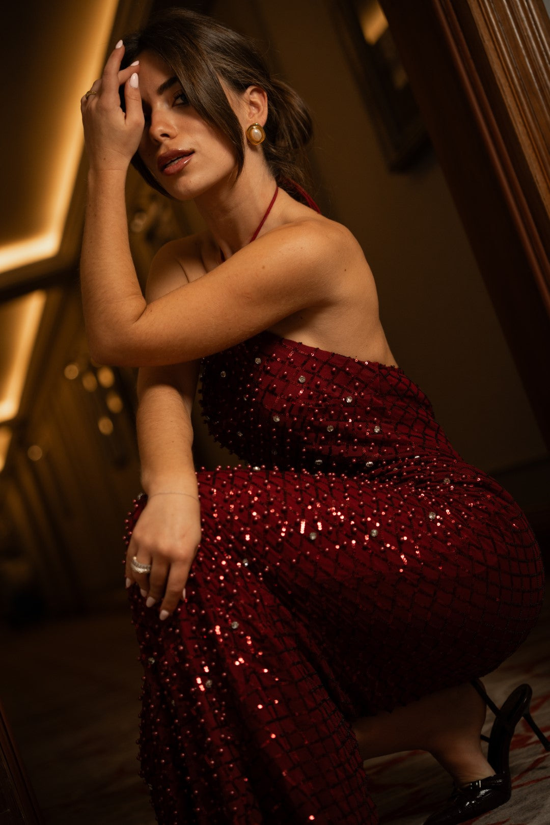 Vestido comprido com detalhe pérolas em Bordeaux. Tem decote halter, aperta com fio atrás do pescoço, tem costas abertas, fecha com fecho zíper invisível atrás. Todo forrado.
