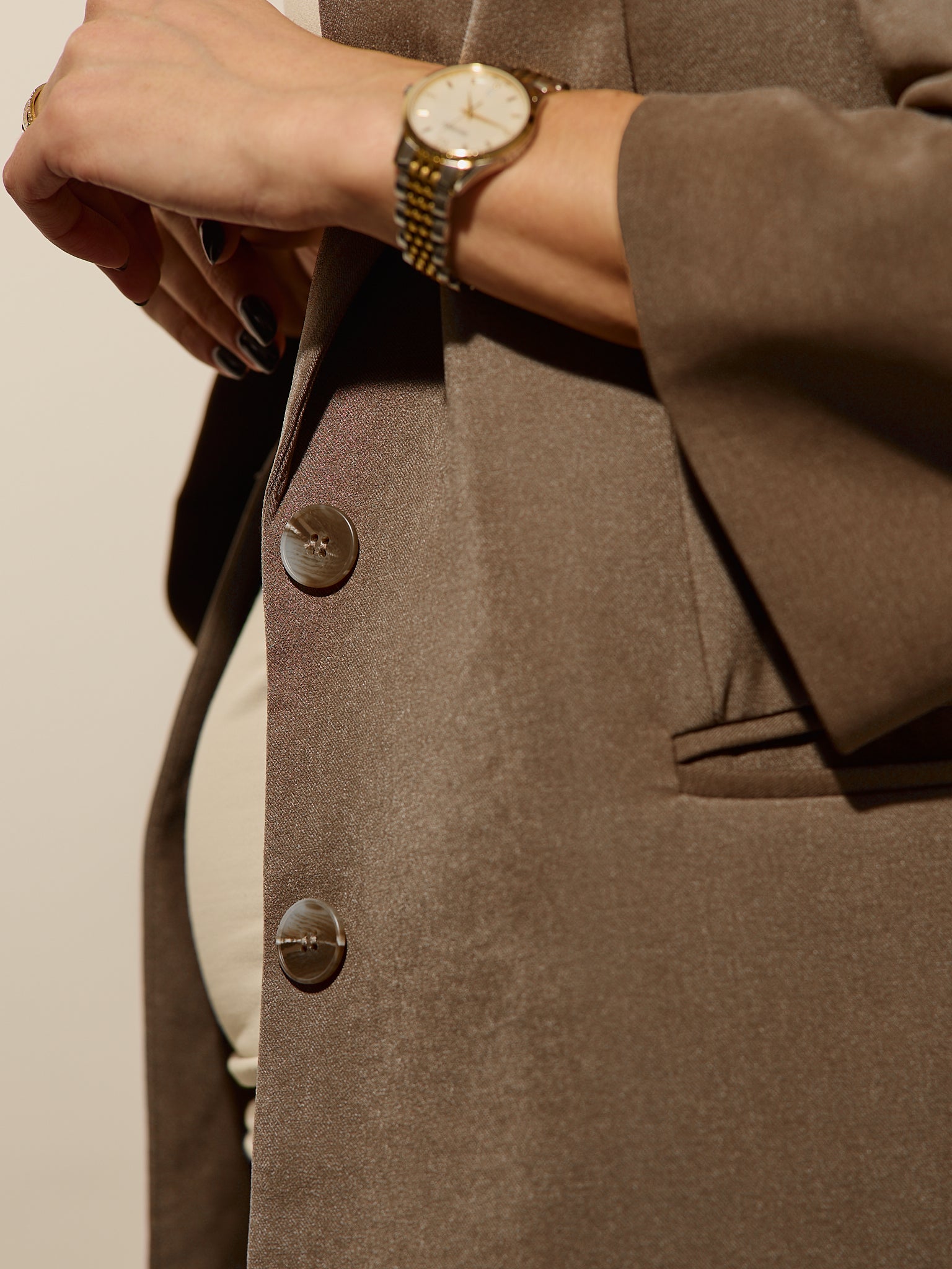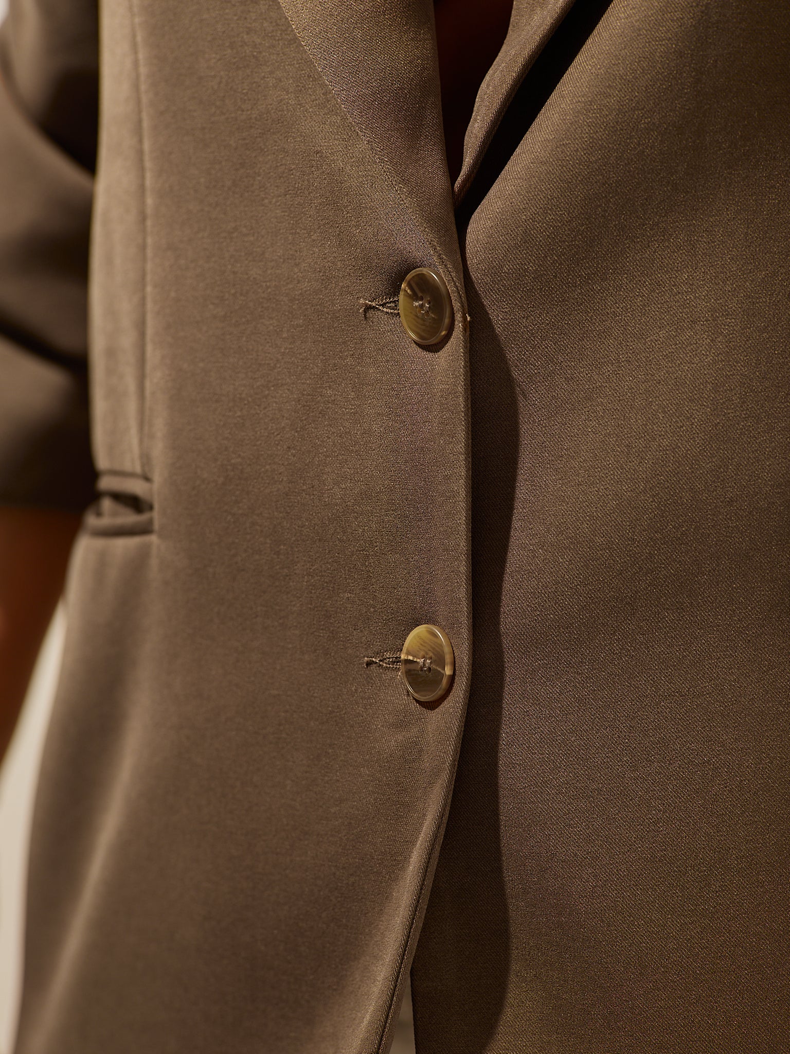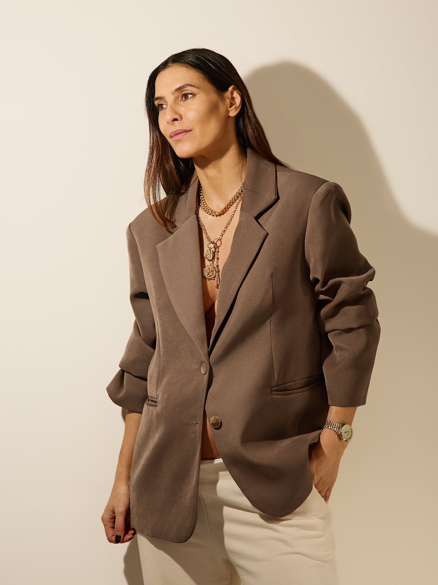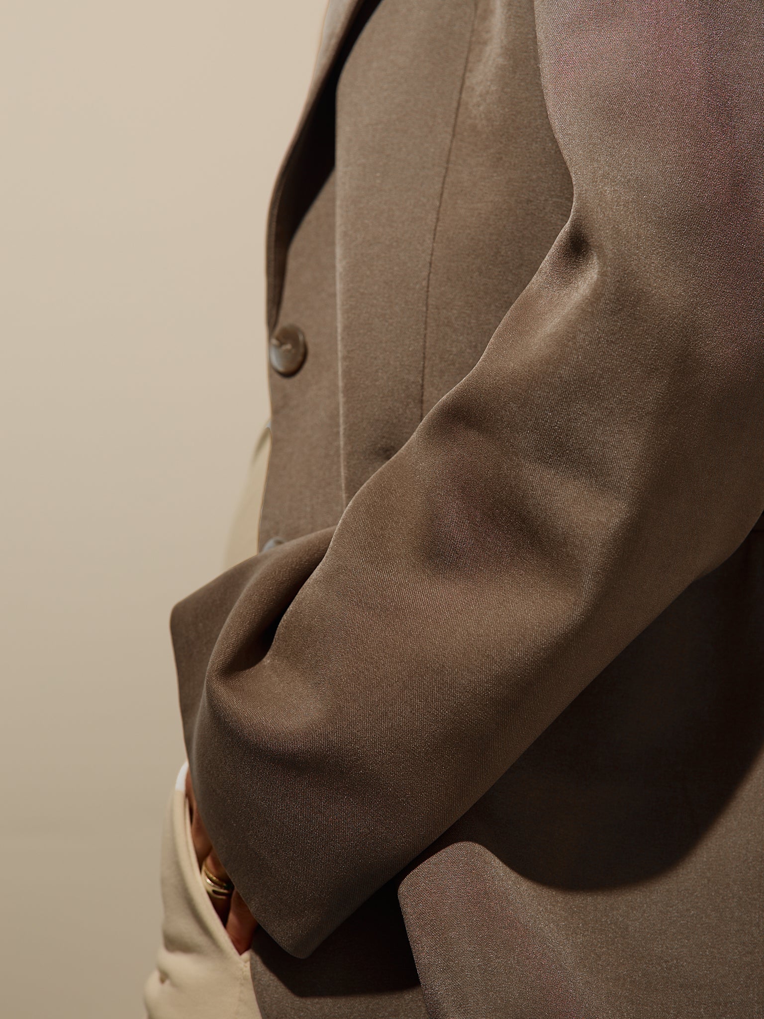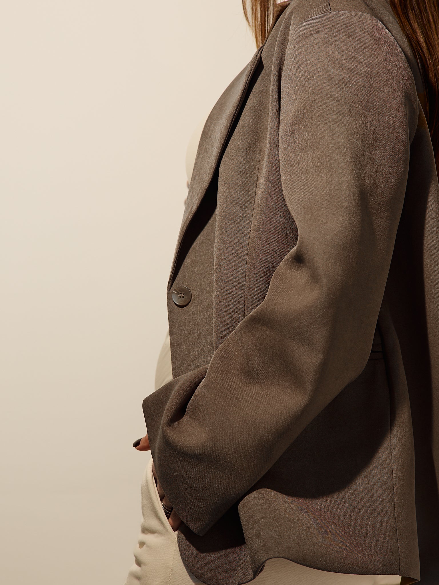 Піджак оверсайз кольору «Іриска» має вільний, структурований крій. Повністю на підкладці та з непомітними кишенями. Застібається на два ґудзики.