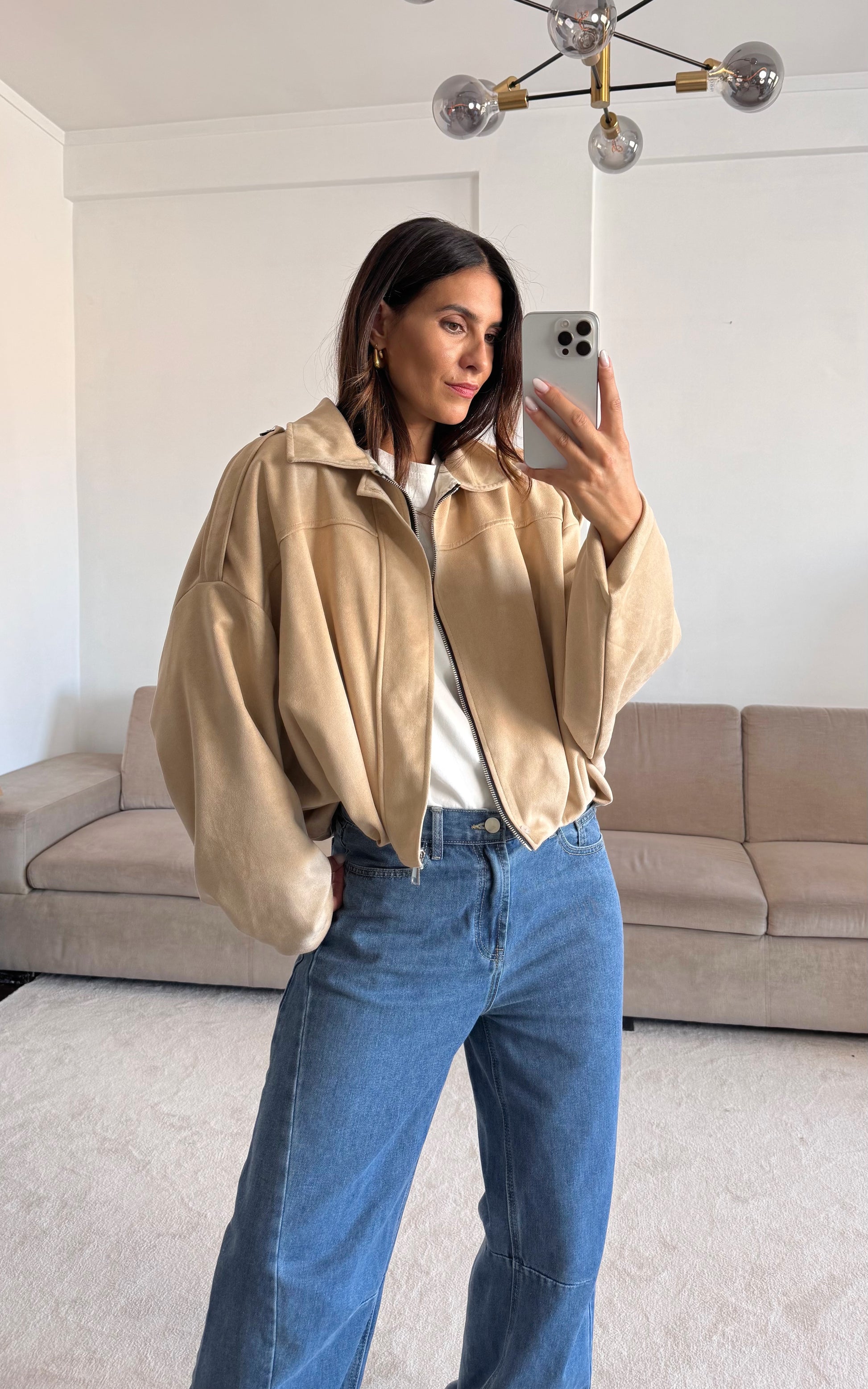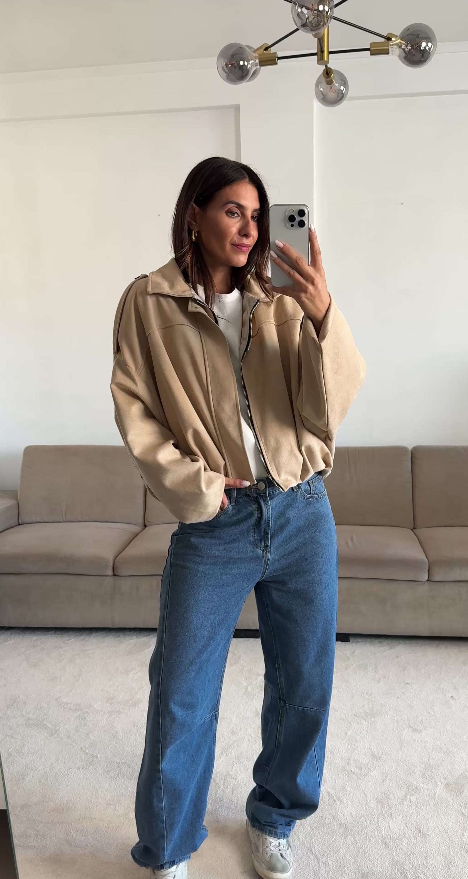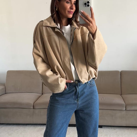 Завдяки короткому крою оверсайз, широким рукавам та застібці на блискавку спереду, це ідеальний виріб, який доповнить будь-який повсякденний образ. Матове покриття, що імітує замшу, додає вишуканості та сучасності, роблячи його універсальним як для повсякденного носіння, так і для більш міських вечірніх образів.