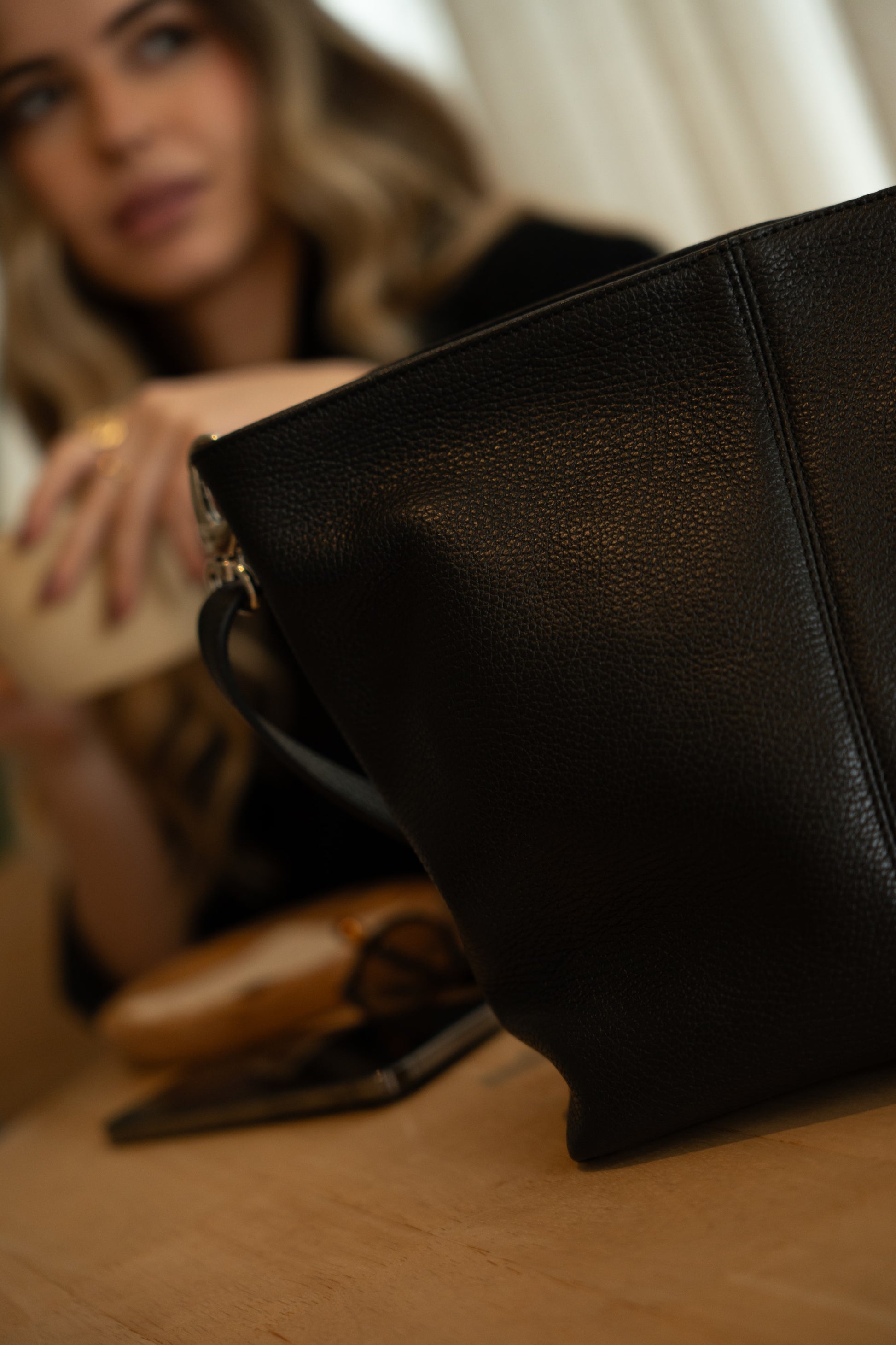 Проста чорна сумка на блискавці. Детальна прострочка. Підкладка та внутрішня кишеня. Бічні відділення, одне з кишенею на блискавці, а інше з невеликою шкіряною кишенею. Основна застібка на блискавку. У комплекті регульований та знімний плечовий ремінь.