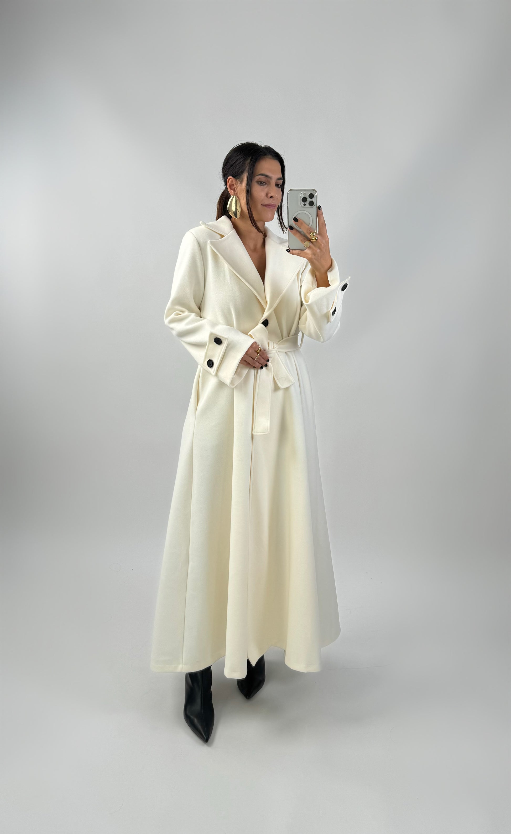 THE Розкльошене пальто Це елегантний та універсальний виріб, ідеальний для доповнення вашого осінньо-зимового гардеробу. Це довге пальто має розкльошений крій для плавного, жіночного крою. Воно застібається на центральну гудзик і має регульований ремінь, що забезпечує персоналізовану та вишукану посадку. Завдяки функціональним кишеням та манжетам на двох ґудзиках, це пальто ідеально підходить для офіційних випадків або для покращення вашого повсякденного образу.