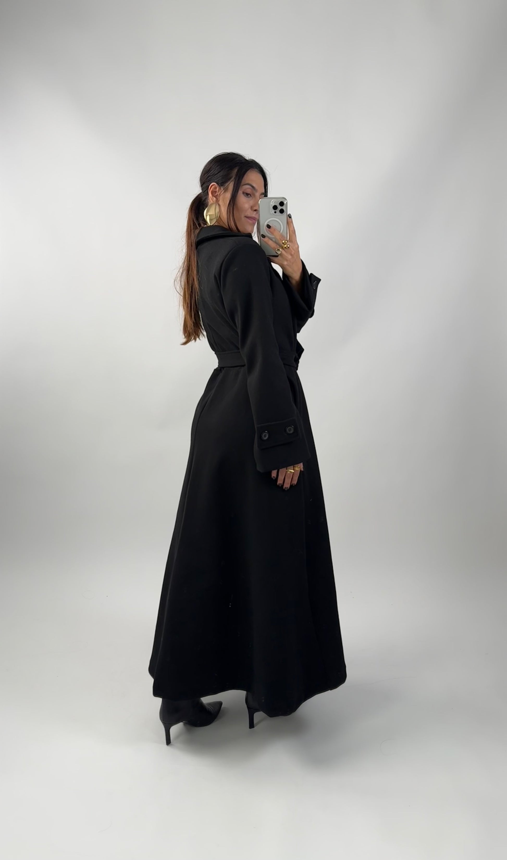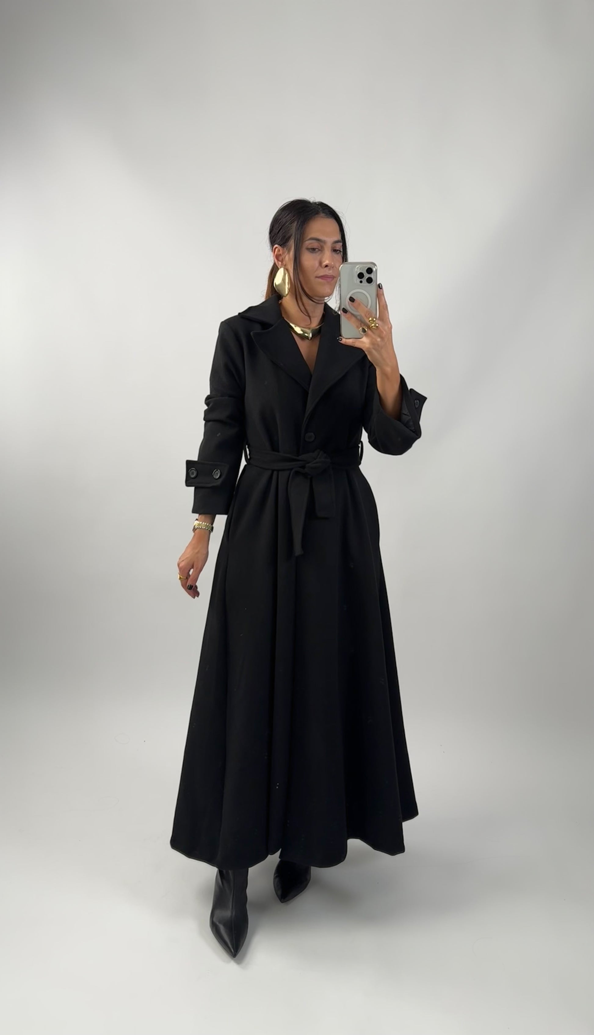 THE Розкльошене пальто Це елегантний та універсальний виріб, ідеальний для доповнення вашого осінньо-зимового гардеробу. Це довге пальто має розкльошений крій для плавного, жіночного крою. Воно застібається на центральну гудзик і має регульований ремінь, що забезпечує персоналізовану та вишукану посадку. Завдяки функціональним кишеням та манжетам на двох ґудзиках, це пальто ідеально підходить для офіційних випадків або для покращення вашого повсякденного образу.