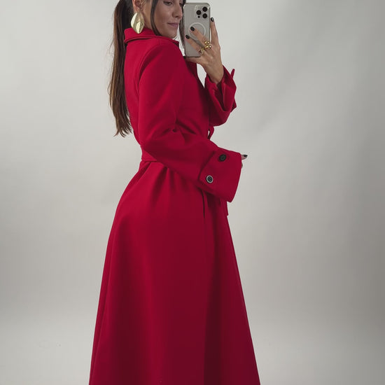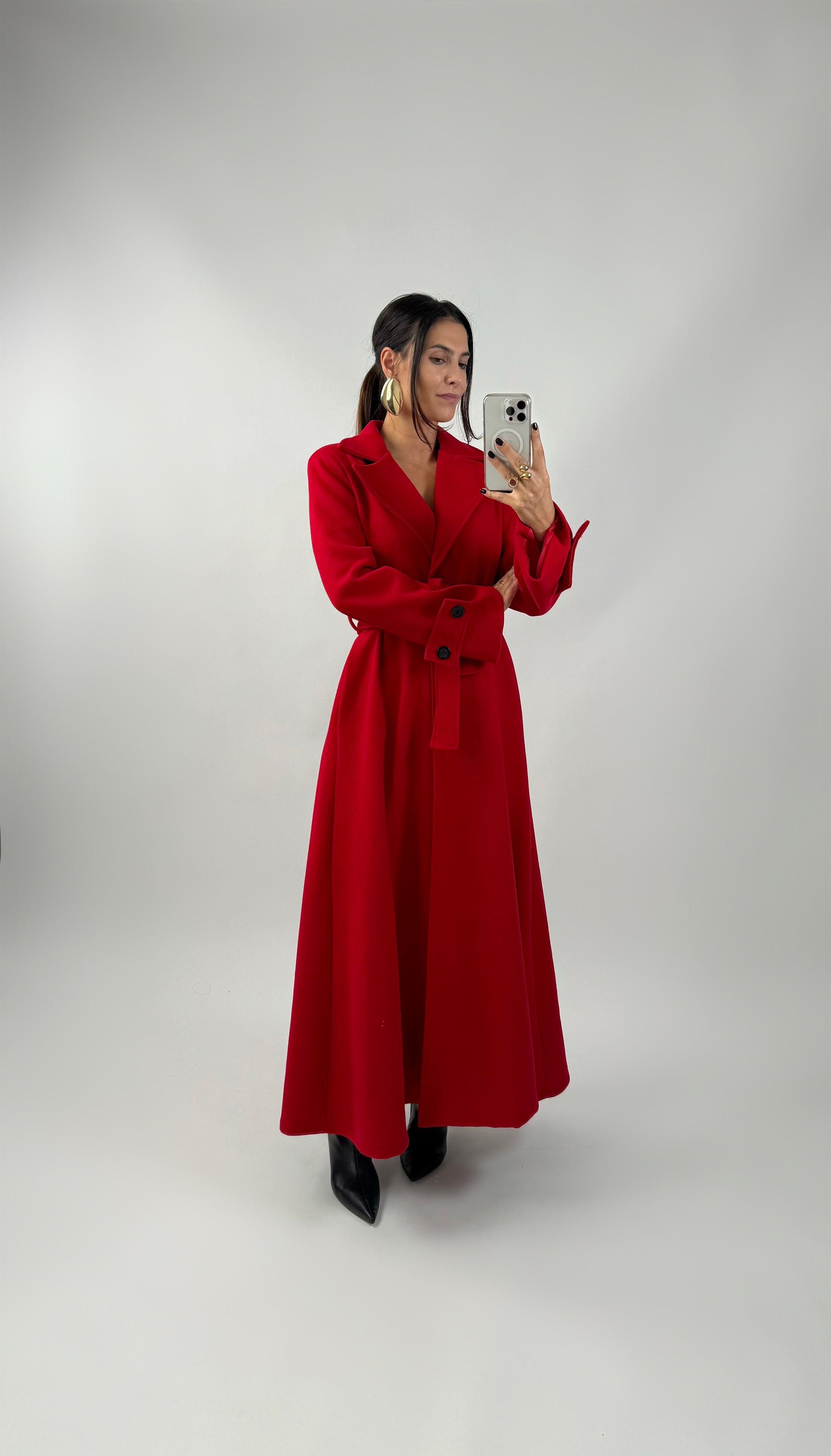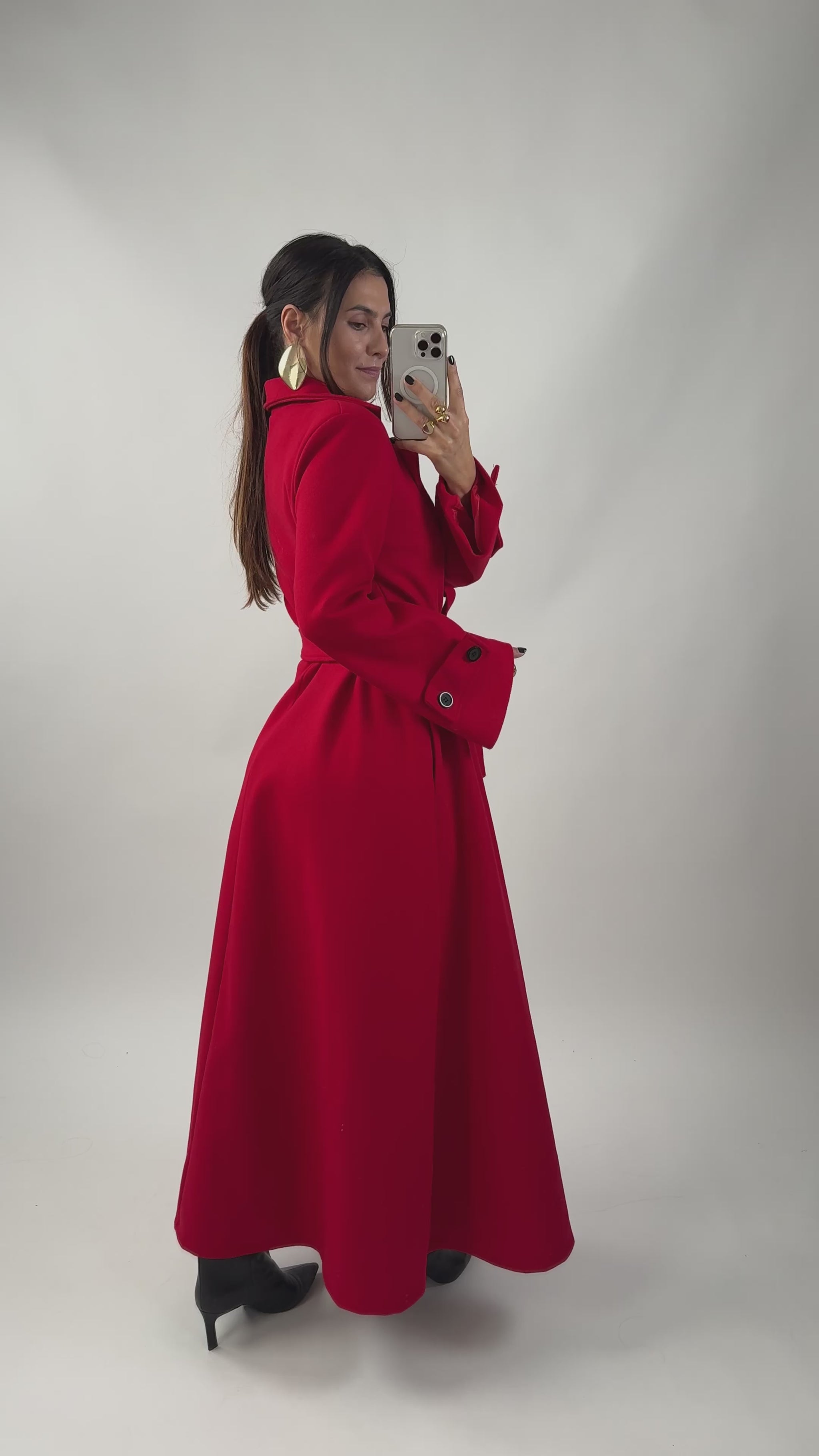 THE Розкльошене пальто Це елегантний та універсальний виріб, ідеальний для доповнення вашого осінньо-зимового гардеробу. Це довге пальто має розкльошений крій для плавного, жіночного крою. Воно застібається на центральну гудзик і має регульований ремінь, що забезпечує персоналізовану та вишукану посадку. Завдяки функціональним кишеням та манжетам на двох ґудзиках, це пальто ідеально підходить для офіційних випадків або для покращення вашого повсякденного образу.