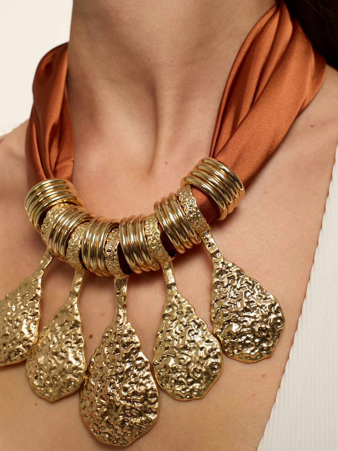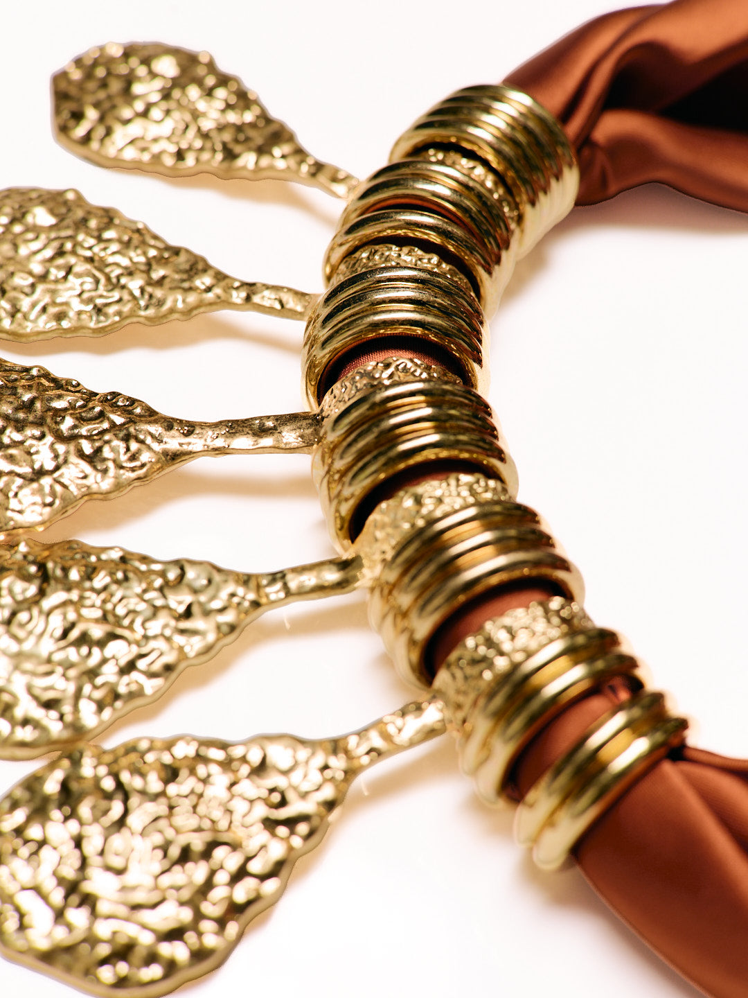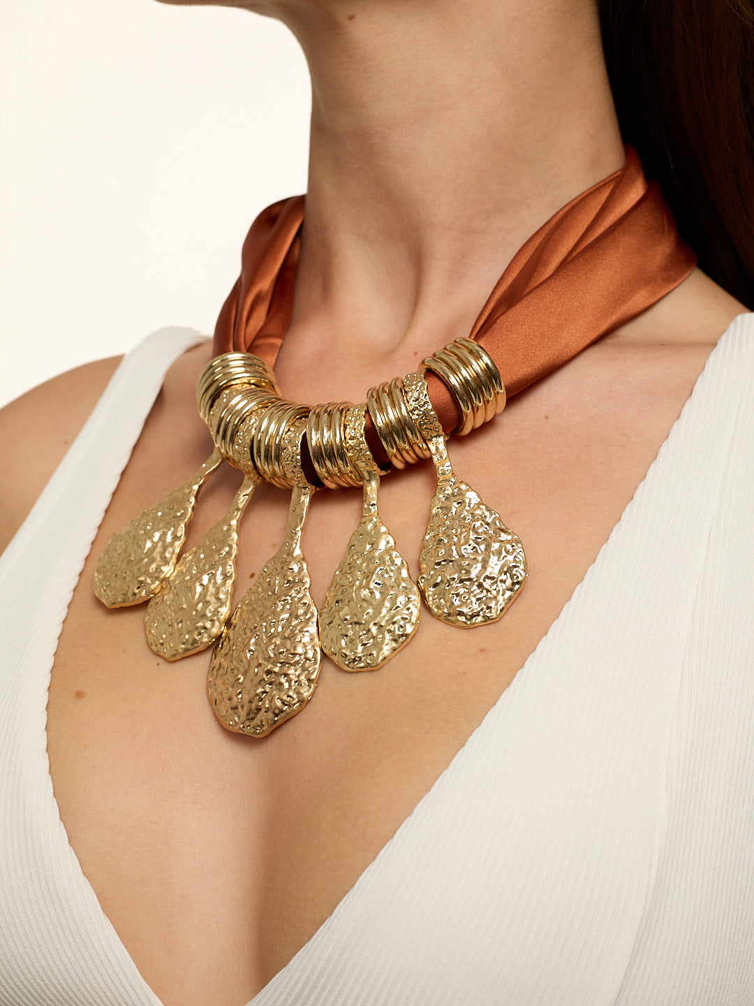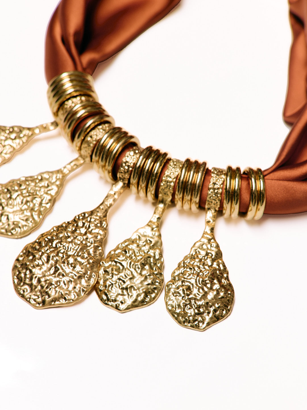 Colar confecionado em tecido de acabamento acetinado num tom terracota profundo. O design destaca-se pelo detalhe de anéis metálicos dourados e medalhas pendentes com textura irregular de efeito orgânico.