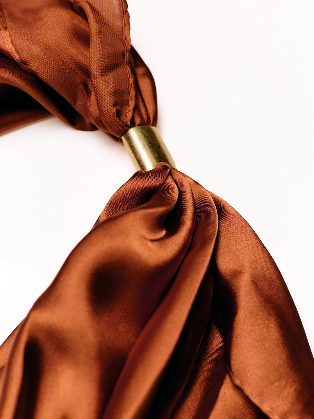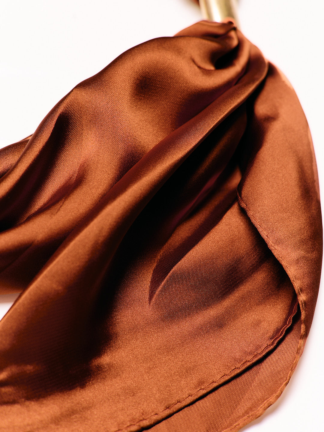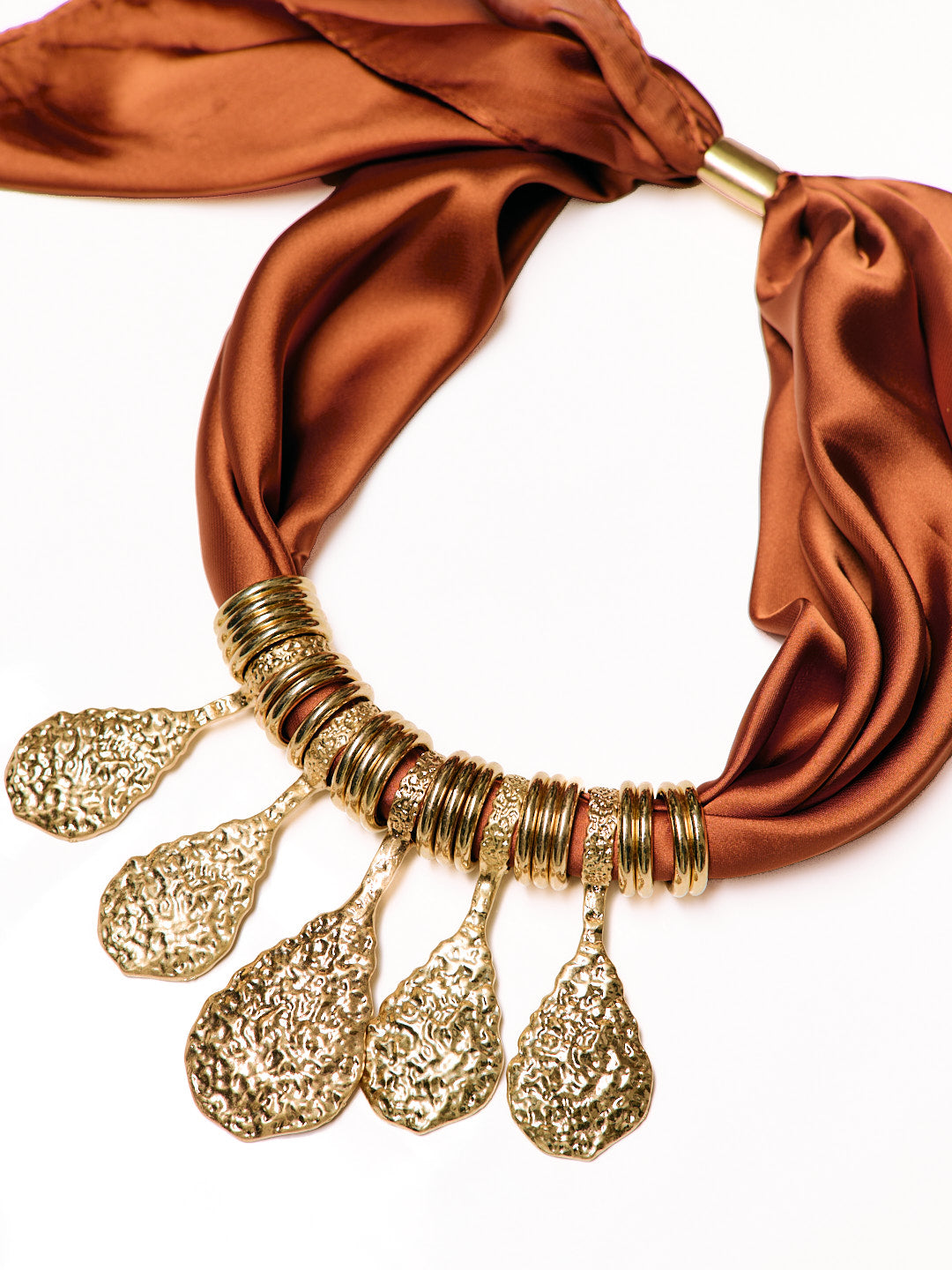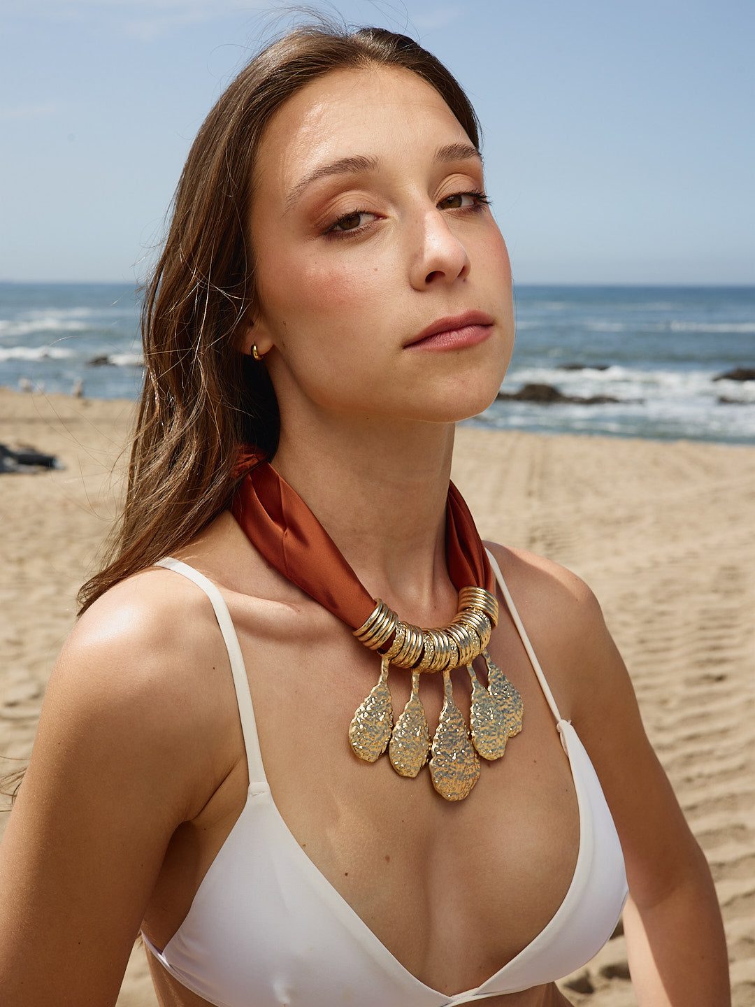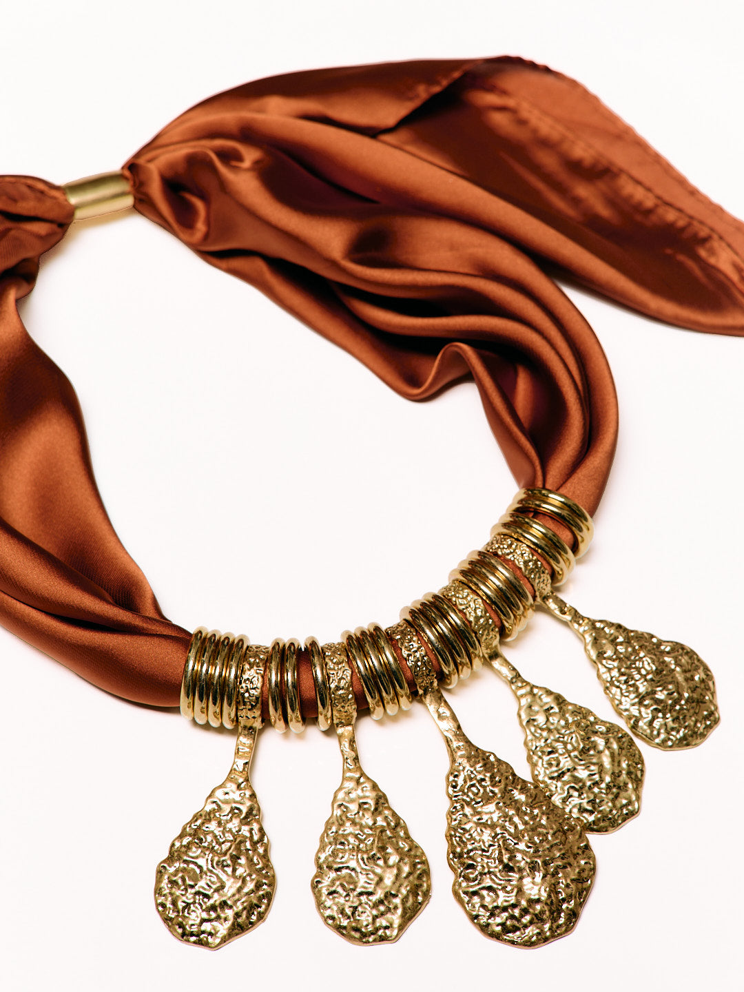 Colar confecionado em tecido de acabamento acetinado num tom terracota profundo. O design destaca-se pelo detalhe de anéis metálicos dourados e medalhas pendentes com textura irregular de efeito orgânico.