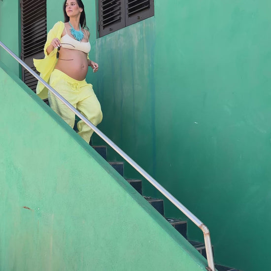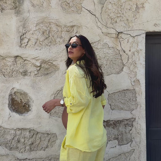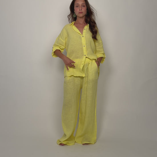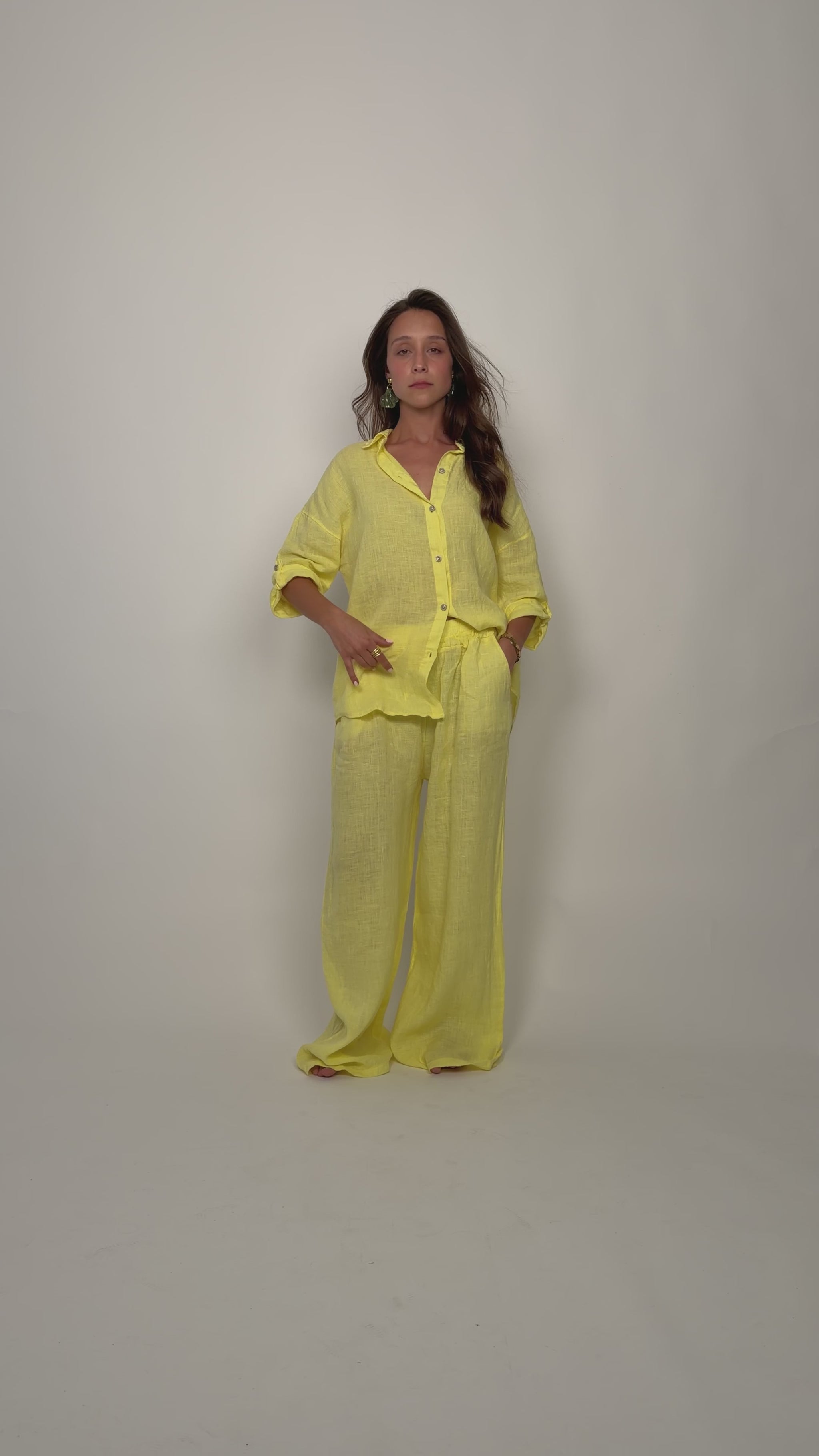 Conjunto Camisa e Calças Linho em amarelo. Camisa aperta com botões e tem detalhe para apertar com botão em manga 2/3. Tecido em linho leve e fluído. Calças com elástico na cintura e bolsos. Veste confortavelmente do S ao XL.