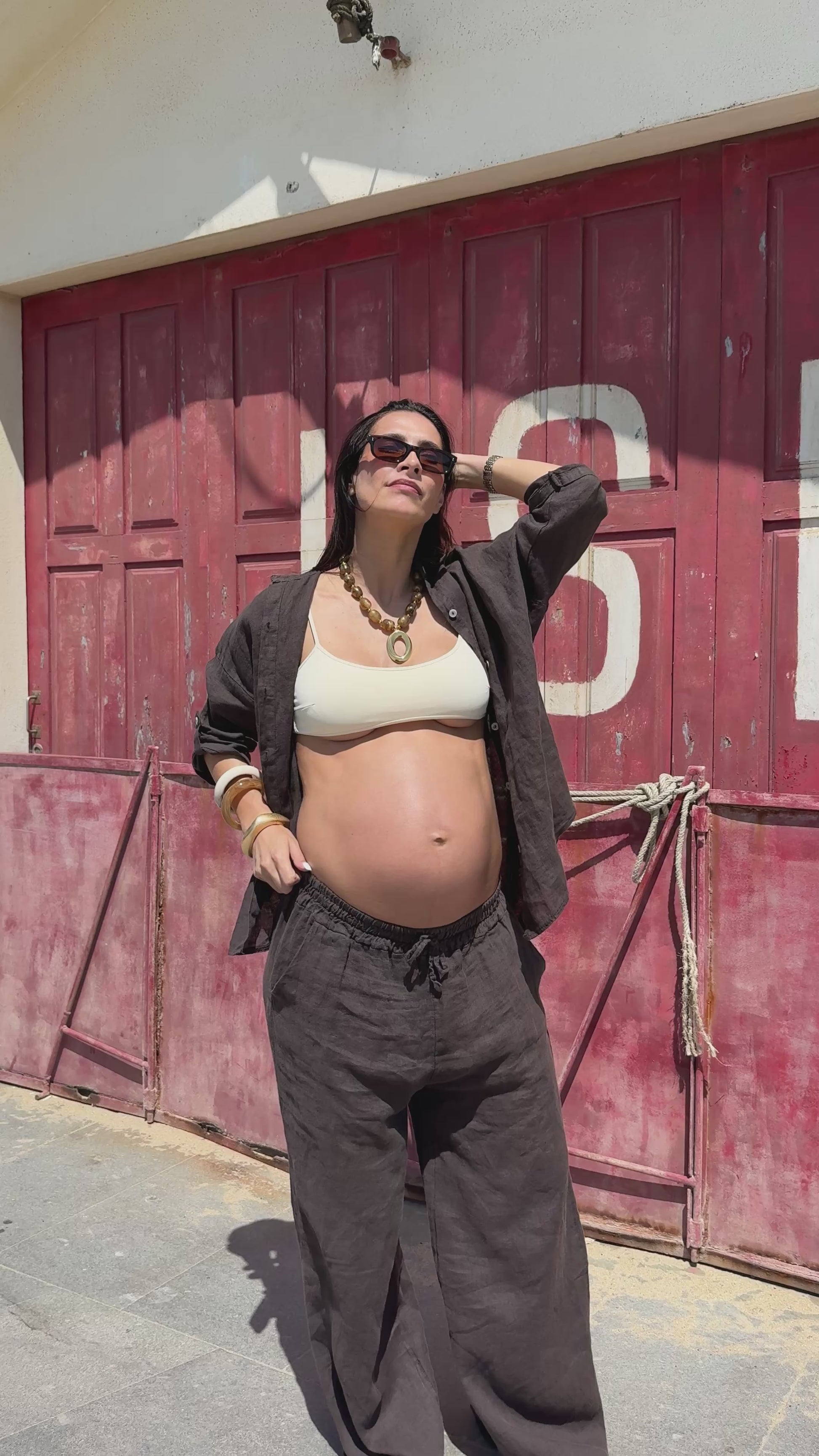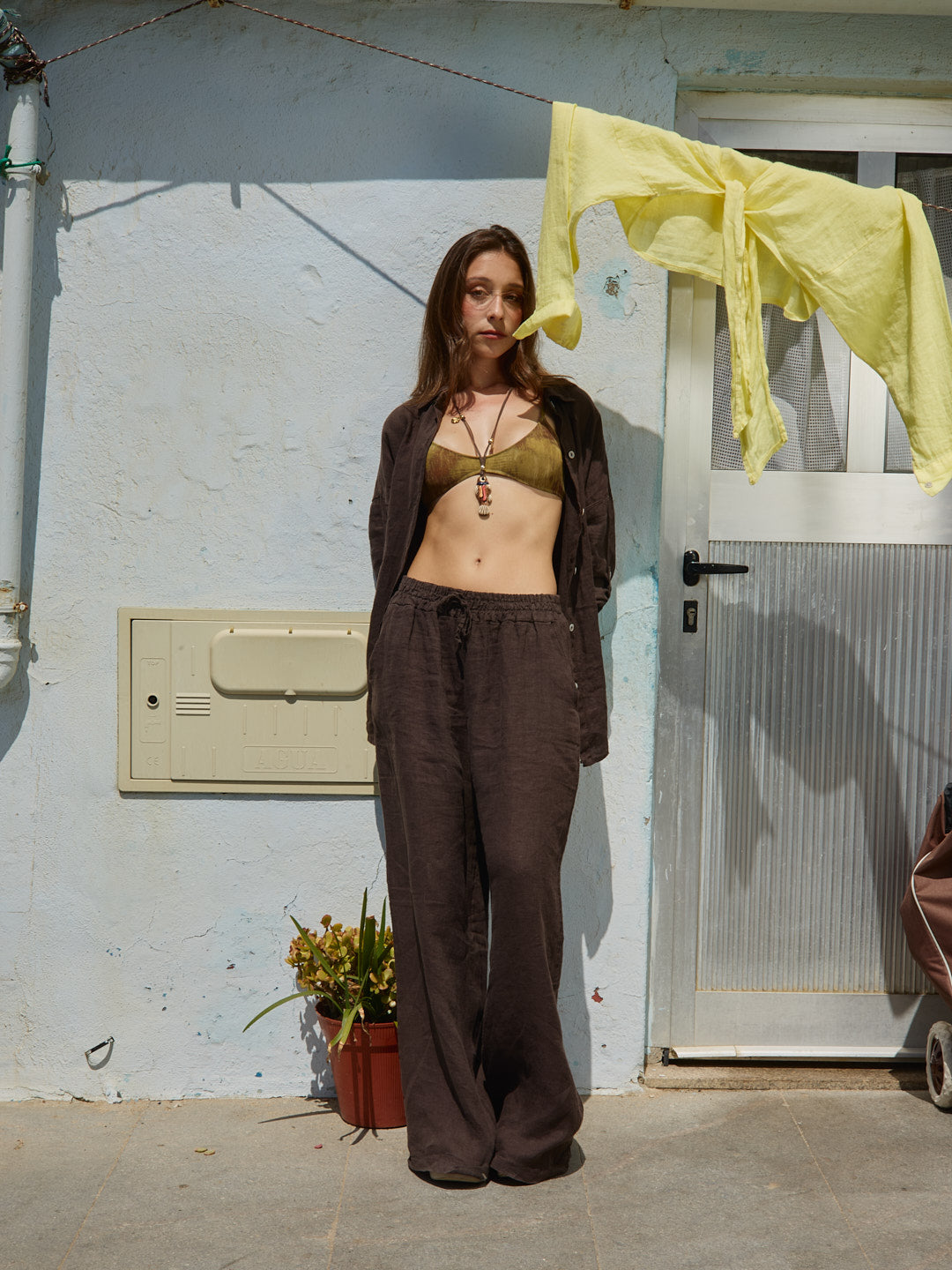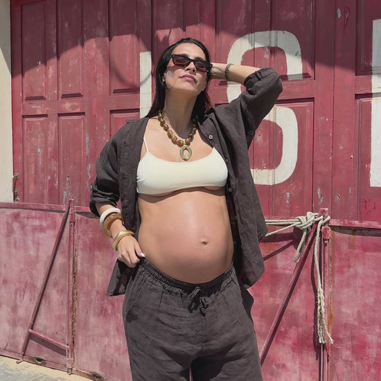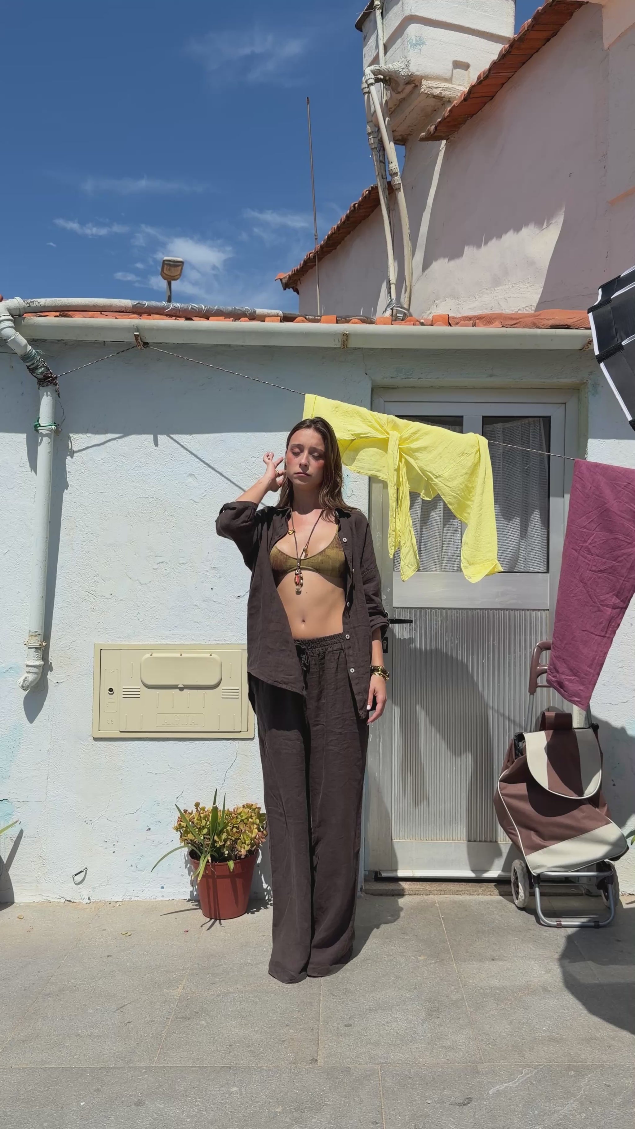 Cada peça em linho é tingida manualmente, tornando cada conjunto único. Pequenas variações de tom entre o top e as calças podem ocorrer naturalmente, refletindo o processo artesanal.